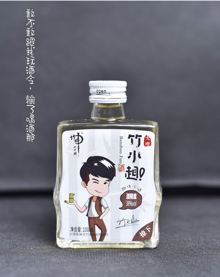 竹小趣酒是一款由大理鼎峰龙竹酒业有限公司在2018年1月开始研发到2019年11月份正式上市的一款时尚、趣味型的竹香型酒。竹小趣酒应用了传统的酿制工艺、发酵工艺,利用当地丰富的粮食农作物资源作为酿制原料,酿制好的基酒通过地窖储存最少3年以上,加上曾今通过竹子二次发酵的竹酒配比30%,最终通过生产线一瓶趣味型小酒就诞生了。