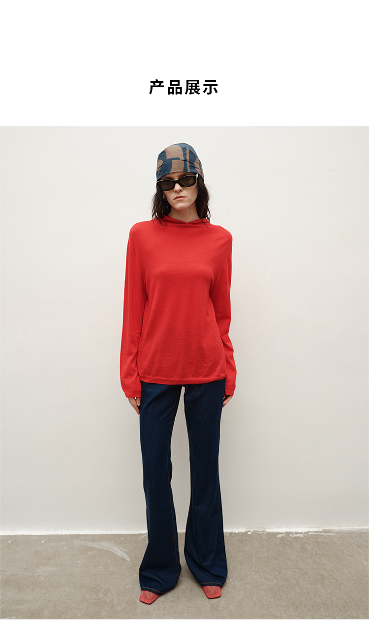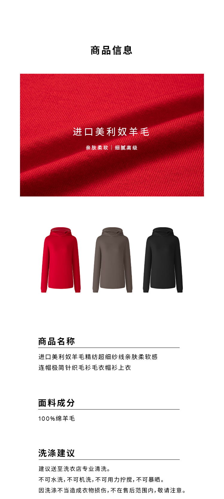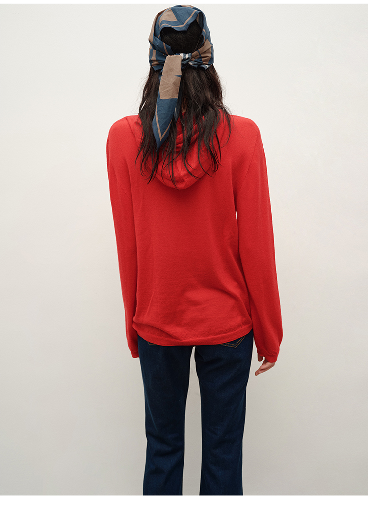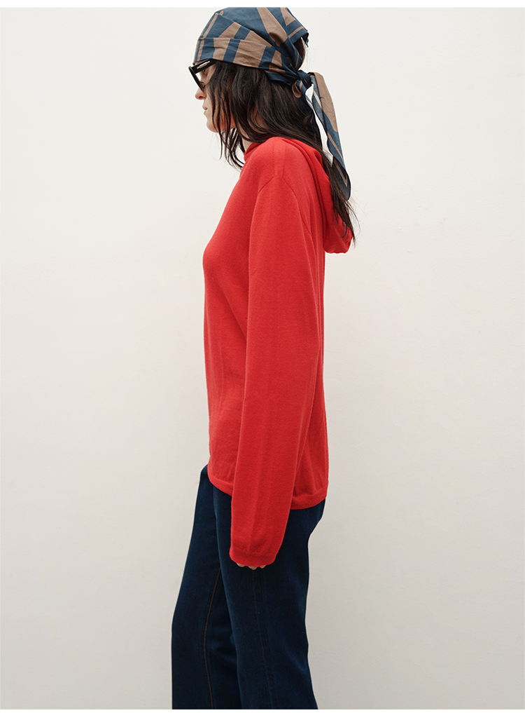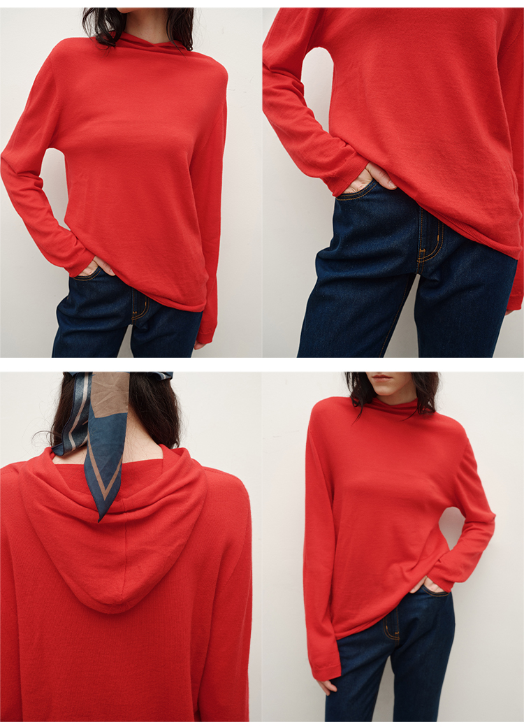 HIDEMI 进口美利奴羊毛精纺超细纱线亲肤柔软感连帽极简针织毛衫毛衣帽衫上衣 马斯正红/巧克力色/黑色