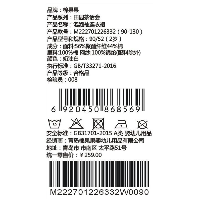 棉果果夏季新品女童巴厘纱泡泡袖连衣裙M222701226332