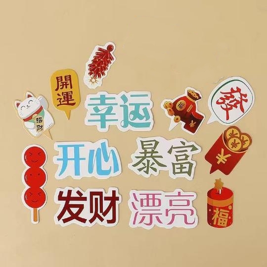 【10张】新年材料包 开心暴富发财漂亮开心幸运红包招财猫鞭炮插卡插件