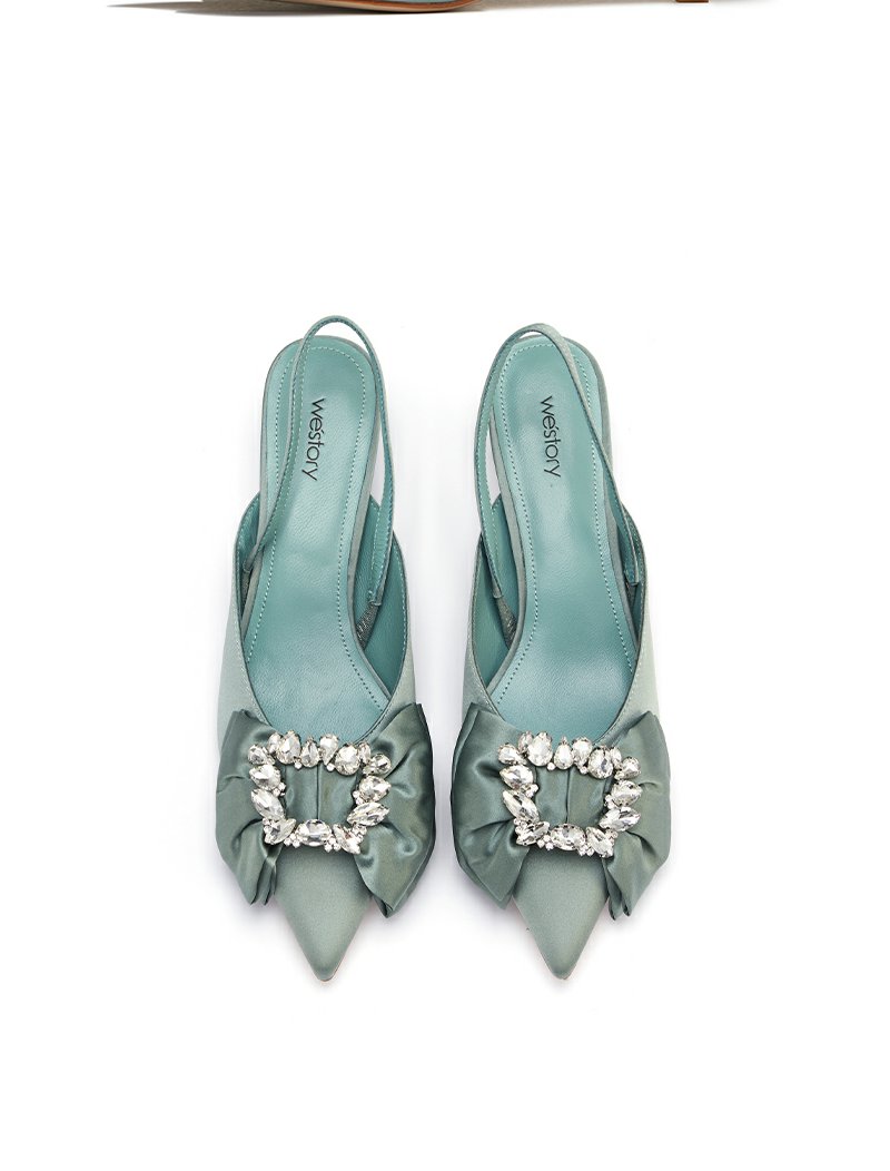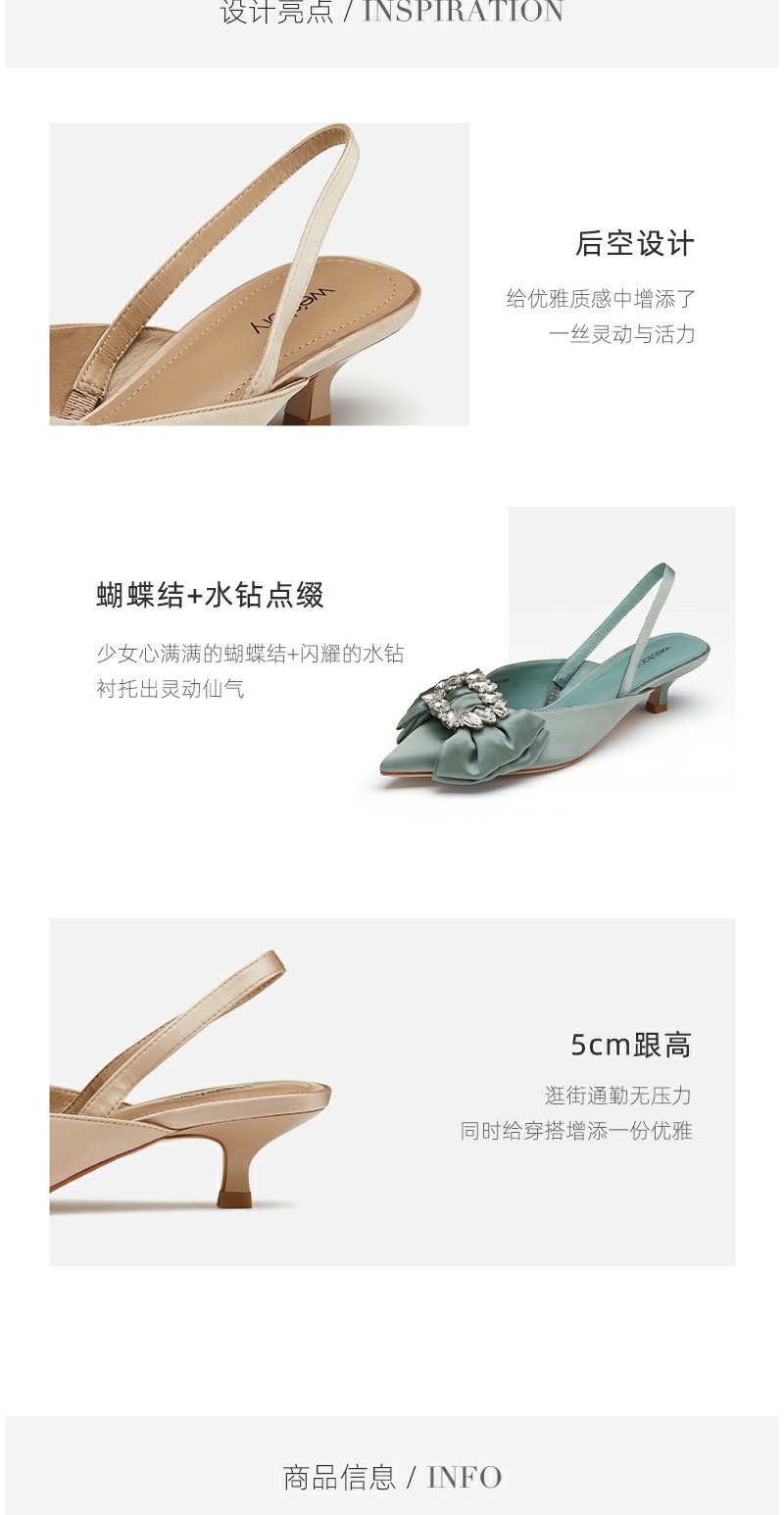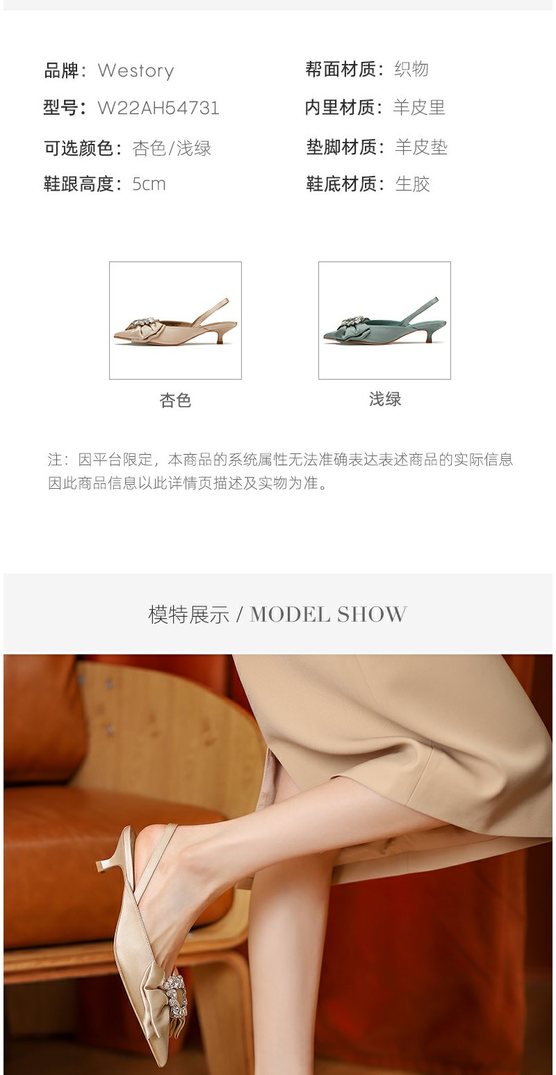 westory2022年夏蝴蝶结水钻尖头中细跟后空法式单鞋凉鞋女W22AH54731