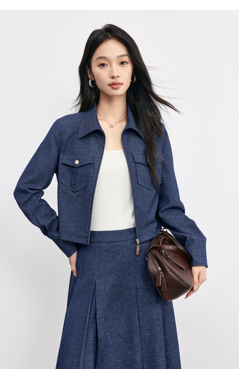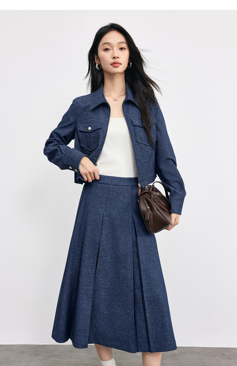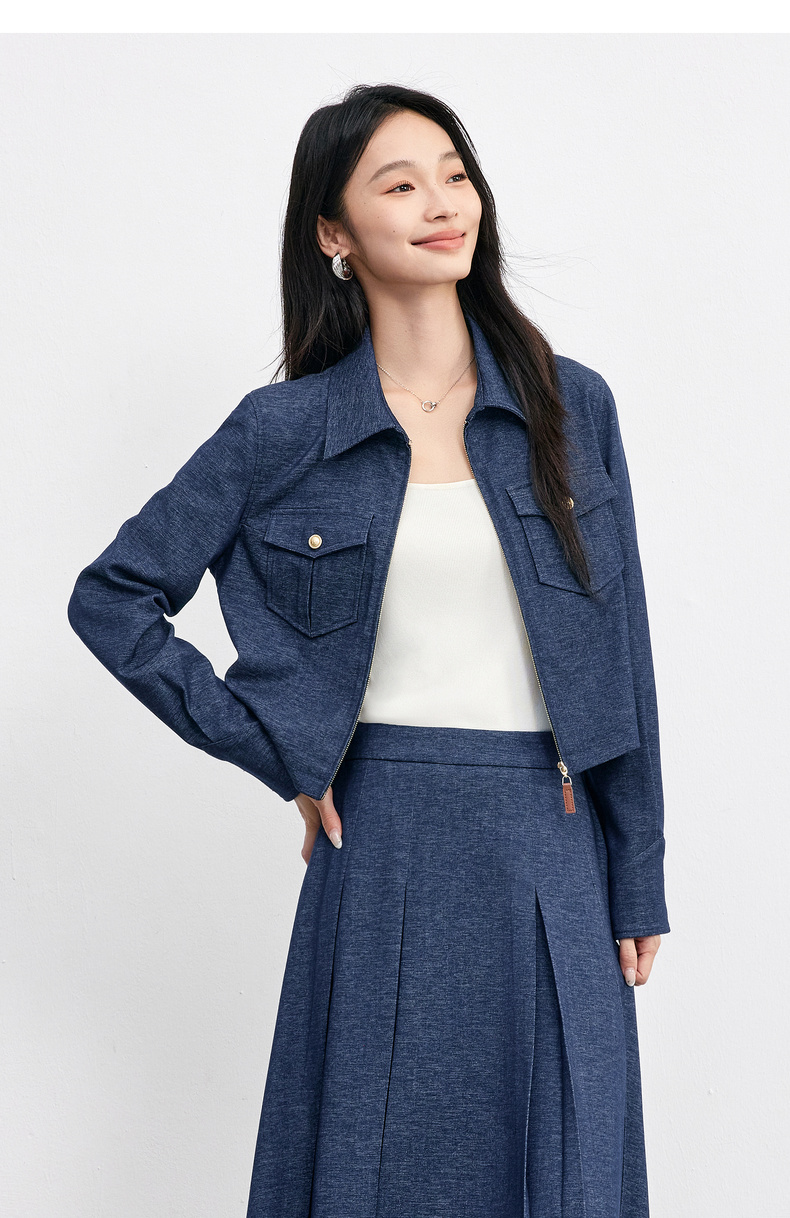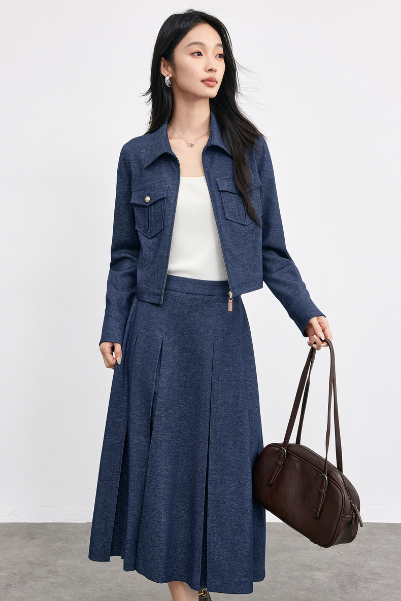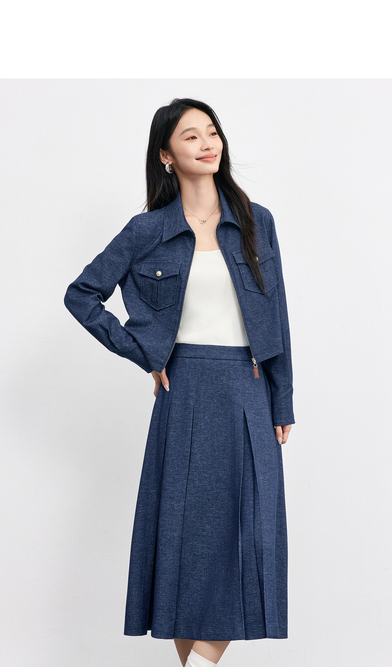 【内购】【免搭配花纱套装】简约休闲通勤皮质拉链开衫高腰百褶半裙套装-153ZA2566