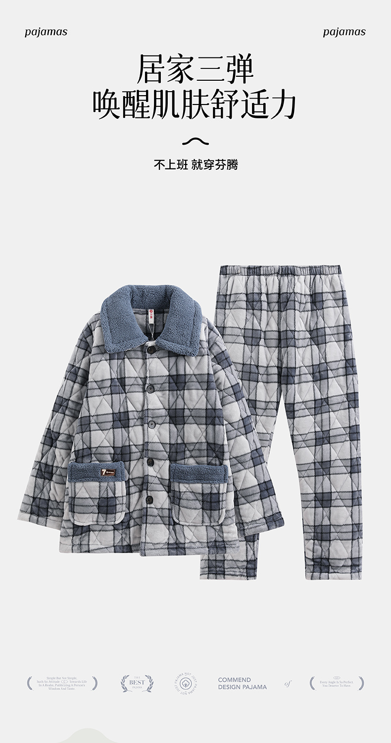 芬腾睡衣男冬季三层夹棉加厚加绒保暖男士青年冬天棉袄家居服套装
