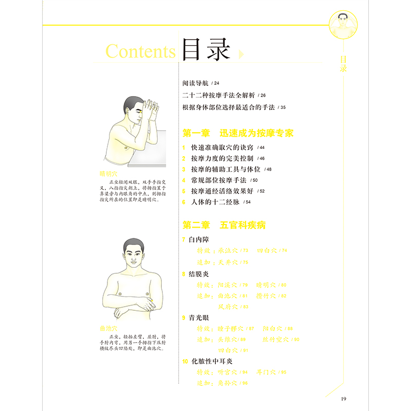阅读导航 / 24二十二种按摩手法全解析 / 26根据身体部位选择适合的手法 / 35章 迅速成为按摩专家1 快 速准确取穴的诀窍 / 442 按 摩力度的完美控制 / 463 按 摩的辅助工具与体位 / 484 常 规部位按摩手法 / 505 按 摩通经活络效果好 / 526 人 体的十二经脉 / 54第二章 五官科疾病7 白内障:承泣穴/ 73 四白穴/ 74追加:天井穴/ 758 结膜炎:阳溪穴 / 79 睛明穴 / 80追加:曲池穴 / 81 攒竹穴 / 82风府穴 / 839 青光眼:瞳子穴 / 87 阳白穴 / 88追加:头维穴/ 89 丝竹空穴 / 90四白穴 / 9110 化脓性中耳炎:听宫穴 / 94 耳门穴 / 95追加:角孙穴 / 9611 外耳道疖肿:商阳穴 / 99 下关穴 / 100追加:颅息穴 / 101 少泽穴 / 102支沟穴 / 10312 鼻炎:迎香穴 / 107 风池穴 / 108追加:神庭穴 / 109 列缺穴 / 110曲差穴 / 11113 喉炎:中渚穴 / 115 足窍阴穴 / 116追加:鱼际穴 / 117 涌泉穴 / 118阳池穴 / 11914 慢性单纯性咽炎:孔穴 / 122 经渠穴 / 123追加:人迎穴 / 124 太渊穴 / 125少商穴 / 12615 牙痛:列缺穴 / 129 液门穴 / 130追加:内庭穴 / 131 少海穴 / 132合谷穴 / 133第三章 消化内科疾病16 呕吐:角孙穴 / 140 章门穴 / 141追加:内关穴 / 142 膻中穴 / 14317 腹泻:长强穴 / 148 隐白穴 / 149追加:会阳穴 / 150 天枢穴 / 151肓俞穴 / 15218 腹痛:大横穴 / 157 归来穴 / 158追加:府舍穴 / 159 阴陵泉穴 / 160大敦穴 / 16119 慢性胃炎:公孙穴 / 165 足三里穴 / 166追加:上脘穴 / 167 滑肉门穴 / 168太白穴 / 16920 急性胃、十二指肠溃疡穿孔:大赫穴 / 172 气穴 / 173追加:肓俞穴 / 17421 急性胆囊炎、胆囊结石:期门穴 / 177 神阙穴 / 17822 腹水:厉兑穴 / 182 商曲穴 / 183追加:复溜穴 / 184 小海穴 / 185第四章 呼吸系统疾病23 咳嗽:扶突穴 / 192 乳根穴 / 193追加:周荣穴 / 194 丰隆穴 / 195身柱穴 / 196 中府穴 / 19724 支气管哮喘:廉泉穴 / 201 神封穴 / 202追加:少商穴 / 203 三间穴 / 204经渠穴 / 205 周荣穴 / 20625 支气管扩张:身柱穴 / 209 肩中俞穴 / 210追加:俞府穴 / 211 中府穴 / 212丰隆穴 / 21326 大叶性肺炎:大包穴 / 216 尺泽穴 / 217第五章 心血管疾病27 高血压:百会穴 / 222 涌泉穴 / 223追加:阴陵泉穴 / 224 太冲穴 / 22528 风湿性心脏病:少府穴 / 229追加:神门穴 / 230 大陵穴 / 23129 心律失常:内关穴 / 234 太渊穴 / 23530 冠状动脉粥样硬化性心脏病:少冲穴 / 238 极泉穴 / 239第六章 泌尿生殖系统疾病31 泌尿系统结石:关元穴 / 244 中封穴 / 245追加:命门穴 / 24632 月经失调:太溪穴 / 250 滑肉门穴 / 251追加:血海穴 / 252 三阴交穴 / 253中极穴 / 254 阴廉穴 / 255第七章 神经系统疾病33 头痛:头维穴 / 263 飞扬穴 / 264追加:天柱穴 / 265 足临泣穴 / 266前顶穴 / 26734 眩晕:五处穴 / 271 解溪穴 / 272追加:申脉穴 / 273 阳辅穴 / 274眉冲穴 / 27535 神经衰弱:消泺穴 / 278 百会穴 / 279追加:小海穴 / 28036 面神经麻痹:悬颅穴 / 283 丝竹空穴 / 284追加:瞳子髎穴 / 285 地仓穴 / 28637 癫痫:筑宾穴 / 289 长强穴 / 290追加:强间穴 / 291 五处穴 / 29238 坐骨神经痛:承扶穴 / 295 风市穴 / 296追加:承山穴 / 297 昆仑穴 / 298环跳穴 / 299第八章 其他常见病39 乳腺炎:肩井穴 / 304 天池穴 / 305追加:天宗穴 / 306 乳根穴 / 30740 胸痛:足五里穴 / 311 膻中穴 / 312追加:青灵穴 / 313 天宗穴 / 31441 黄疸:太冲穴/ 318 阳陵泉穴 / 31942 高热:风府穴 / 322追加:大椎穴 / 323 大杼穴 / 32443 中暑:委中穴 / 327 大椎穴 / 328追加:少商穴 / 329 承光穴 / 33044 休克:劳宫穴 / 333 水沟穴 / 33445 类风湿关节炎:伏兔穴 / 337 犊鼻穴 / 338追加:承山穴 / 339 承筋穴 / 34046 荨麻疹:风门穴 / 343 大椎穴 / 344追加:风市穴 / 345 血海穴 / 34647 糖尿病:阳池穴 / 349 神门穴 / 350追加:大椎穴 / 351