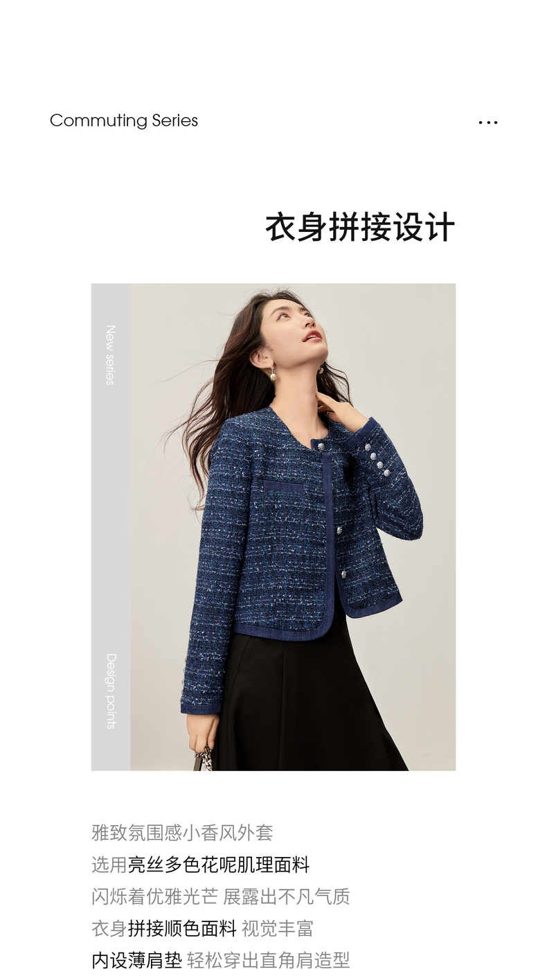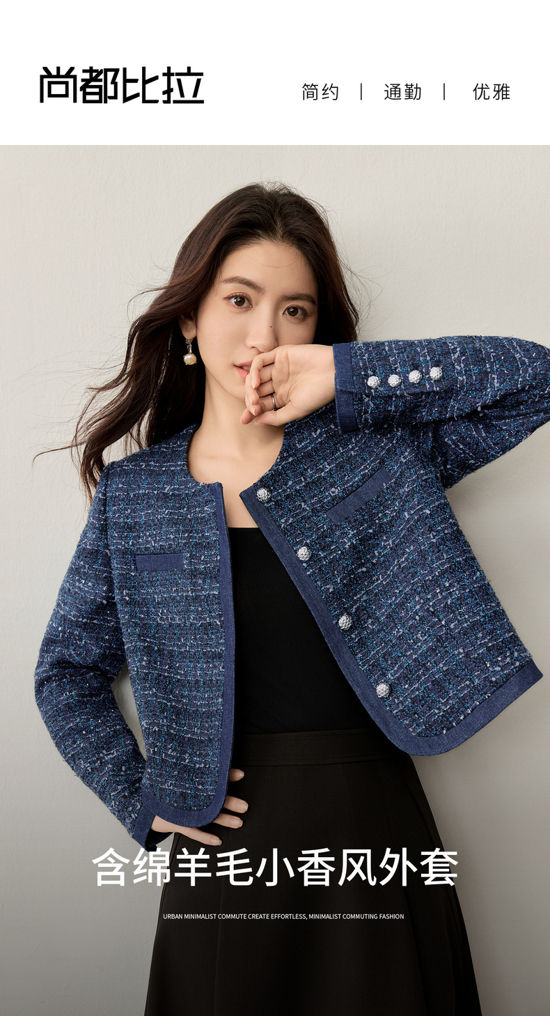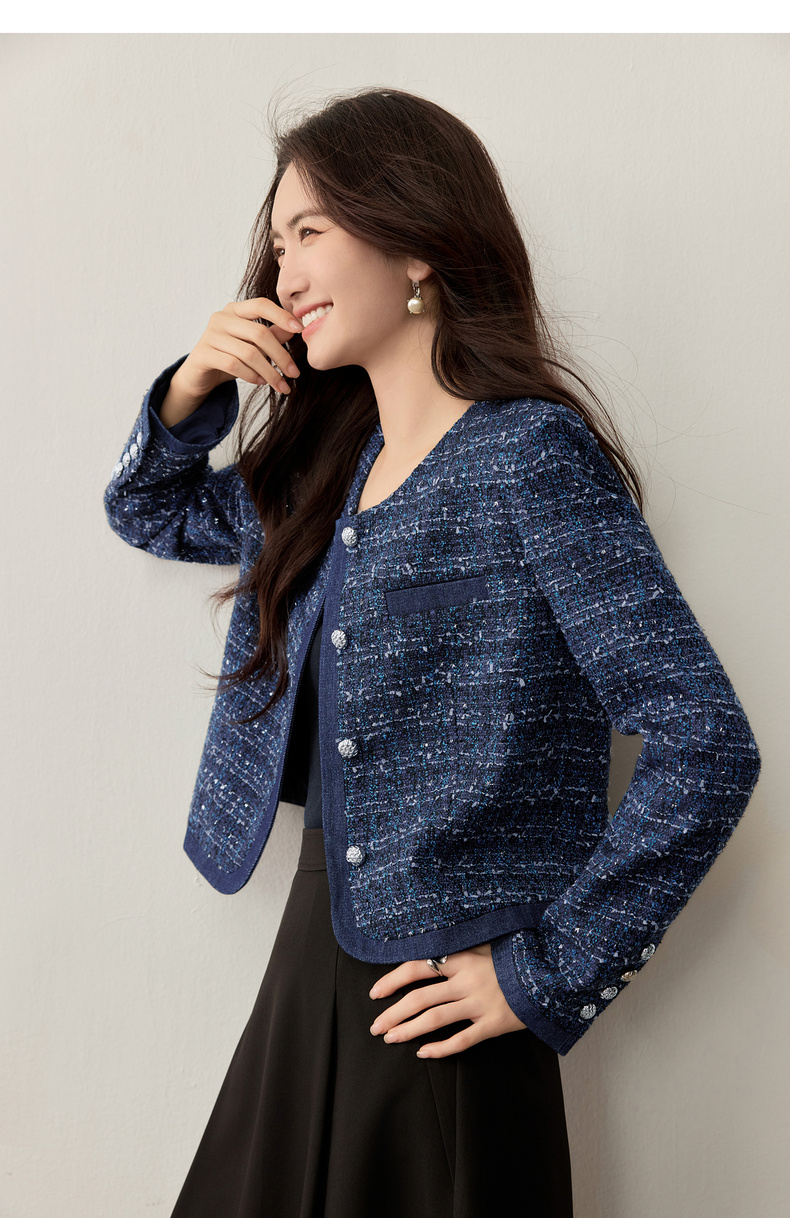 【内购】【含绵羊毛】小香风优雅通勤设计垫肩亮丝花呢短款长袖外套-153W80357