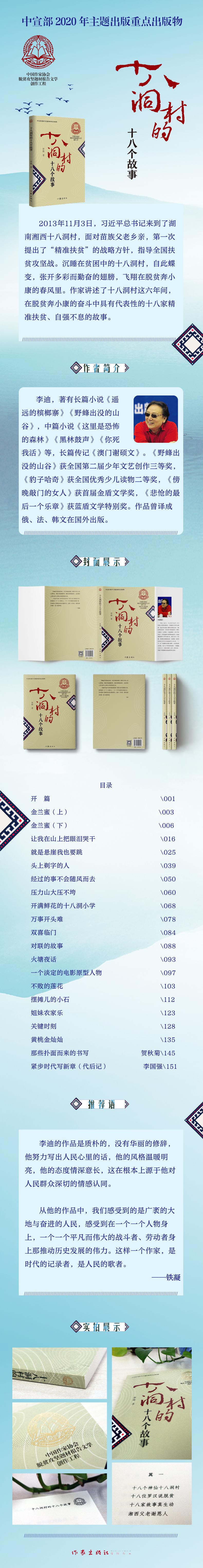 2013年11月3日,习近平总书记来到了湖南湘西十八洞村,面对苗族父老乡亲,第一次提出了“精准扶贫”的战略方针,指导全国扶贫攻坚战。沉睡在贫困中的十八洞村,自此蝶变,张开多彩而勤奋的翅膀,飞翔在脱贫奔小康的春风里。作家讲述了十八洞村这六年间,在脱贫奔小康的奋斗中具有代表性的十八家精准扶贫、自强不息的故事。
