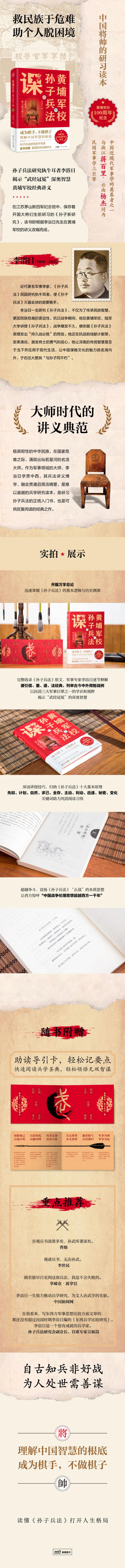 在江苏茅山新四军纪念馆中,陈列着开国大将粟裕生前研读的《孙子新研究》,该书便是中国近代军事学巨擘李浴日《黄埔军校孙子兵法课》的基础。李浴日一生研究《孙子兵法》,不仅为了传承民族智慧,更因民族危难的紧迫性。在抗日战争期间,李浴日在黄埔军校、民国陆军大学讲授《孙子兵法》,在各抗战前线献计献策,发表演说,激发将士的勇气和信心。他与浙江蒋百里、云南杨杰同为军事学三巨擘,被当时公认为“孙子兵法研究第一人”,是全球孙子研究热的引领者,于右任大赞其“与孙子同不朽”。《黄埔军校孙子兵法课》收录《孙子兵法》原文及中国近代军事专家李浴日的研究成果,既有针对原著的逐句解说,又有中外谋略的对比研究,阐明孙武智谋的哲学思想渊源,剖析《孙子兵法》深藏的智慧与具体应用之法。