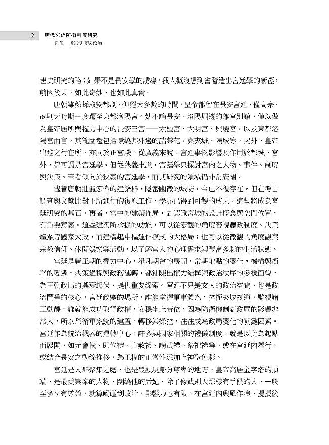 本書從宮門的開閉、宮廷的門禁制度、官吏入宮與車馬僕從的管理、宮廷防衛體系的建構及其演變、宮中的監獄等面向,說明唐朝如何佈下宮廷防護網,並以稽查嚴管,強化宮廷的防衛力道。至於其中存在的制度與人為缺失,也是本書要探索的課題。