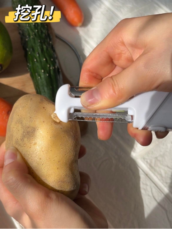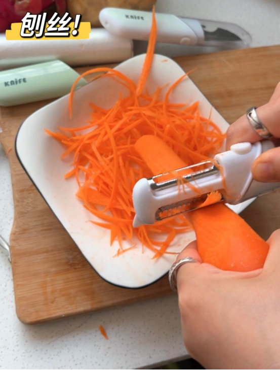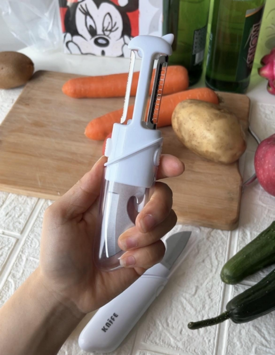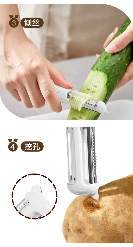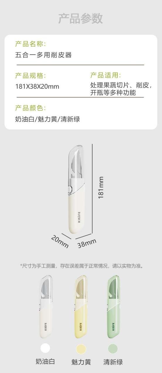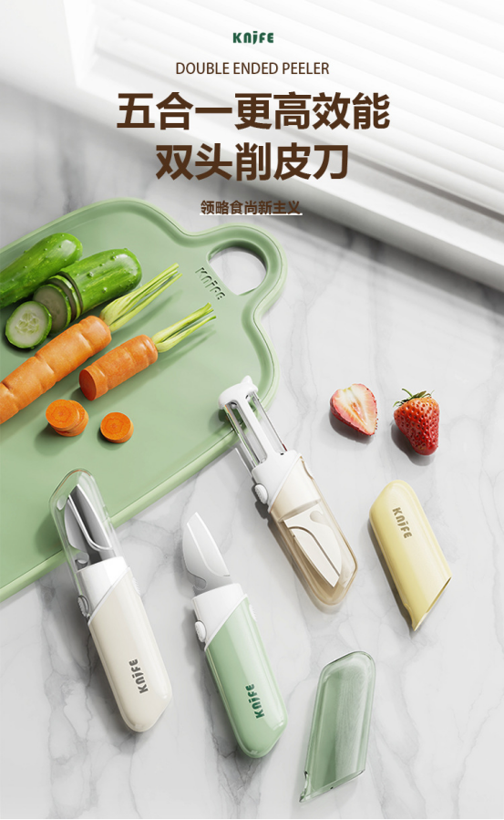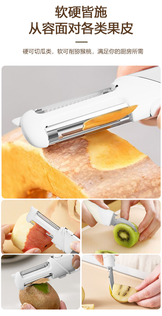 家里的削皮器是不是已经“粘手”了 专用水果蔬菜刀也是到处放 在有宝宝的家里还特别危险 这款五合一便携多功能水果削皮刀 🍑 双面刀头,五种功能,满足厨房的多种需求 不锈钢+ABS,防锈防摔,保持锋利 厨师级刀片,长久锋利耐用