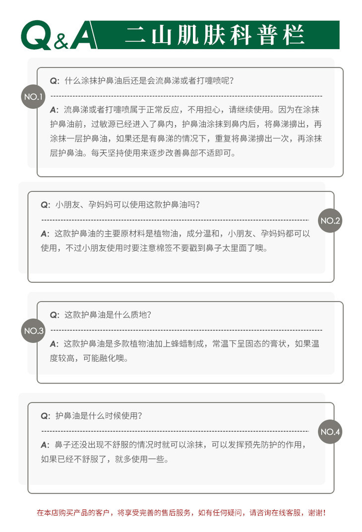 | 护鼻油中含有未精制的乳木果油、蜂蜡和液态植物油制成,常温下呈固态膏状,当夏季温度较高时,固态油脂可能会融化变形,为正常现象,敬请谅解。 |