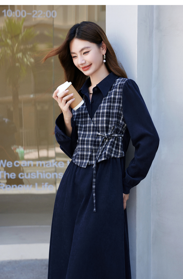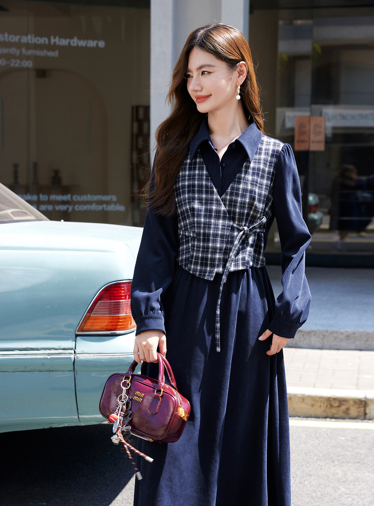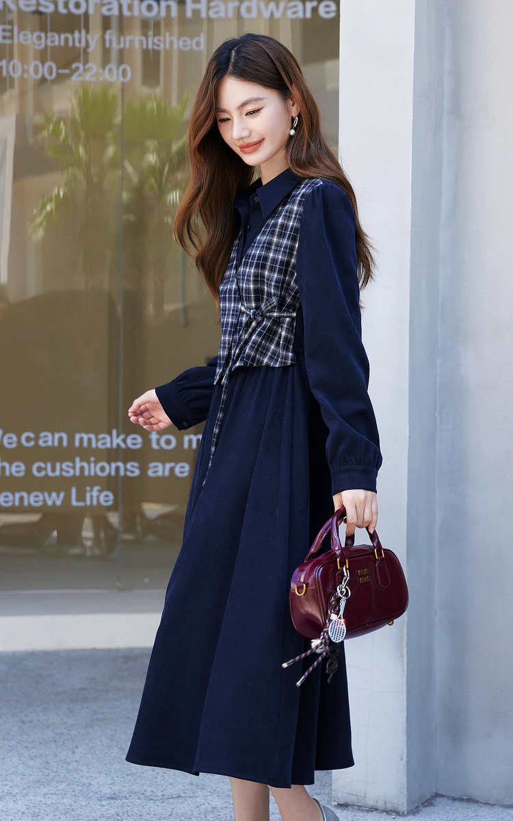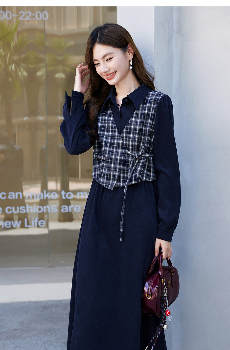 【年货节】熙世界学院风格纹拼接假两件连衣裙女秋冬气质收腰梨形伯克利裙子