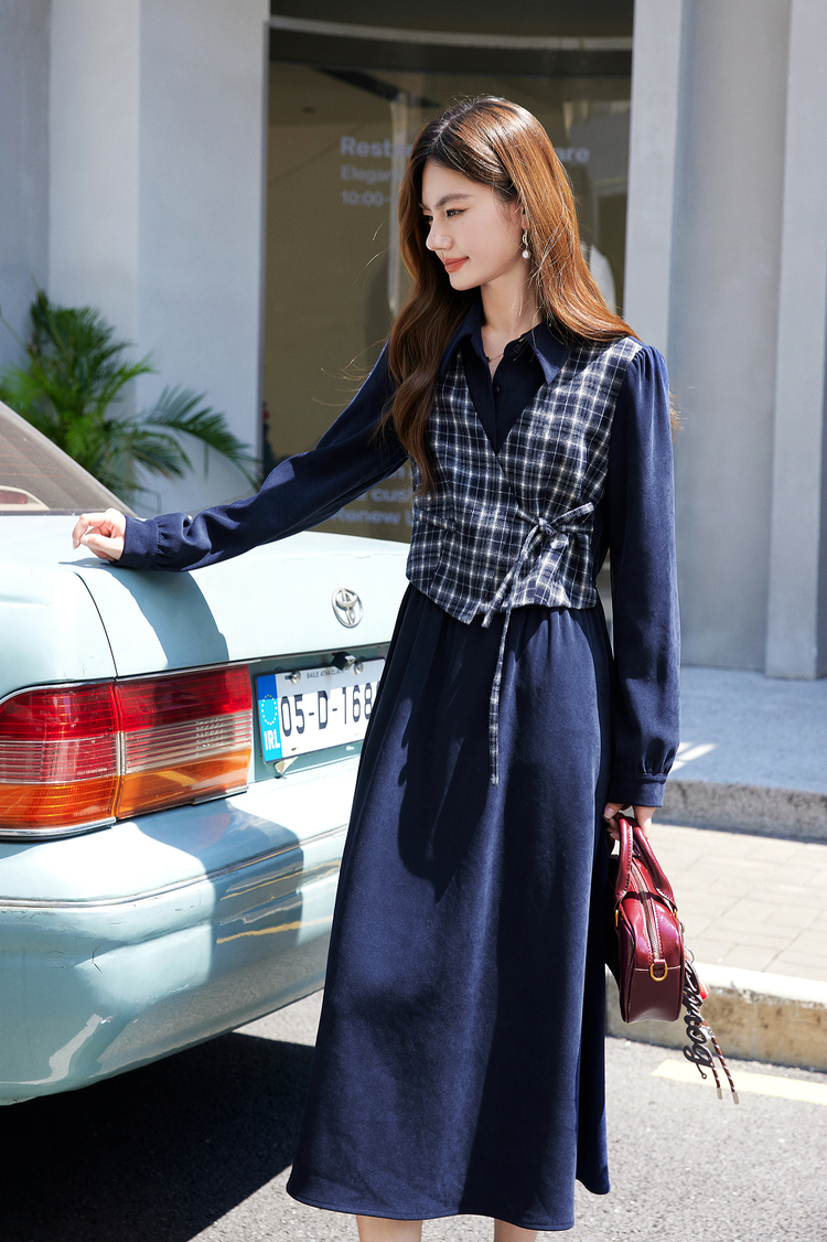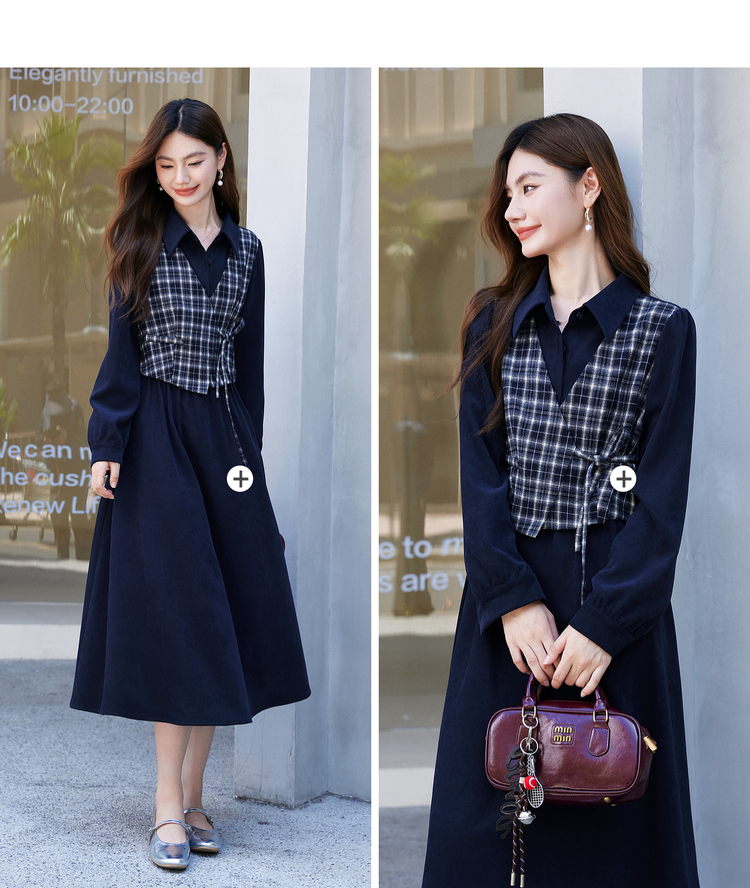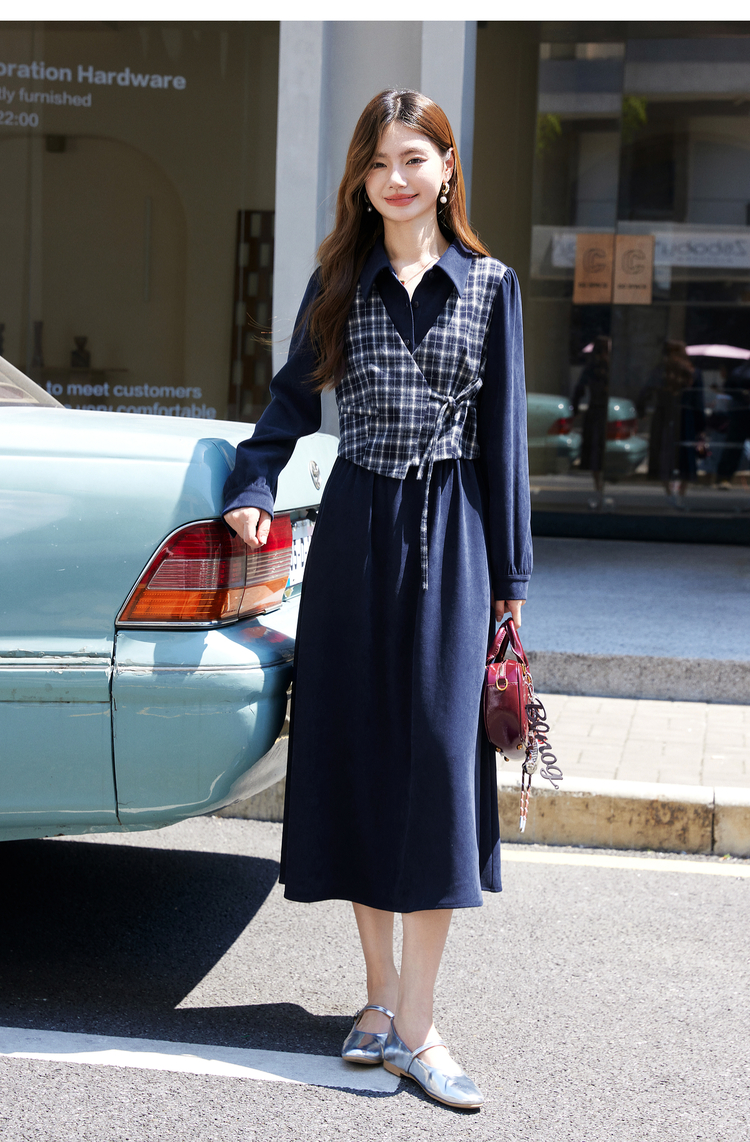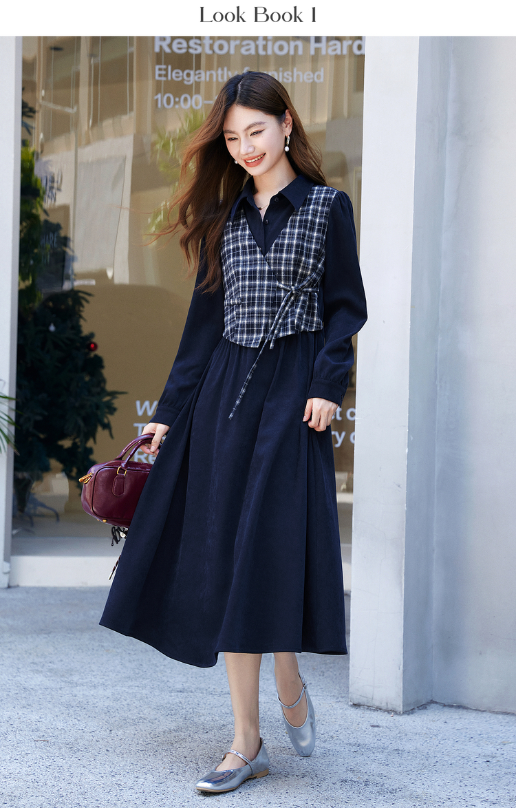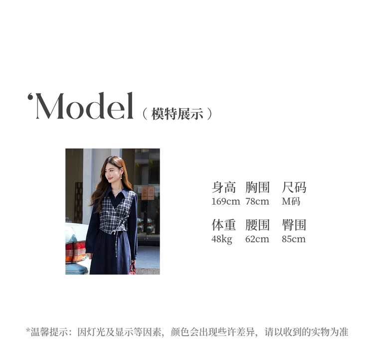 【年货节】熙世界学院风格纹拼接假两件连衣裙女秋冬气质收腰梨形伯克利裙子