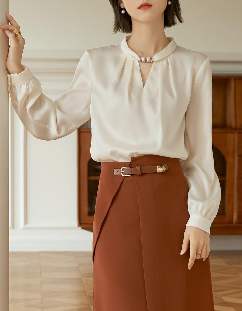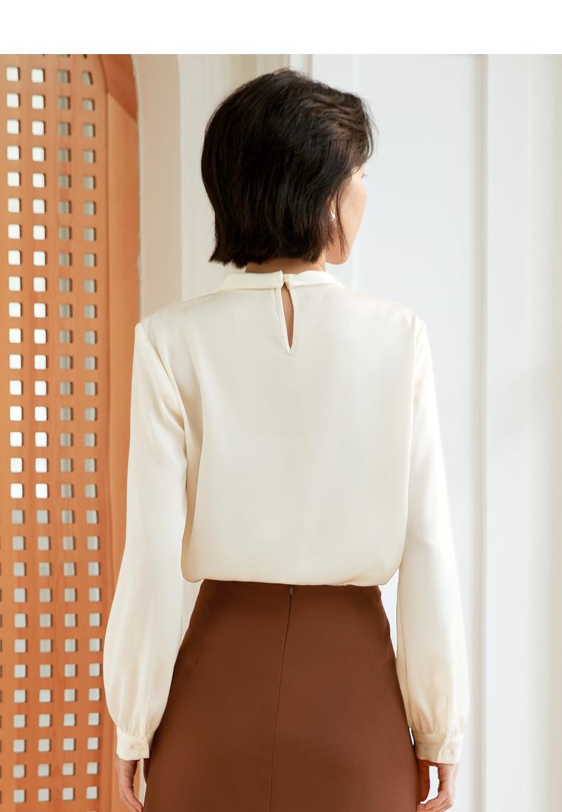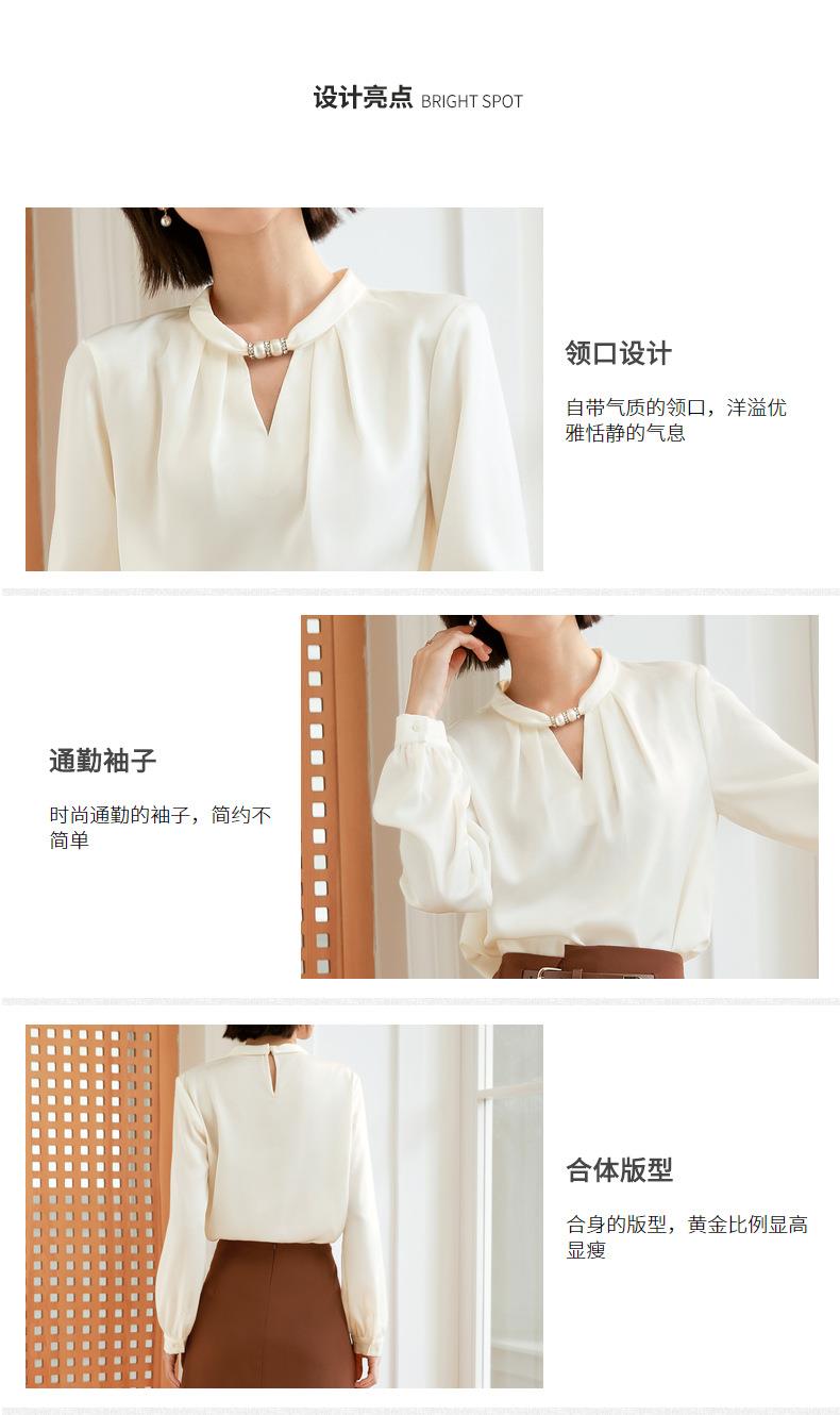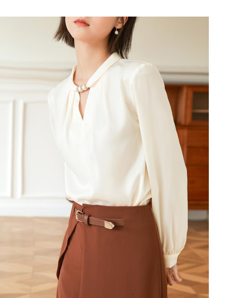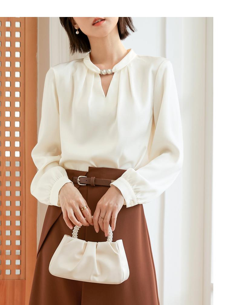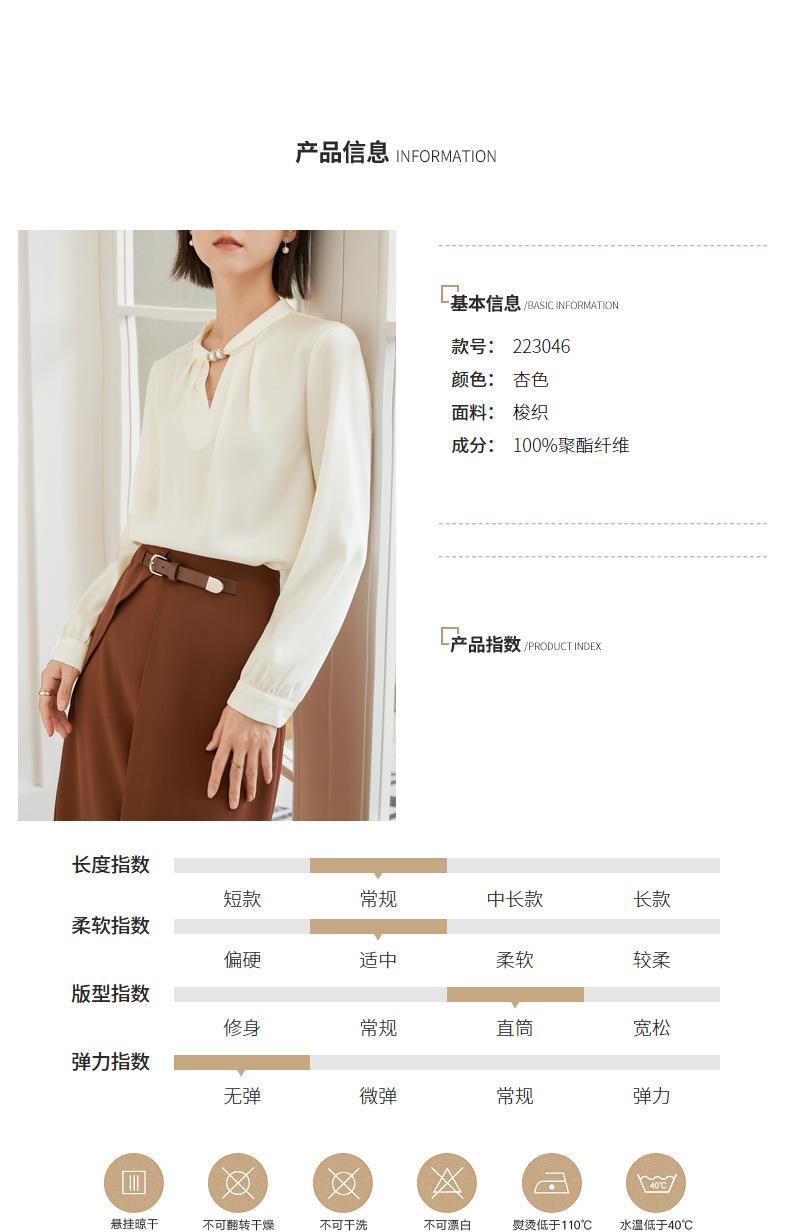 百姿 气质优雅雪纺衫2022秋季新款小衫V领钉珠褶皱长袖法式上衣女