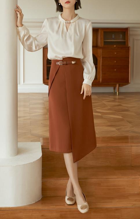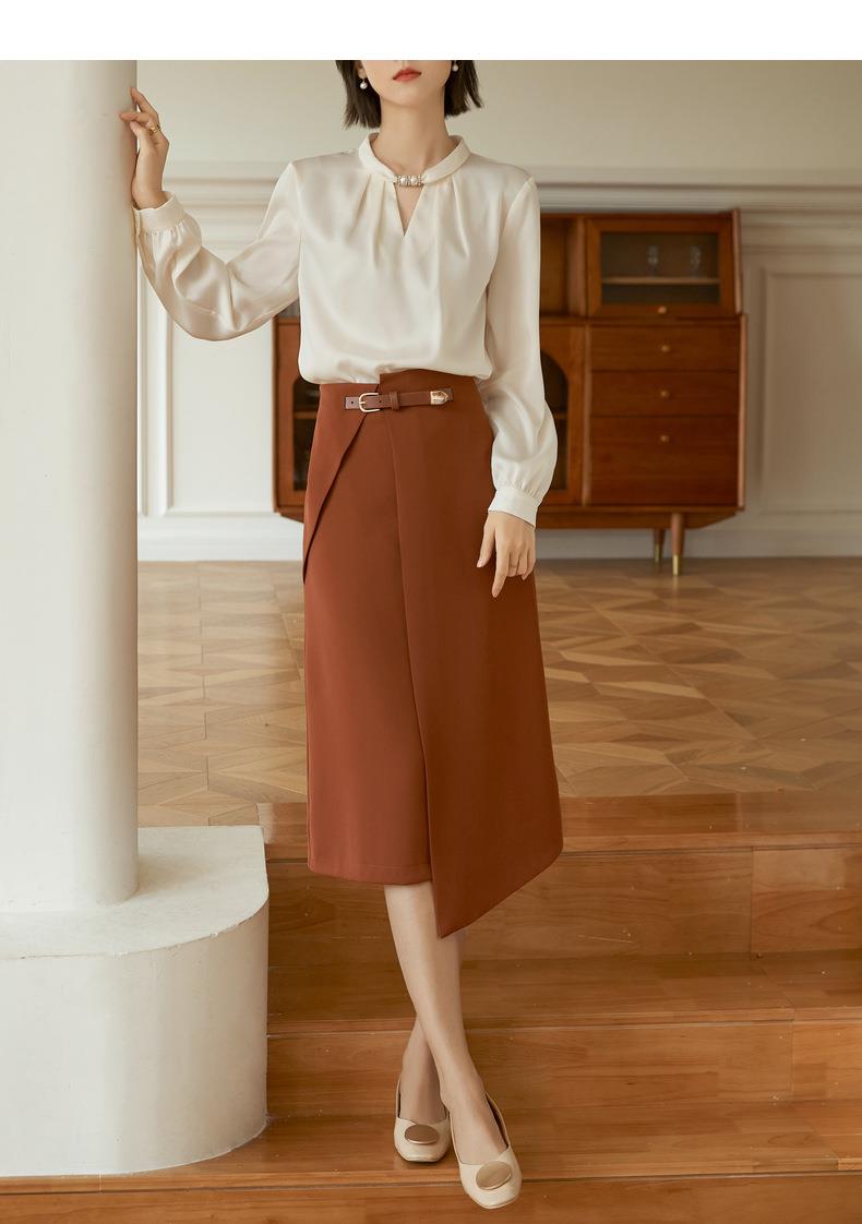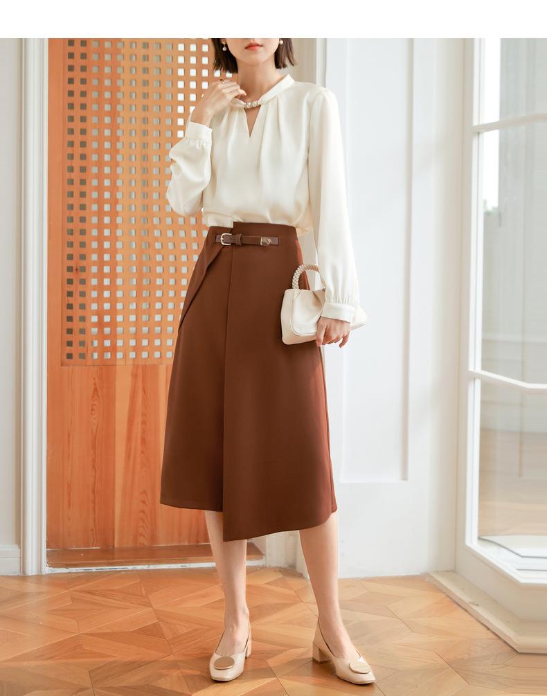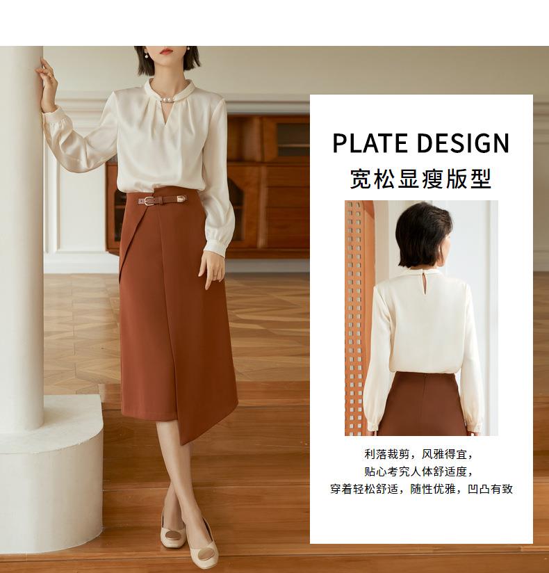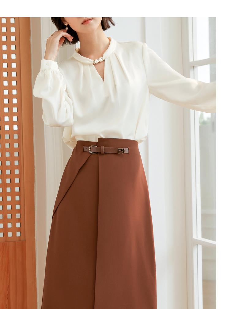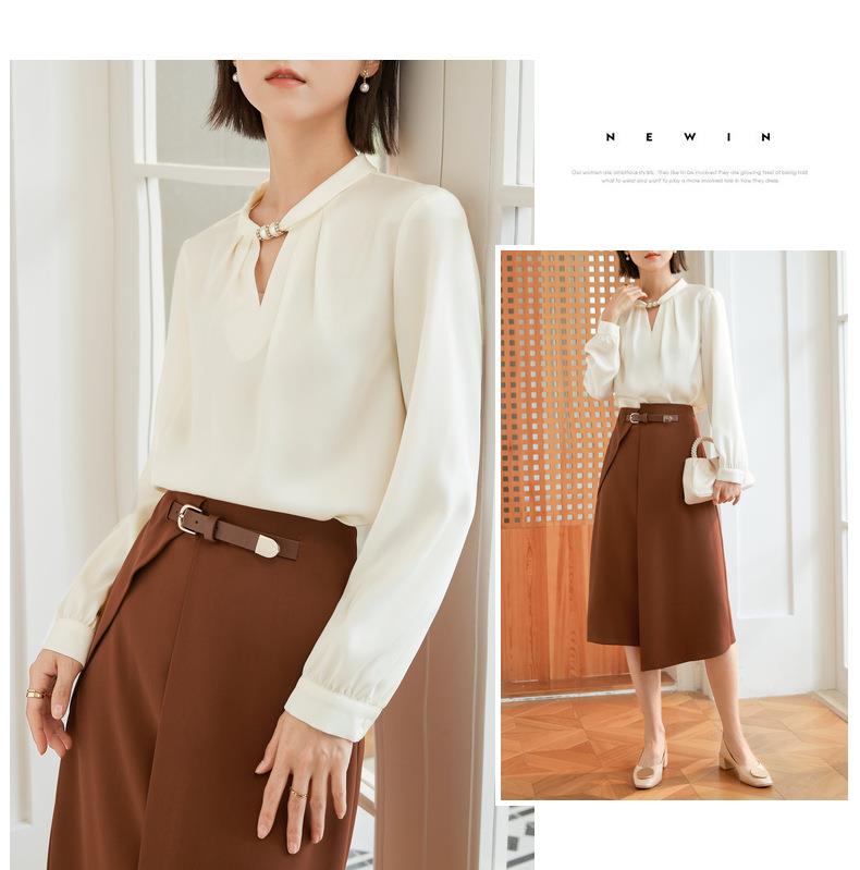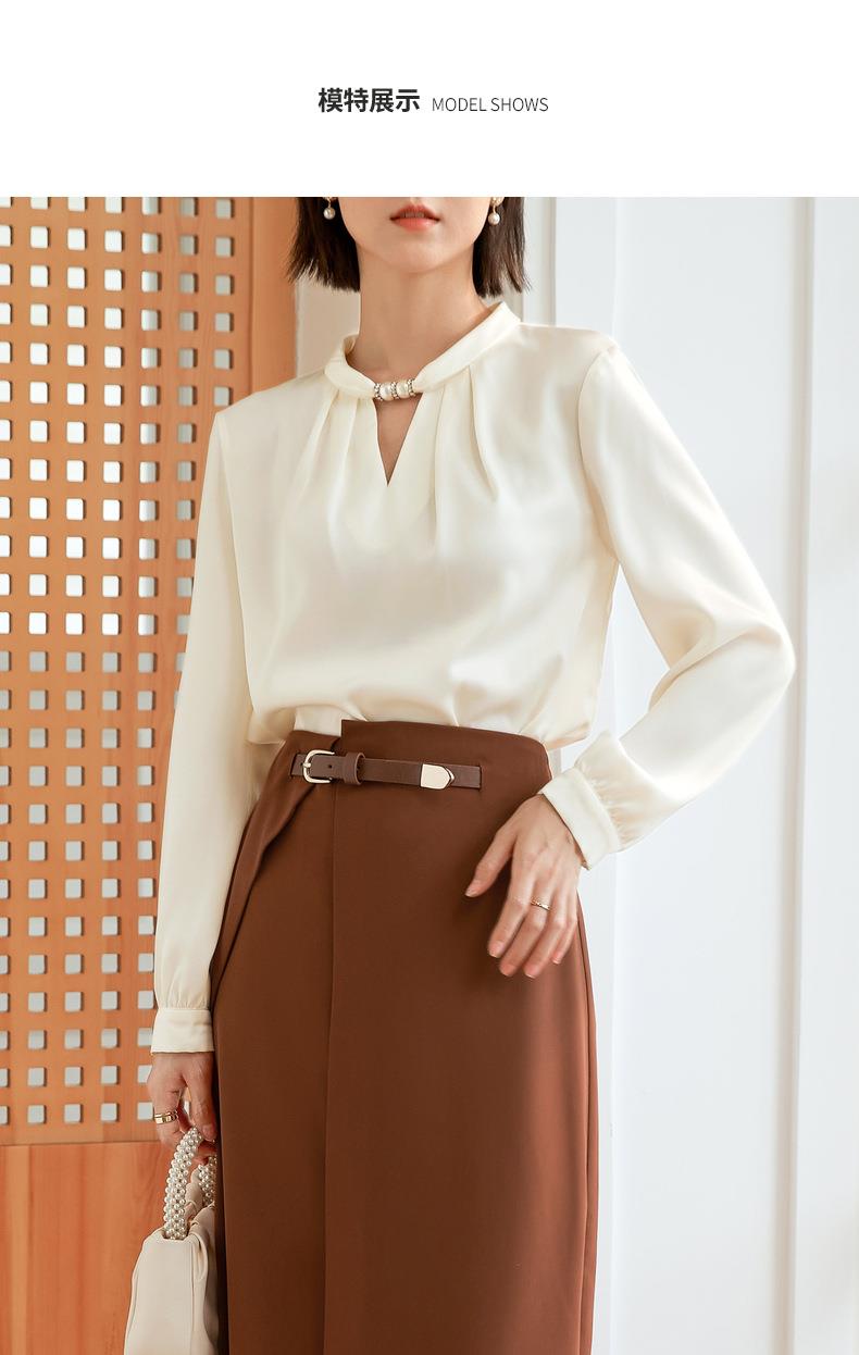 百姿 气质优雅雪纺衫2022秋季新款小衫V领钉珠褶皱长袖法式上衣女