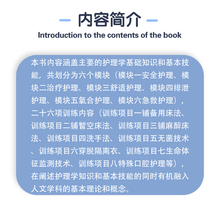 本书内容涵盖主要的护理学基础知识和基本技能,共划分为六个模块(模块一安全护理、模块二治疗护理、模块三舒适护理、模块四排泄护理、模块五氧合护理、模块六急救护理),二十六项训练内容(训练项目一铺备用床法、训练项目二铺暂空床法、训练项目三铺麻醉床法、训练项目四洗手法、训练项目五无菌技术、训练项目六穿脱隔离衣、训练项目七生命体征监测技术、训练项目八特殊口腔护理等),在阐述护理学知识和基本技能的同时有机融入人文学科的基本理论和概念。
