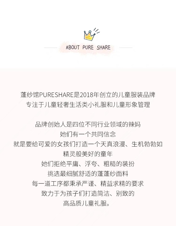 PureShare蓬纱馆,2018年创立的儿童服装品牌,专注于儿童轻奢生活类小礼服,主张“让孩子做最独特的自己”的品牌理念,为孩子们提供时尚简洁、优雅而又不失童真的生活类礼服。