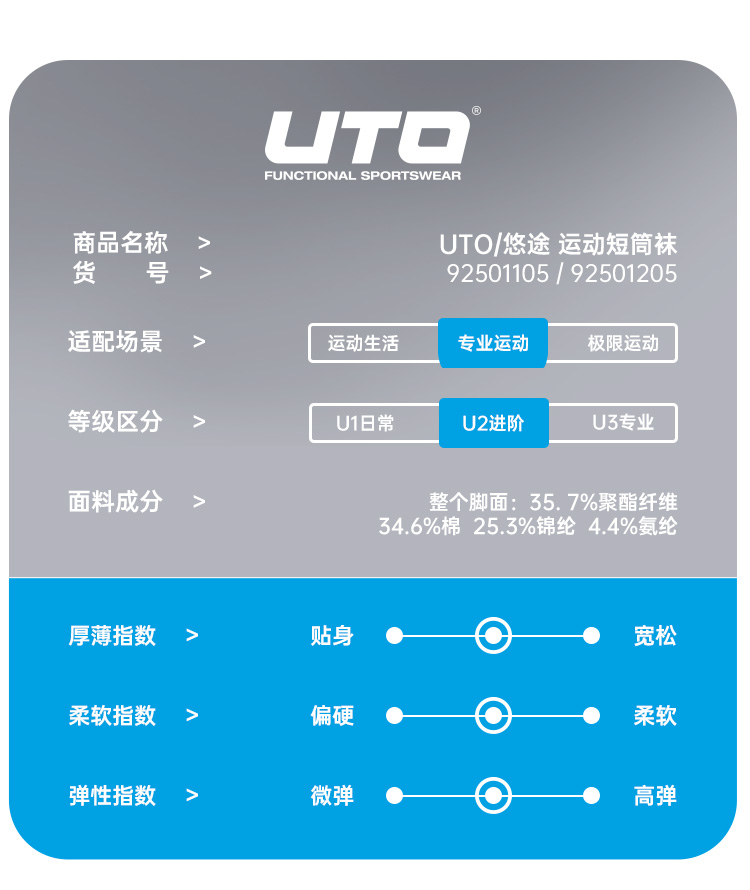 UTO悠途潜心于贴身运动装备的研发、设计和生产。从纤维到组织,从设计到工艺,在无缝贴身运动装备领域,树立国内标杆。 UTO着力于品牌互联网化,不断采集大量运动数据,为跑步、健身、滑雪等不同类型的运动爱