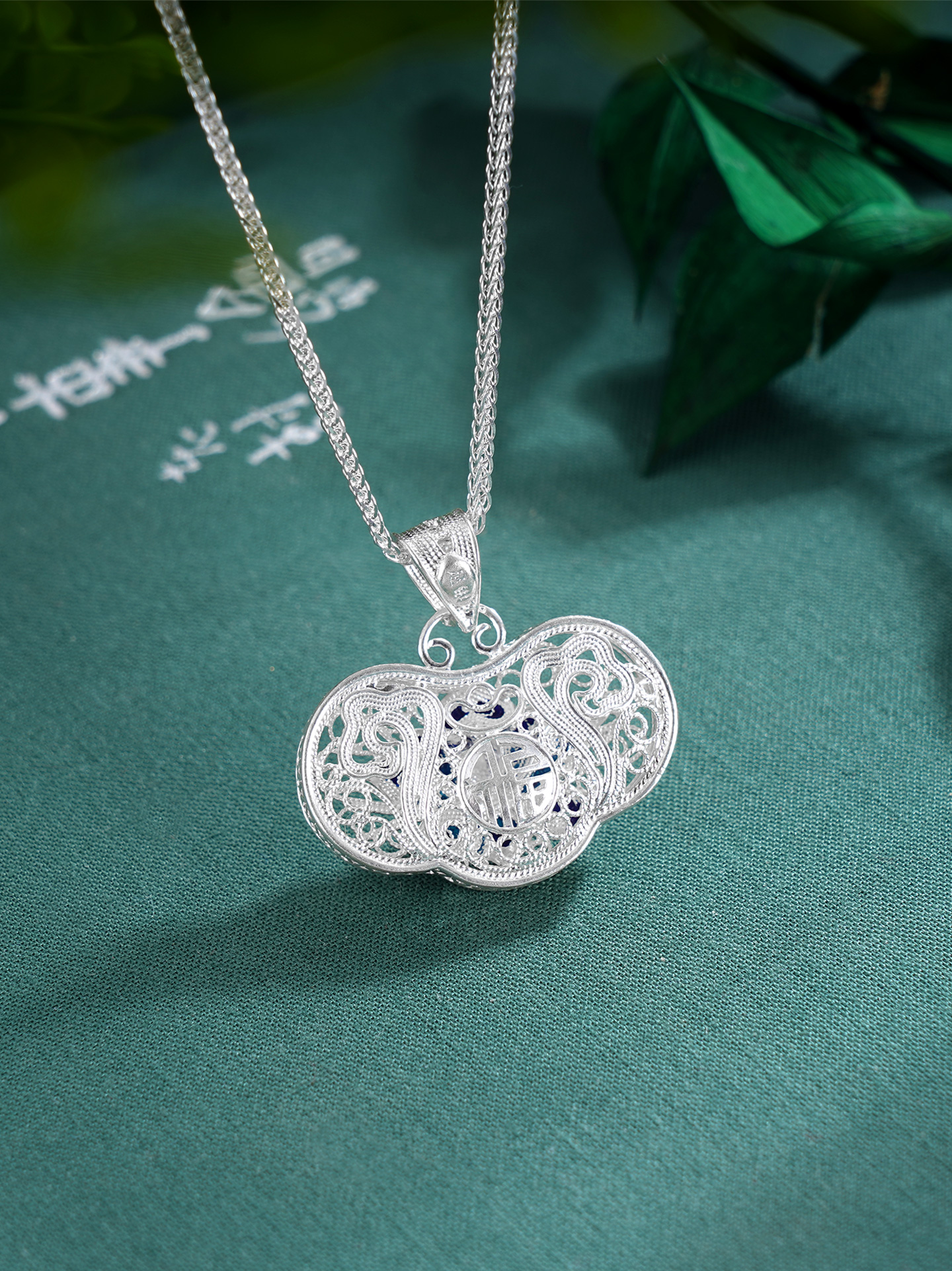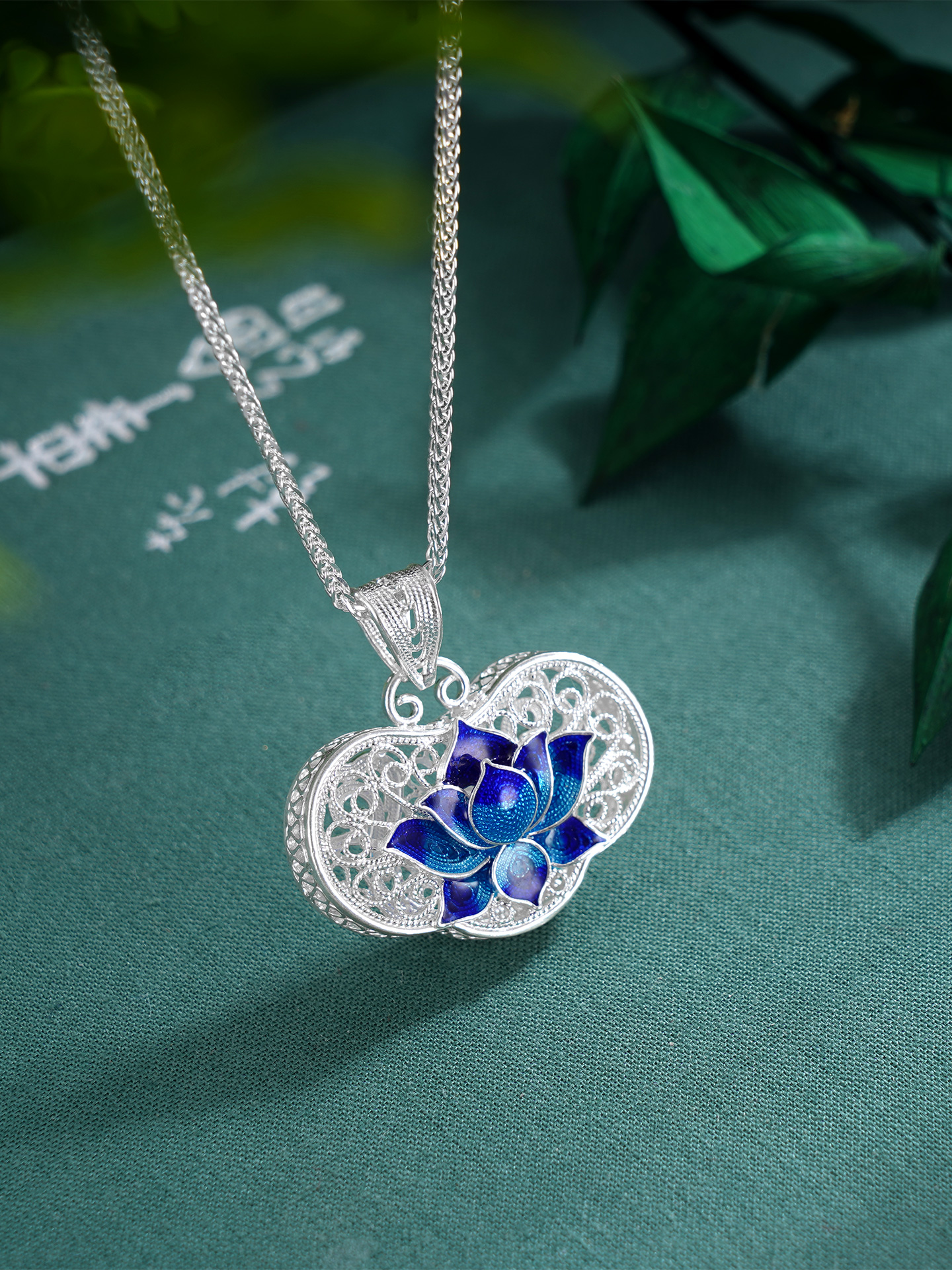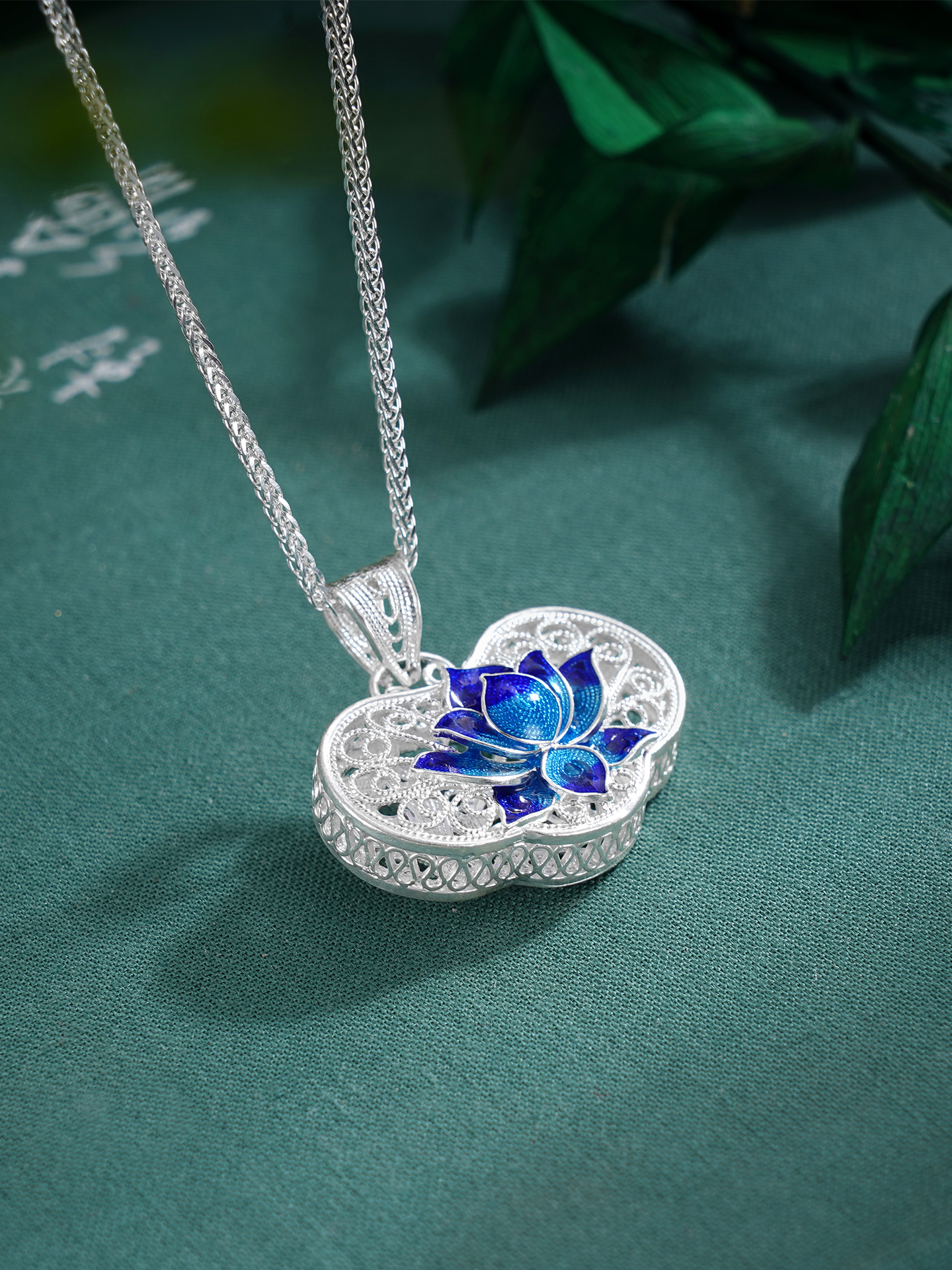 【寓意】:作品以莲花为灵感设计,采用花丝工艺打造。景泰蓝点染,生机盎然。整体清润温婉,意境深远,寓意鲜花漫天,幸福常伴。