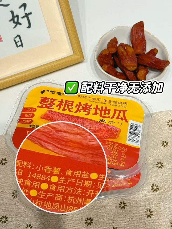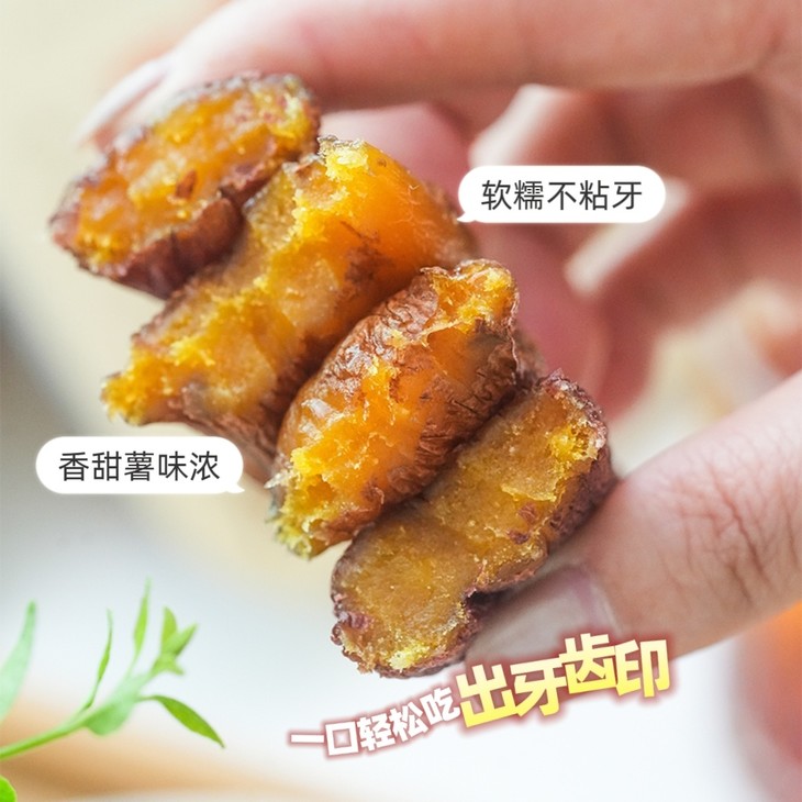 7 斤鲜薯才出 1 斤干,肉质鲜嫩,口感软糯似杏脯,不干不硬不黏牙,膳食纤维丰富,薯香浓郁。