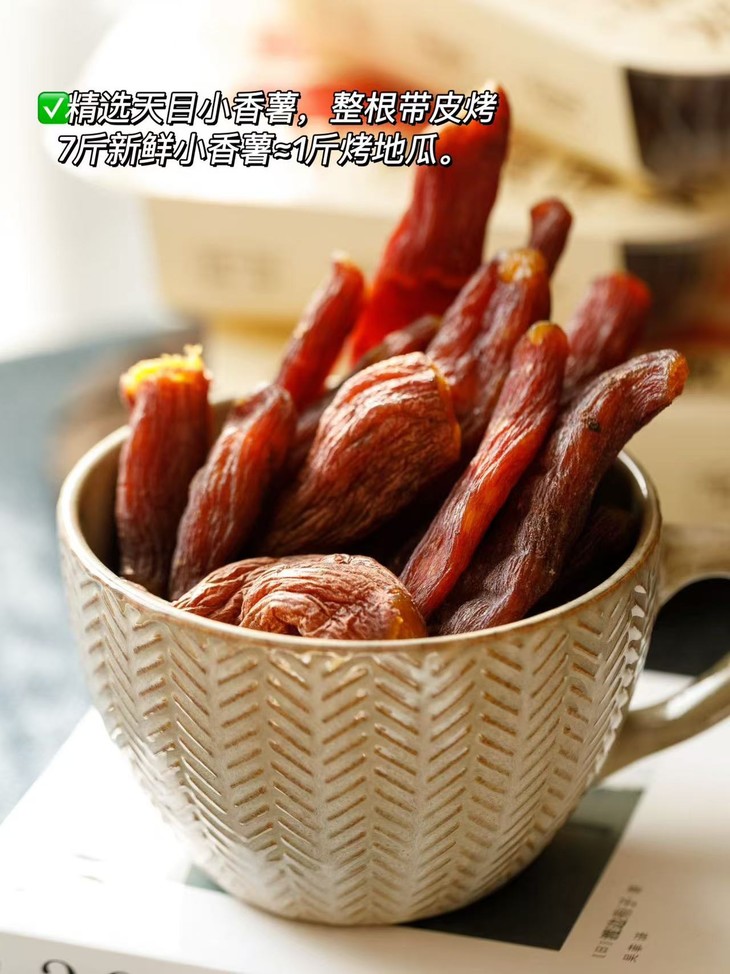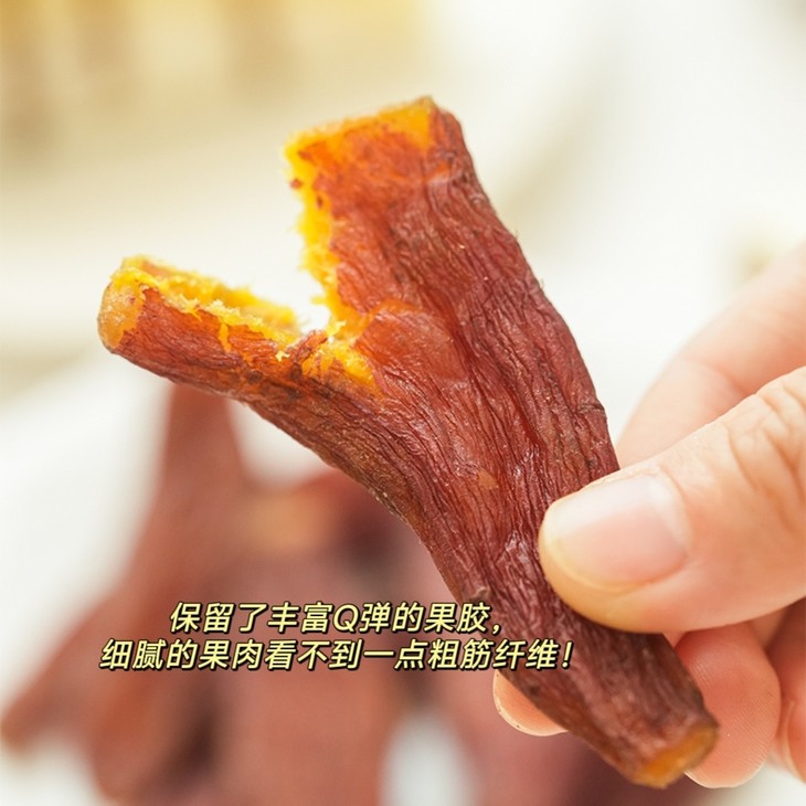 【整根烤地瓜】7斤新鲜红薯才能出1斤红薯干,四蒸四烘工艺复杂品质精良, 100 小时低温烘烤,肉质鲜嫩,口感软糯似杏脯,不干不硬不黏牙,膳食纤维丰富,薯香浓郁。