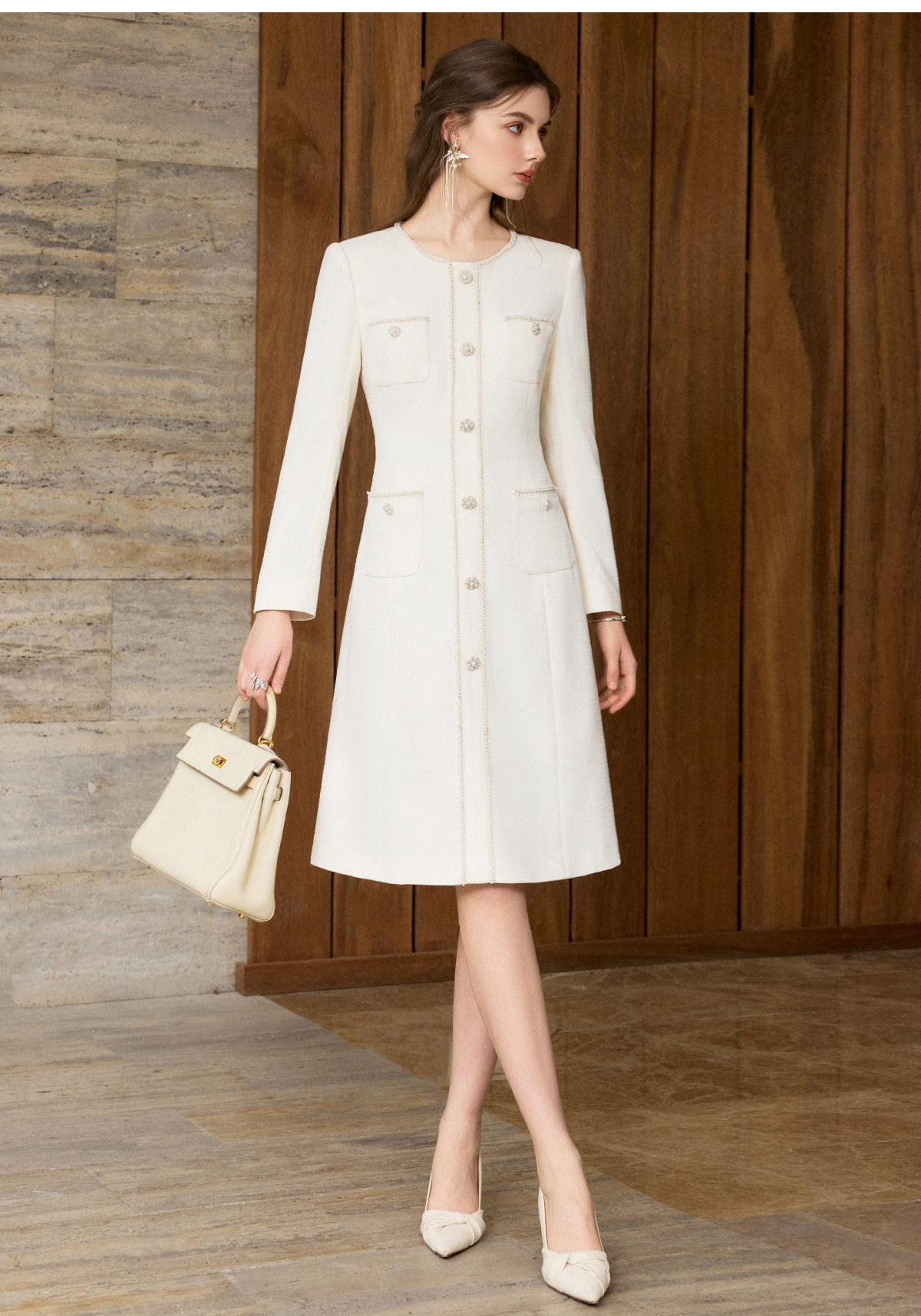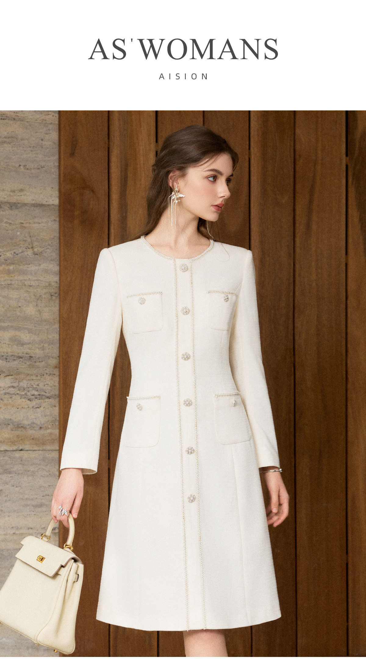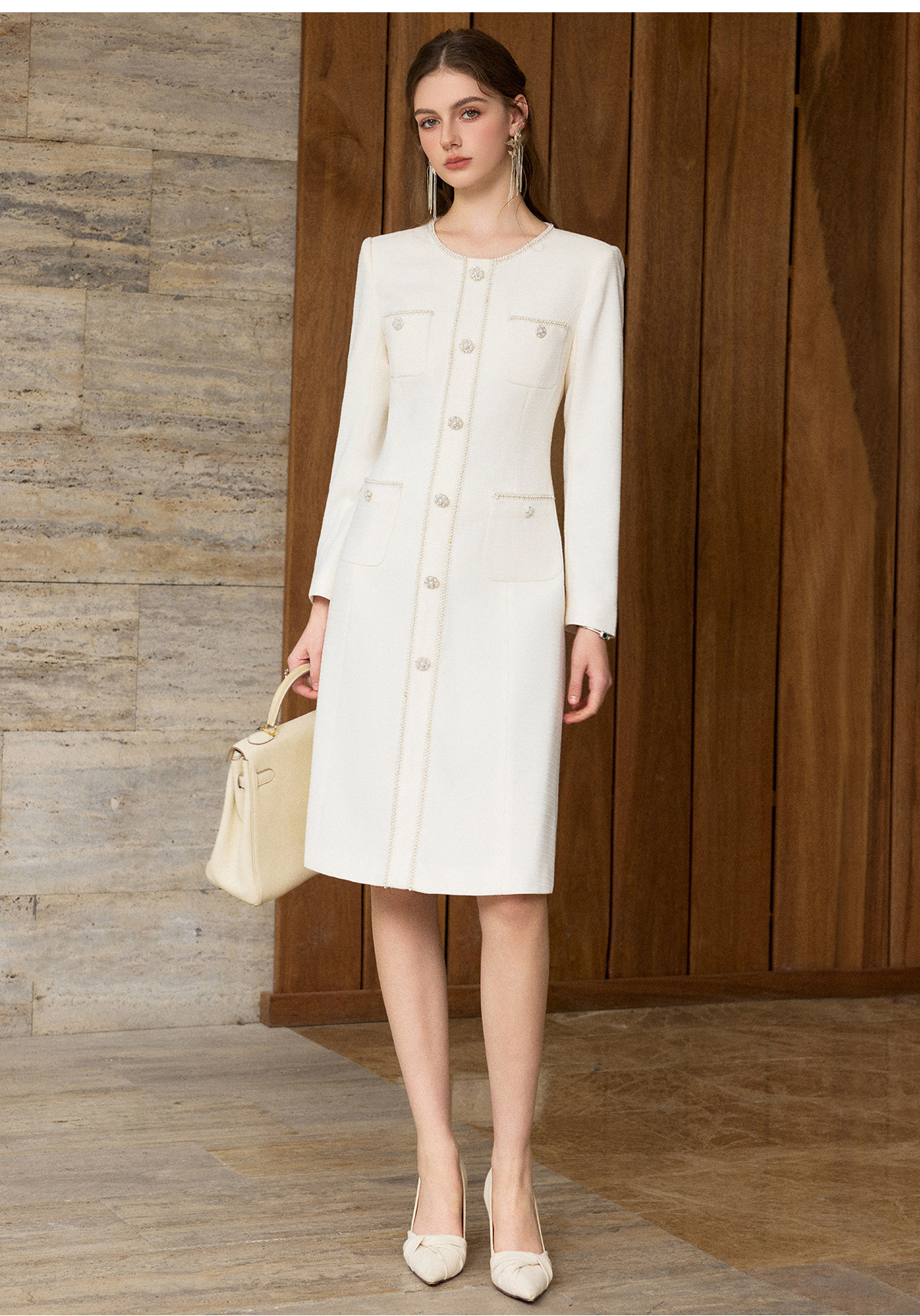 IWY/小香风米白色长袖连衣裙女珍珠扣显瘦通勤优雅西装裙工作服J25Q261-M