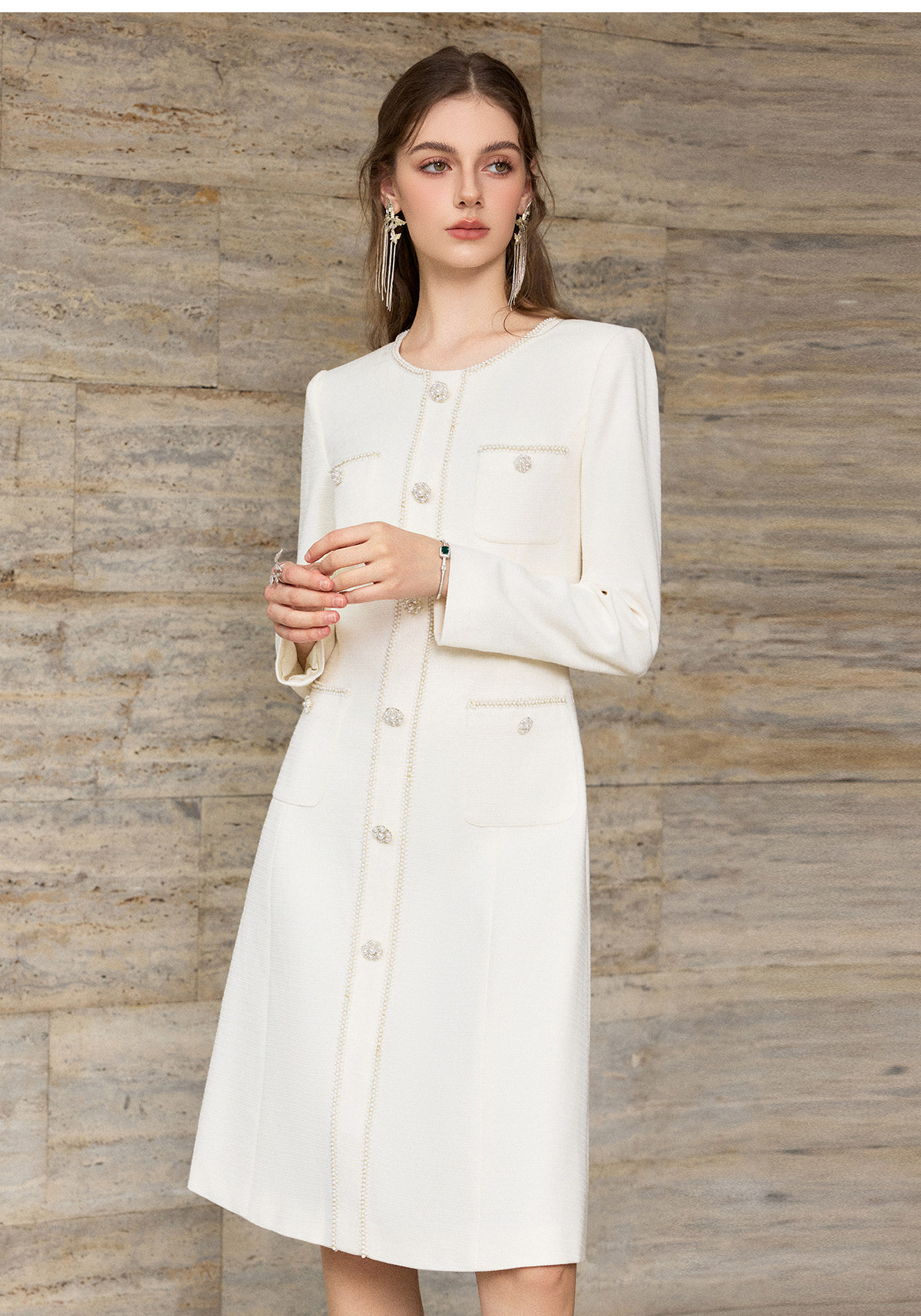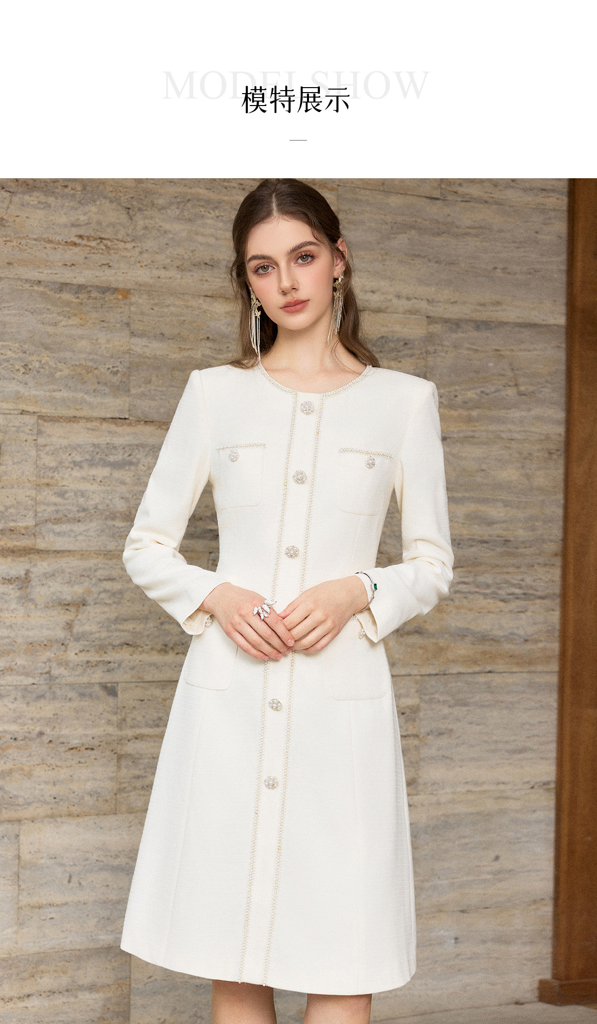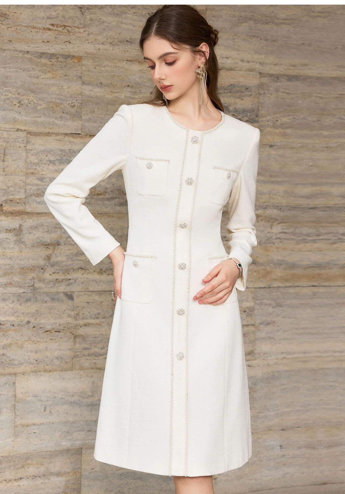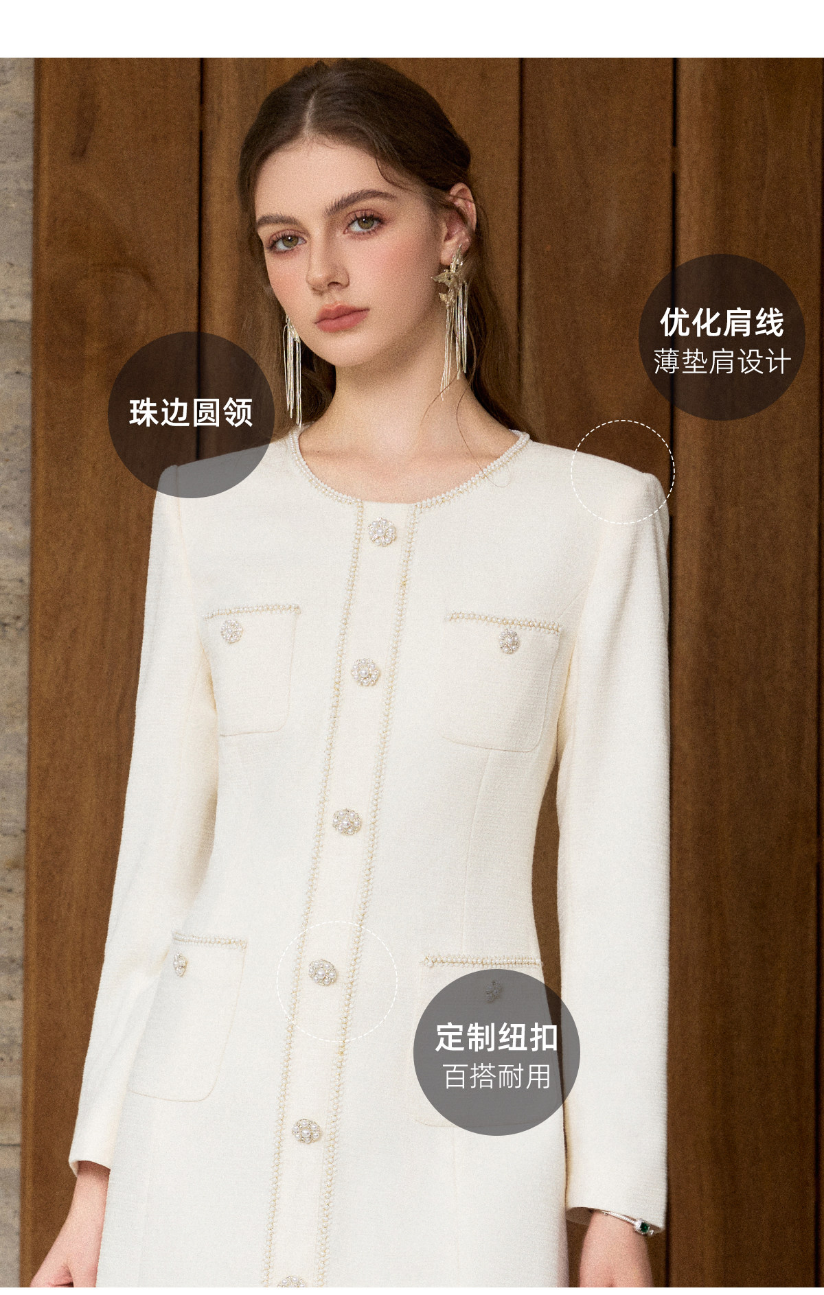 IWY/小香风米白色长袖连衣裙女珍珠扣显瘦通勤优雅西装裙工作服J25Q261-M