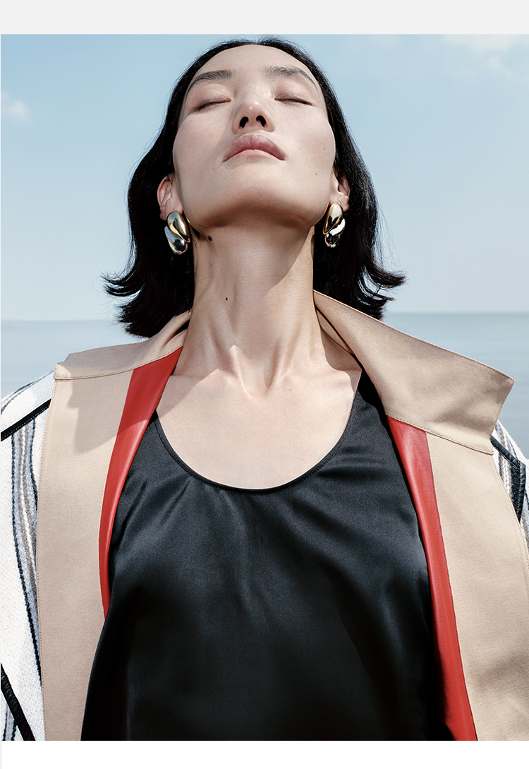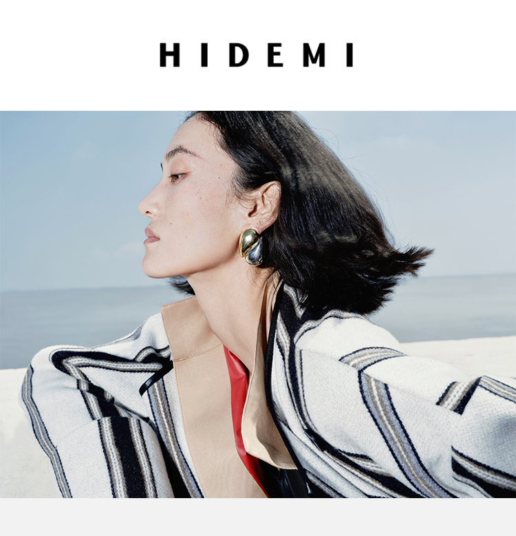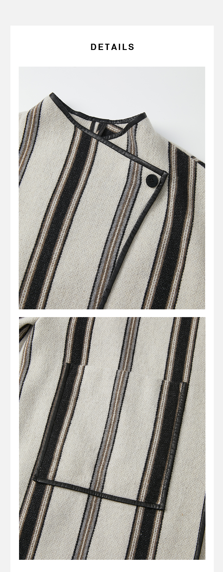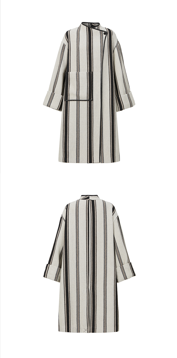 HIDEMI 色织条纹澳洲羊毛不对称口袋皮边镶嵌工艺极简设计感oversize大衣