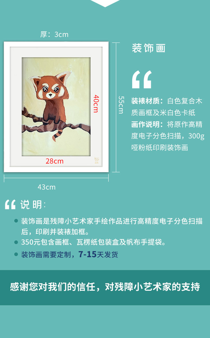 - 金羽翼将艺术与心理治疗相结合,用艺术教育的形式帮助残障青少年体现自身价值、提高生活质量、实现艺术梦想,并将绘画作品开发成衍生品销售,收入扣除成本后,20%返还给学员家庭,80%用于金羽翼艺术康复教学。