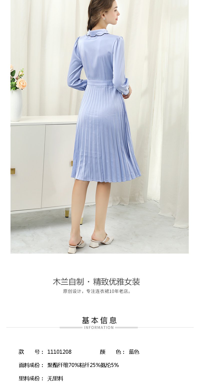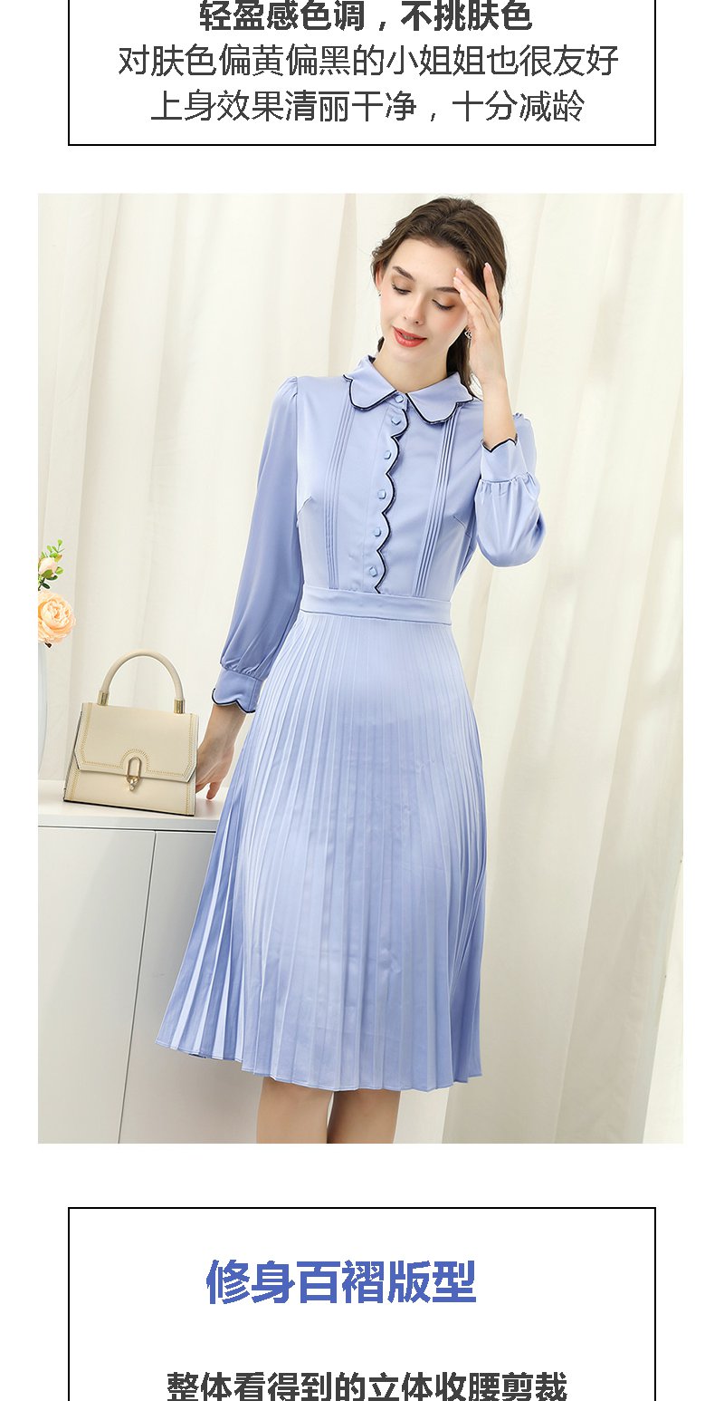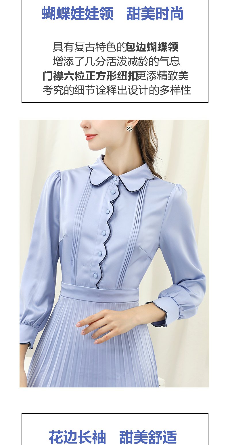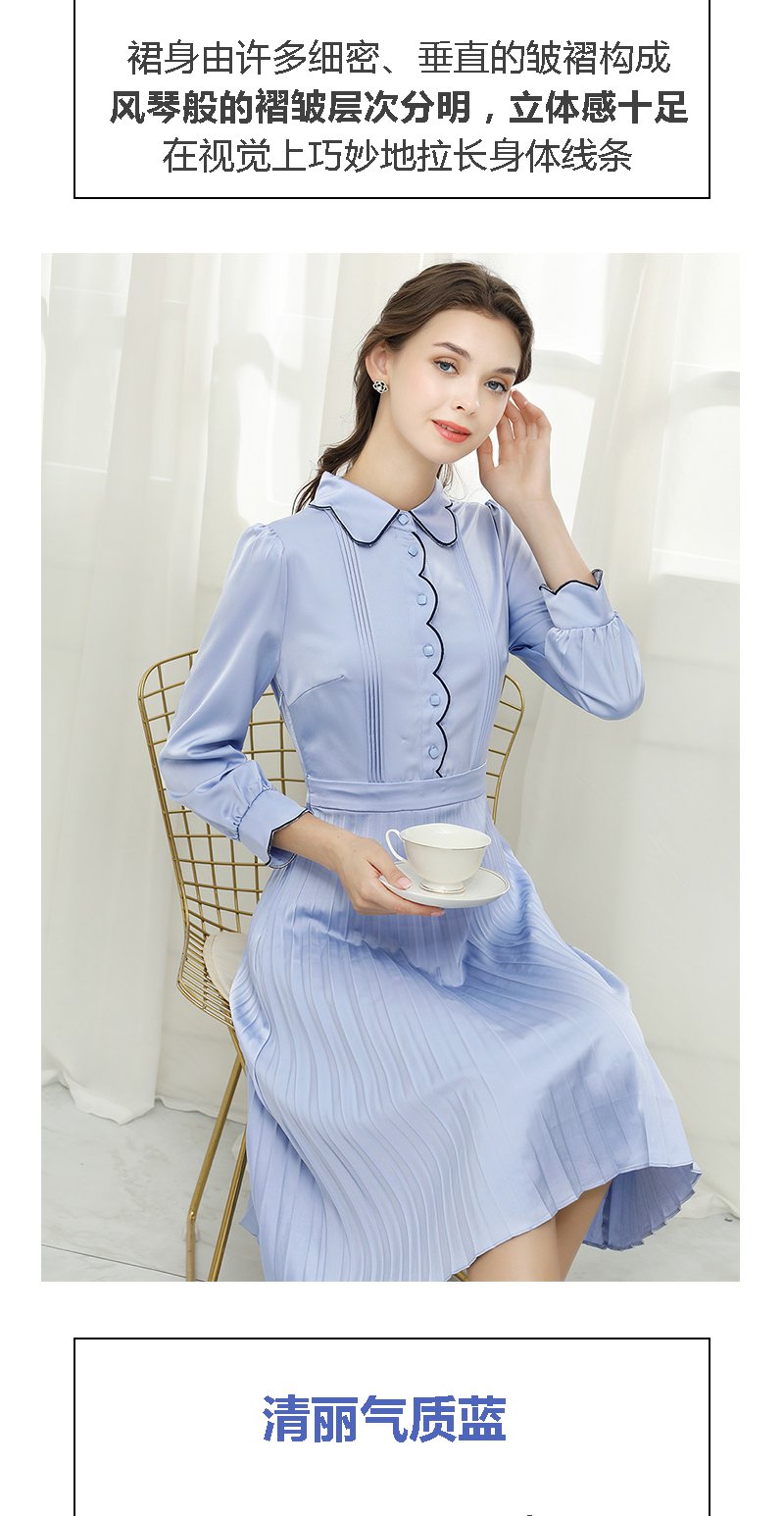 未风蓝色显瘦连衣裙女春2025年春季新款女装气质修身长袖百褶裙子