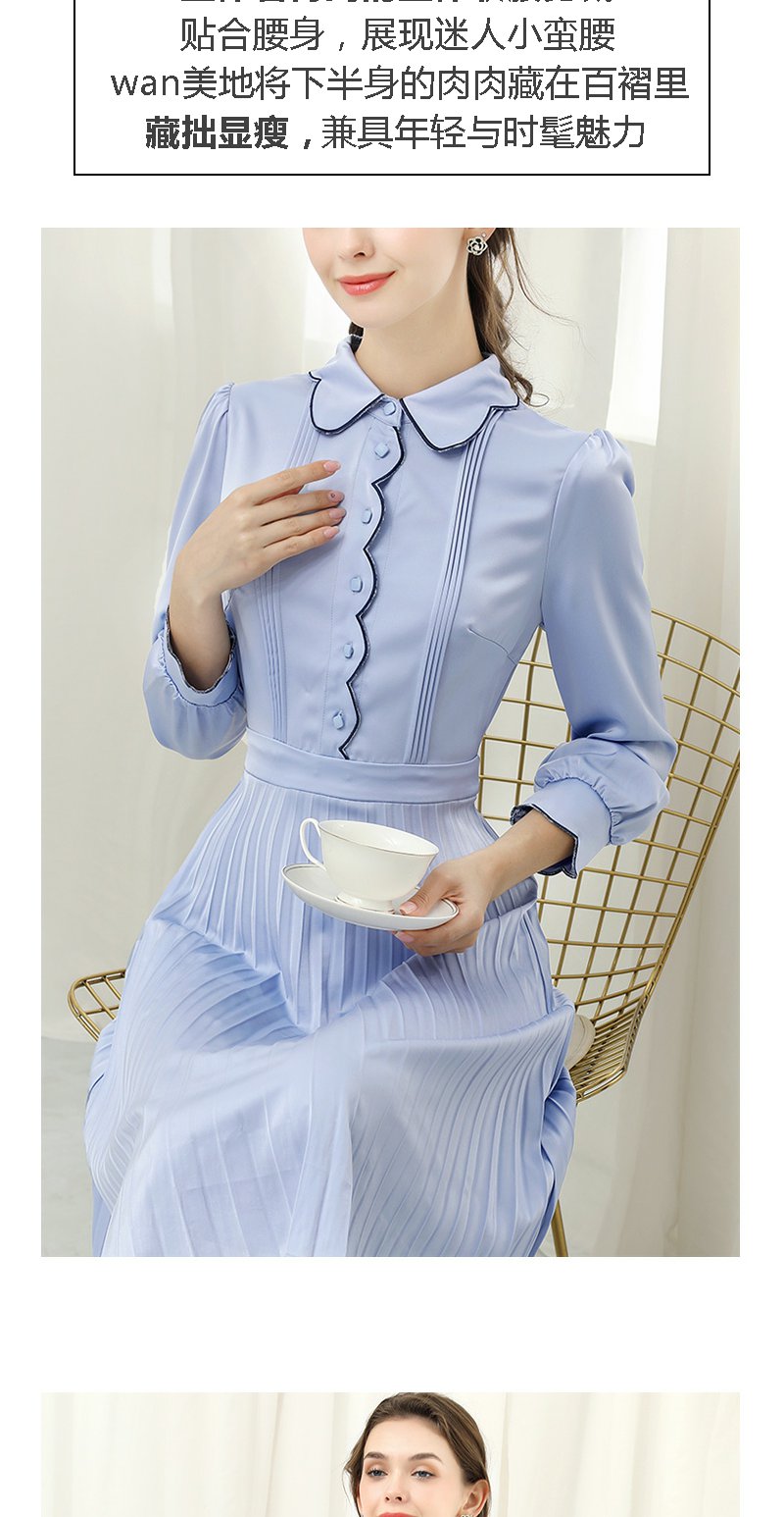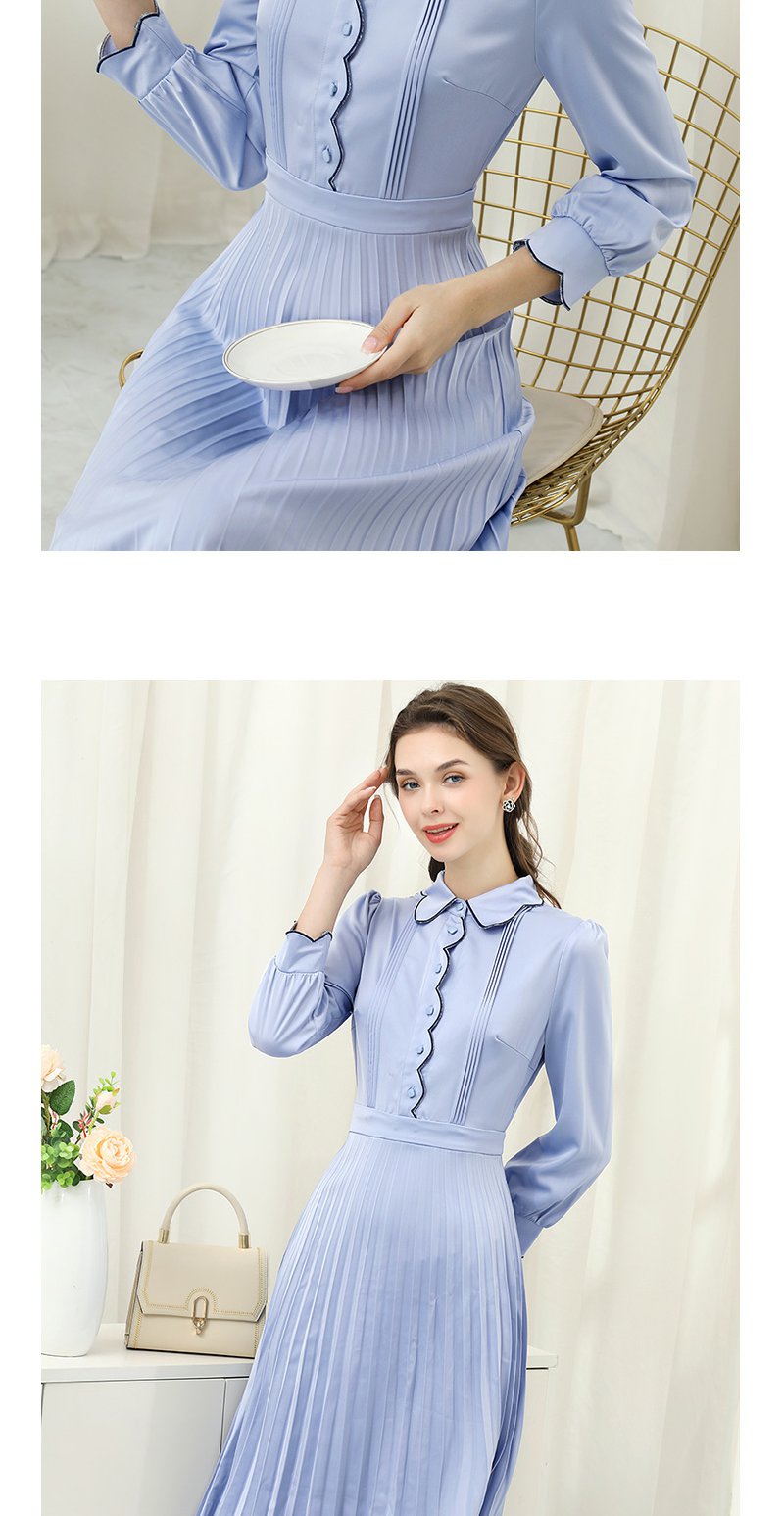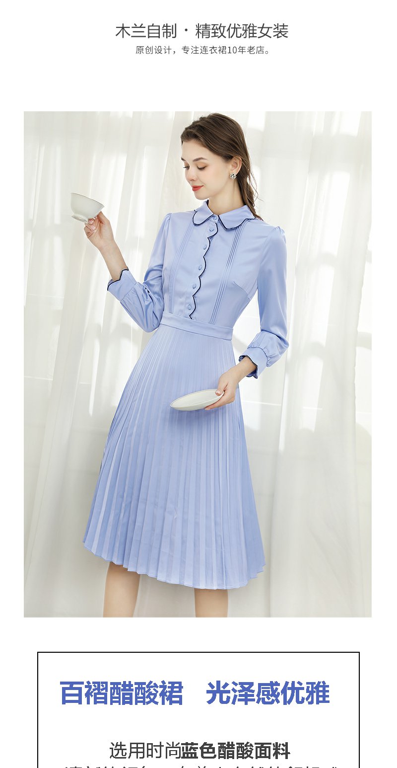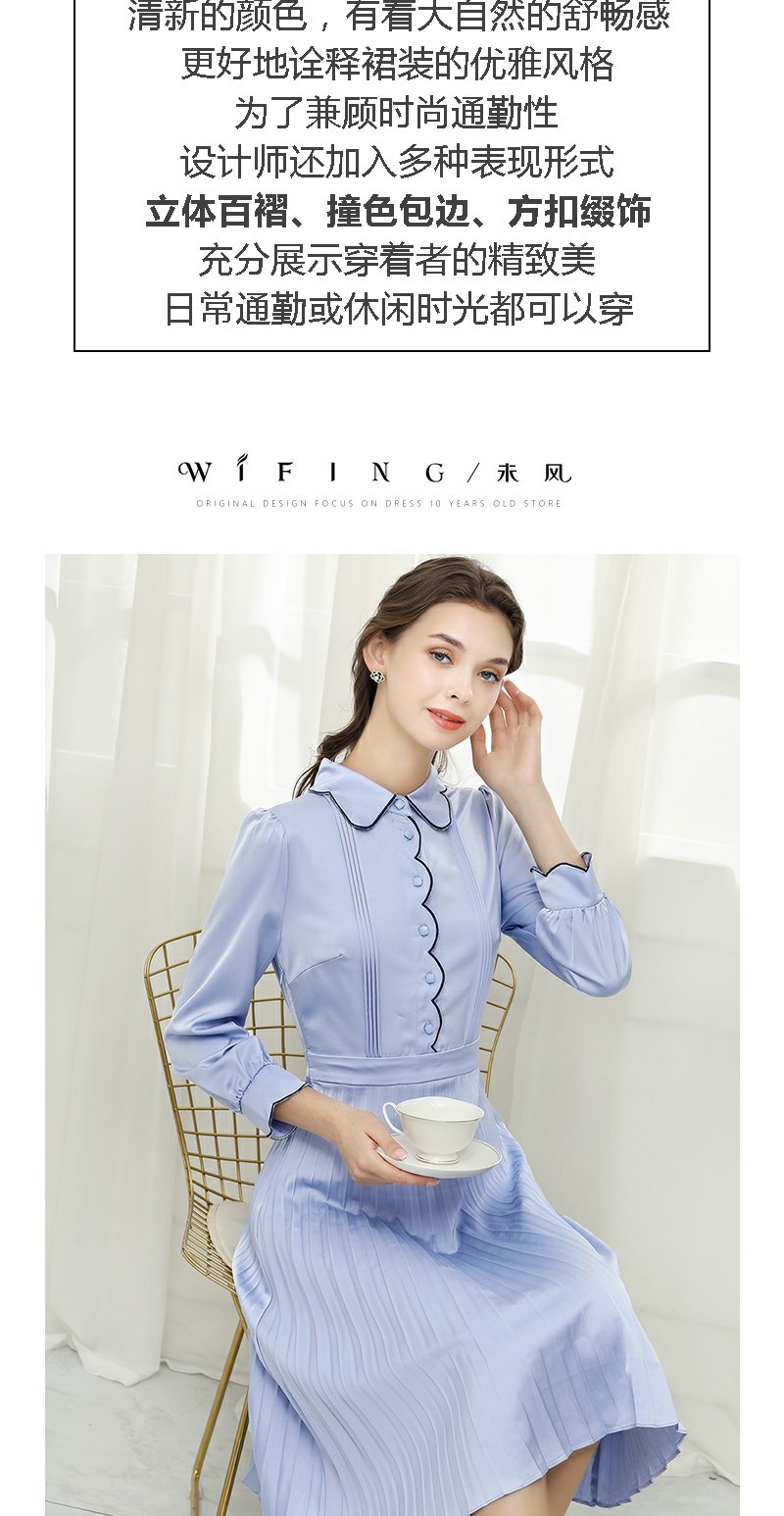 未风蓝色显瘦连衣裙女春2025年春季新款女装气质修身长袖百褶裙子