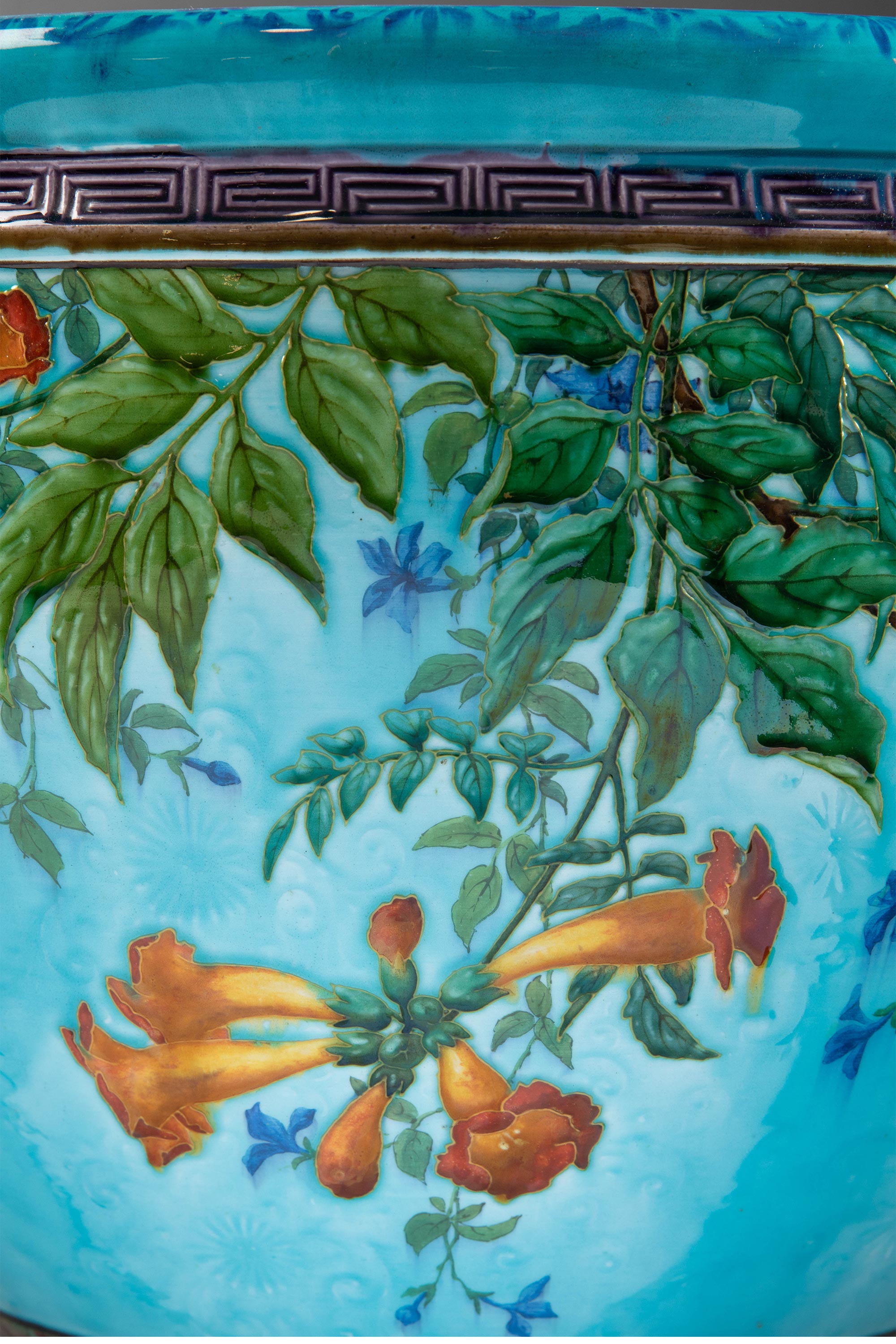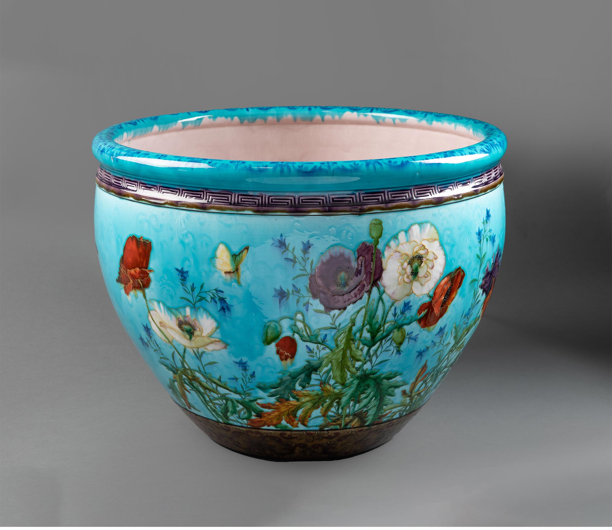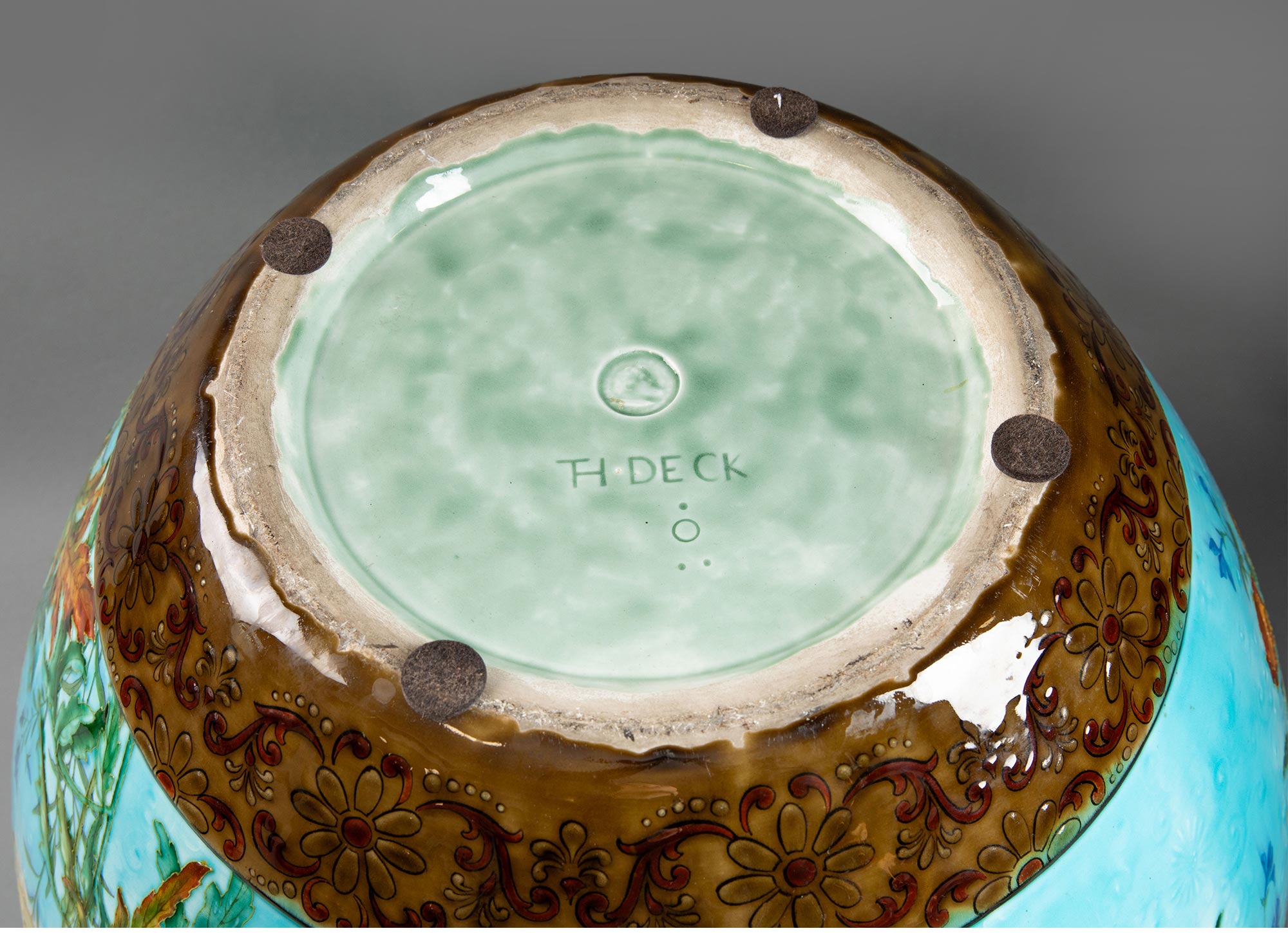 19世纪法国陶艺大师Théodore Deck签名出品东方风格彩蝶花卉主题彩釉陶瓷花盆