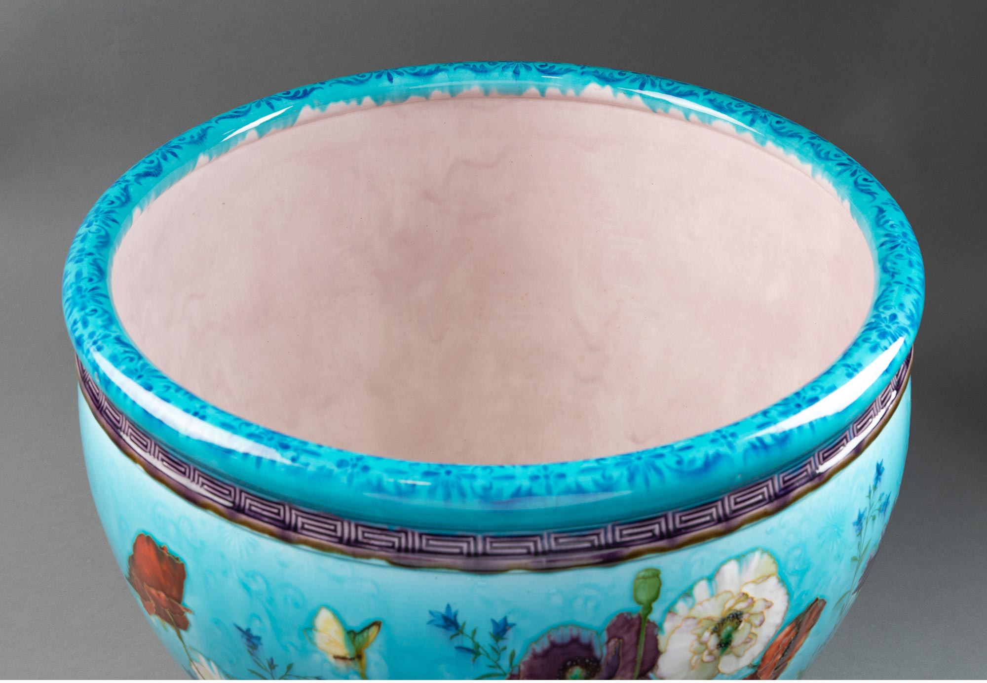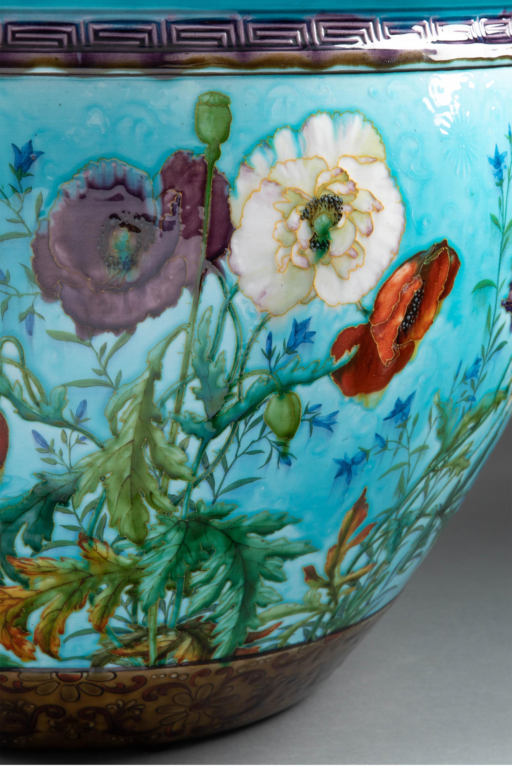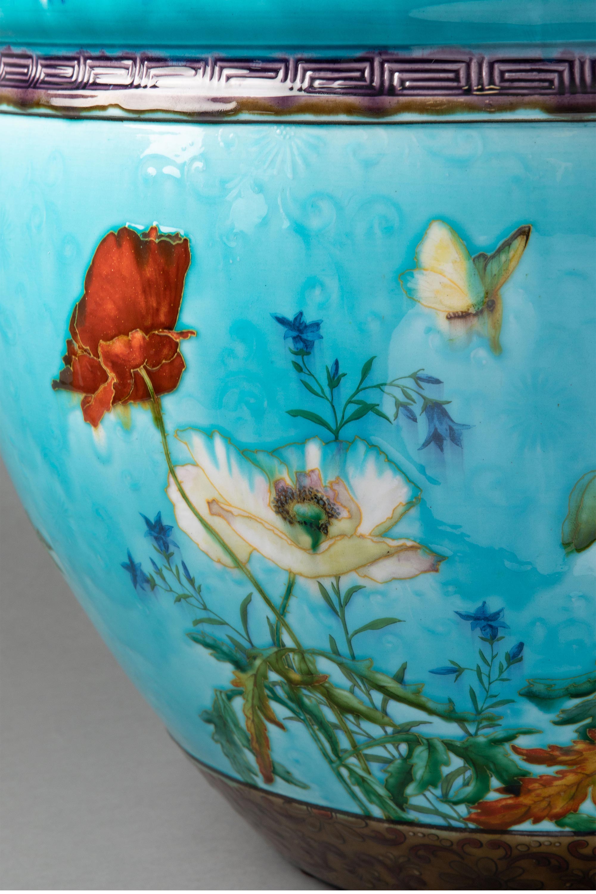 19世纪法国陶艺大师Théodore Deck签名出品东方风格彩蝶花卉主题彩釉陶瓷花盆