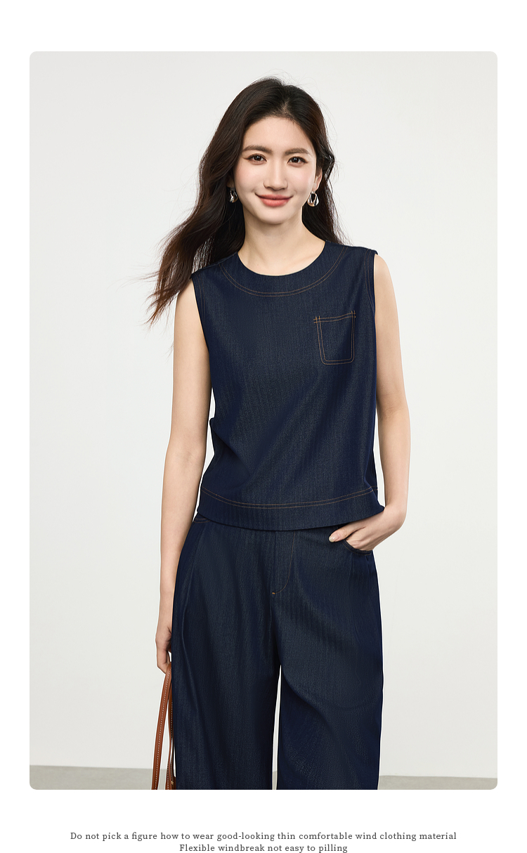 【初夏新品】熙世界高级感仿天丝牛仔套装女夏季通勤复古无袖上衣阔腿裤两件套