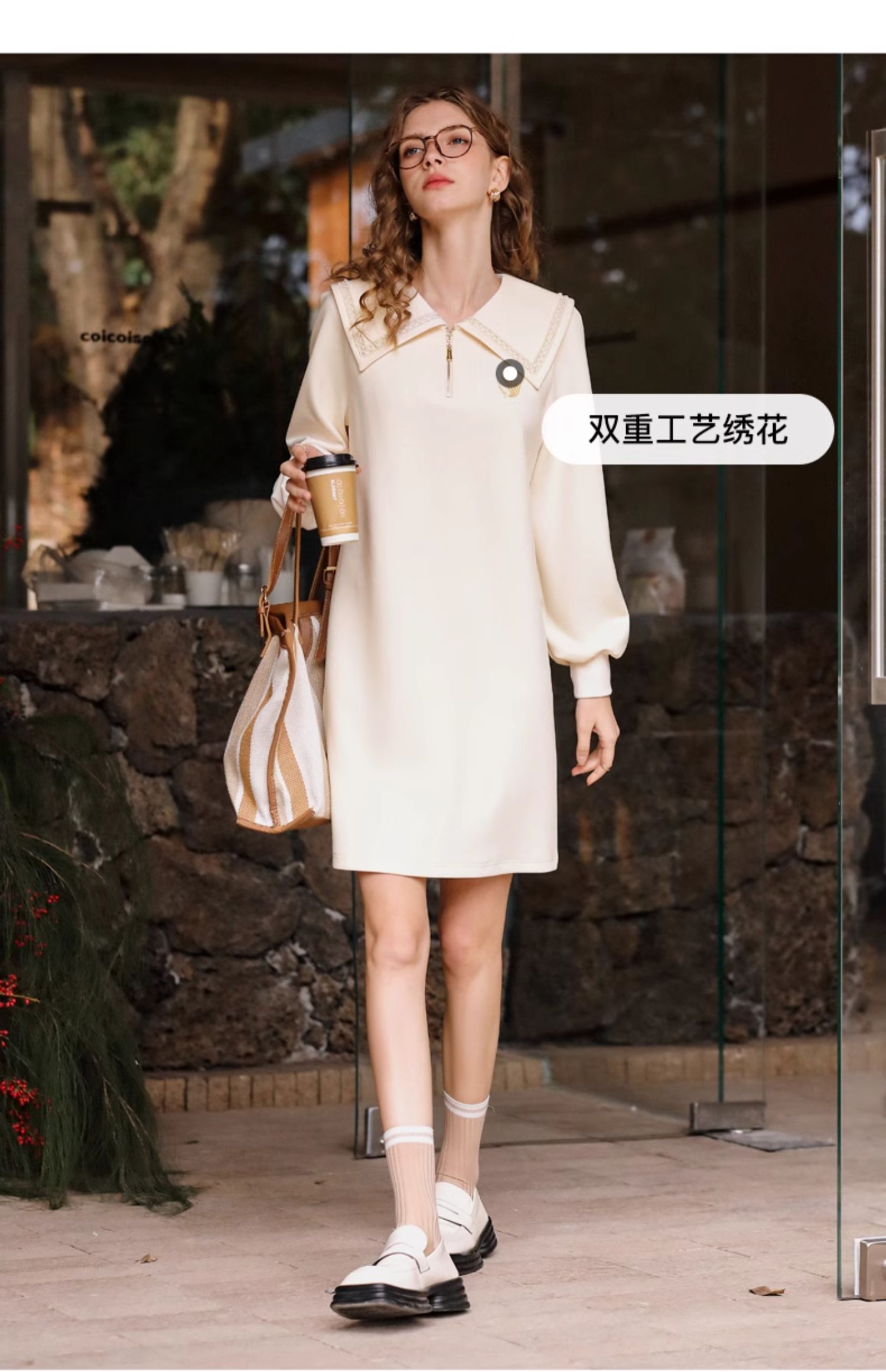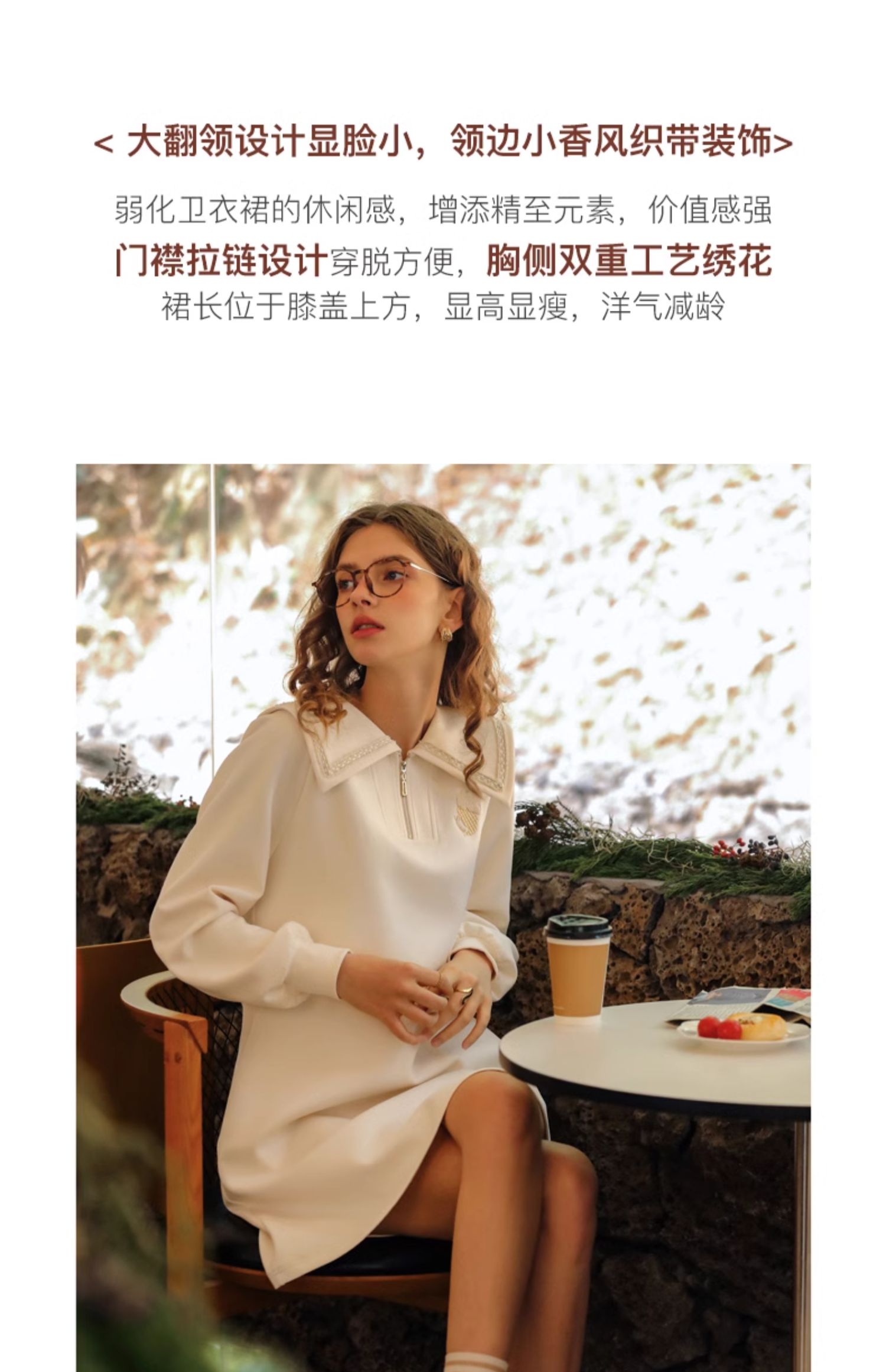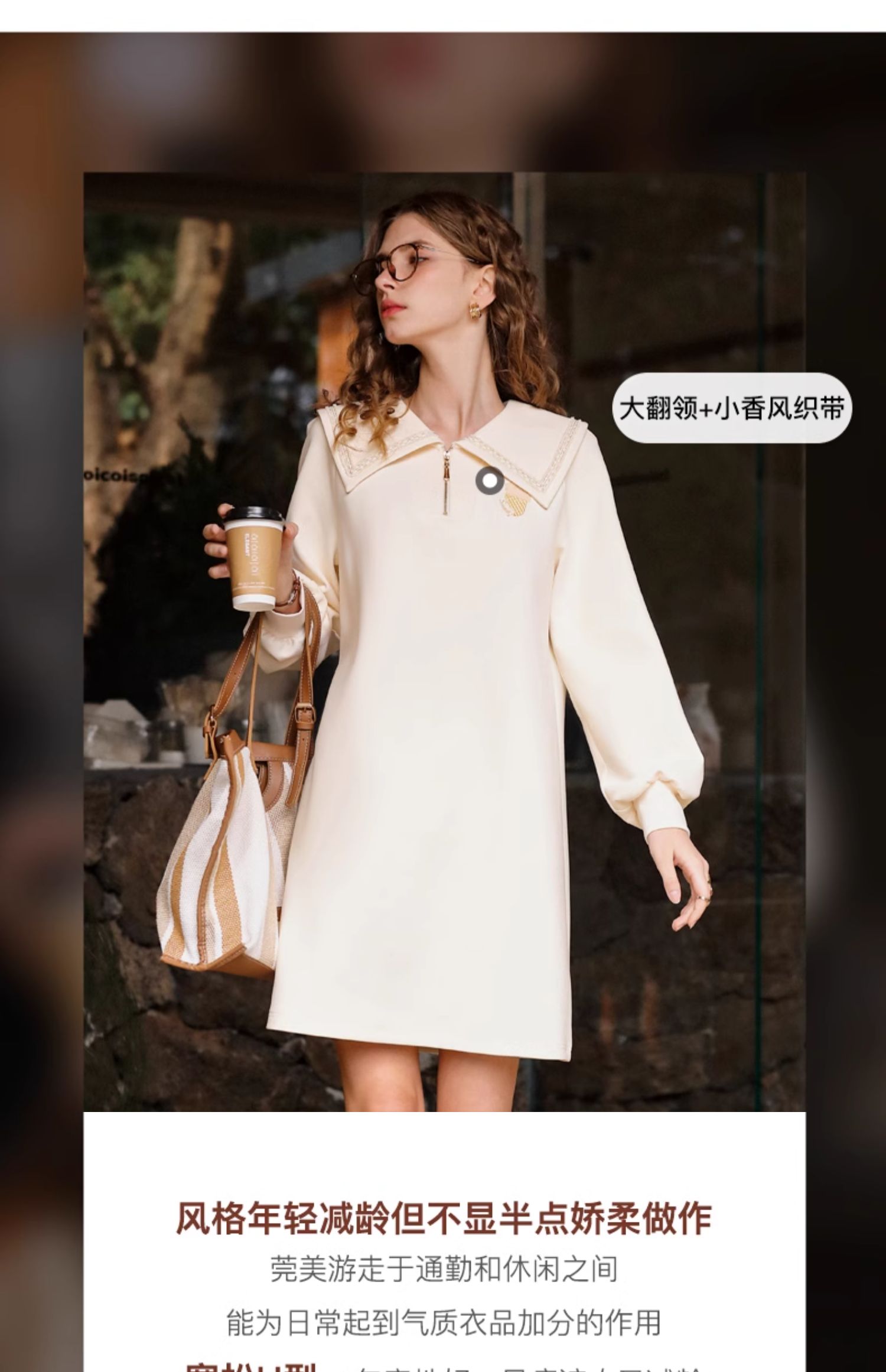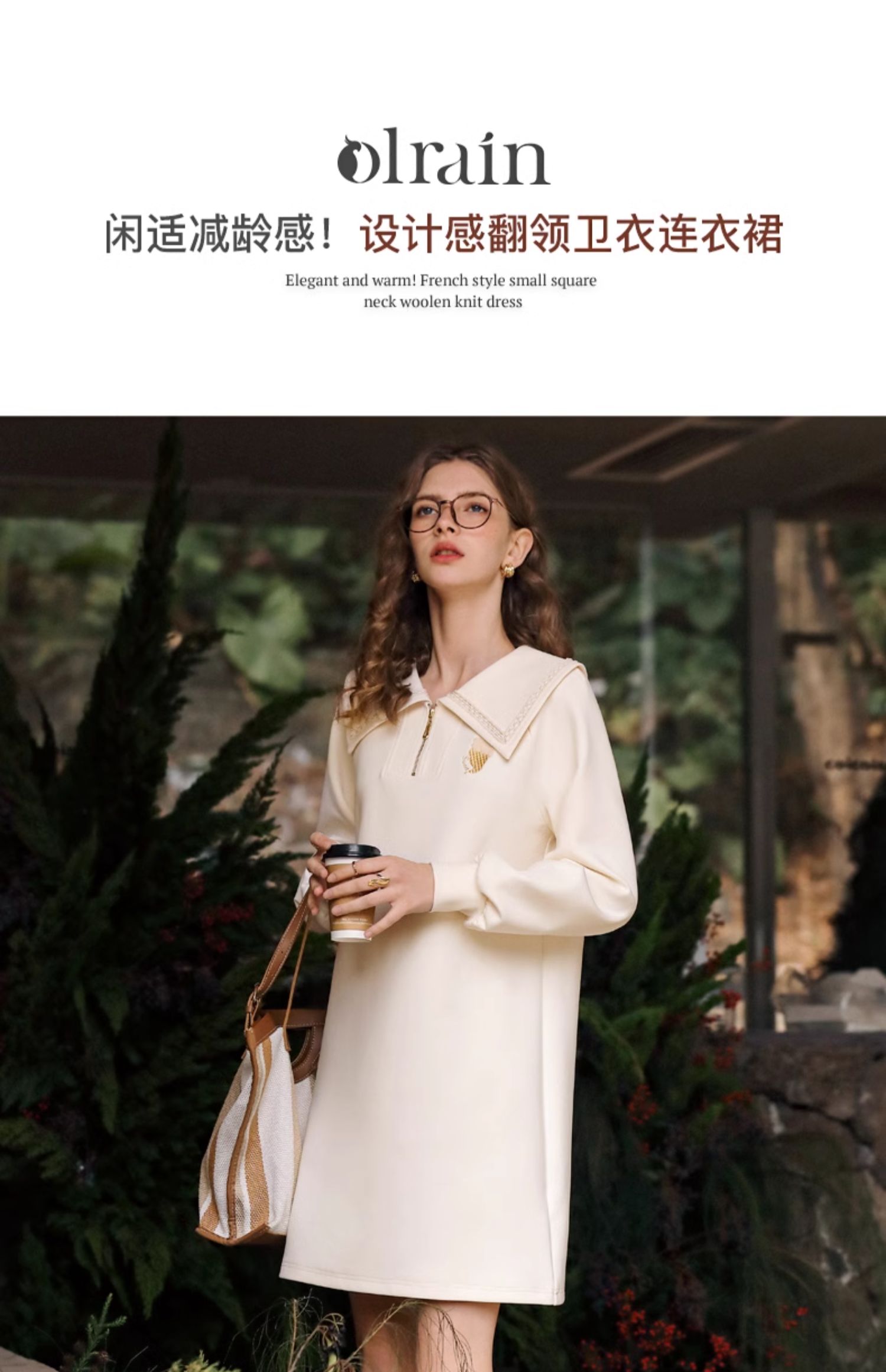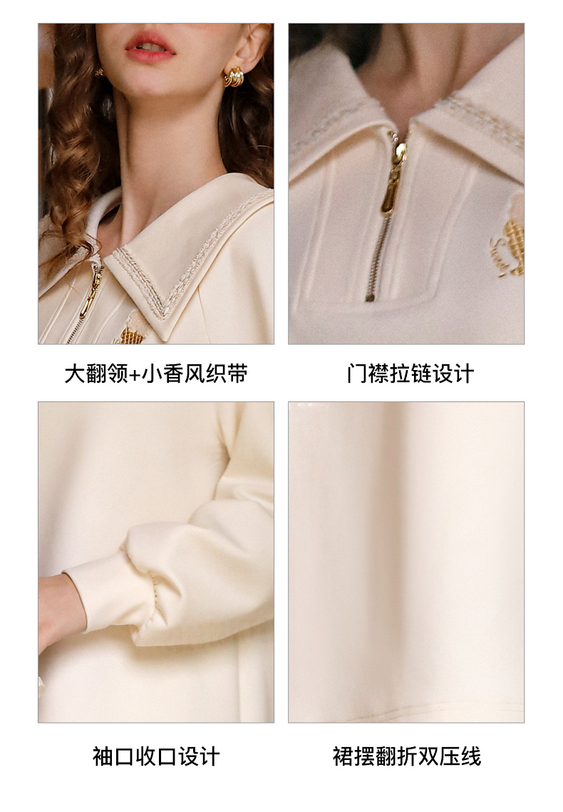 OLrain欧芮儿杏色休闲连衣裙女春季2024年新款设计感翻领卫衣裙