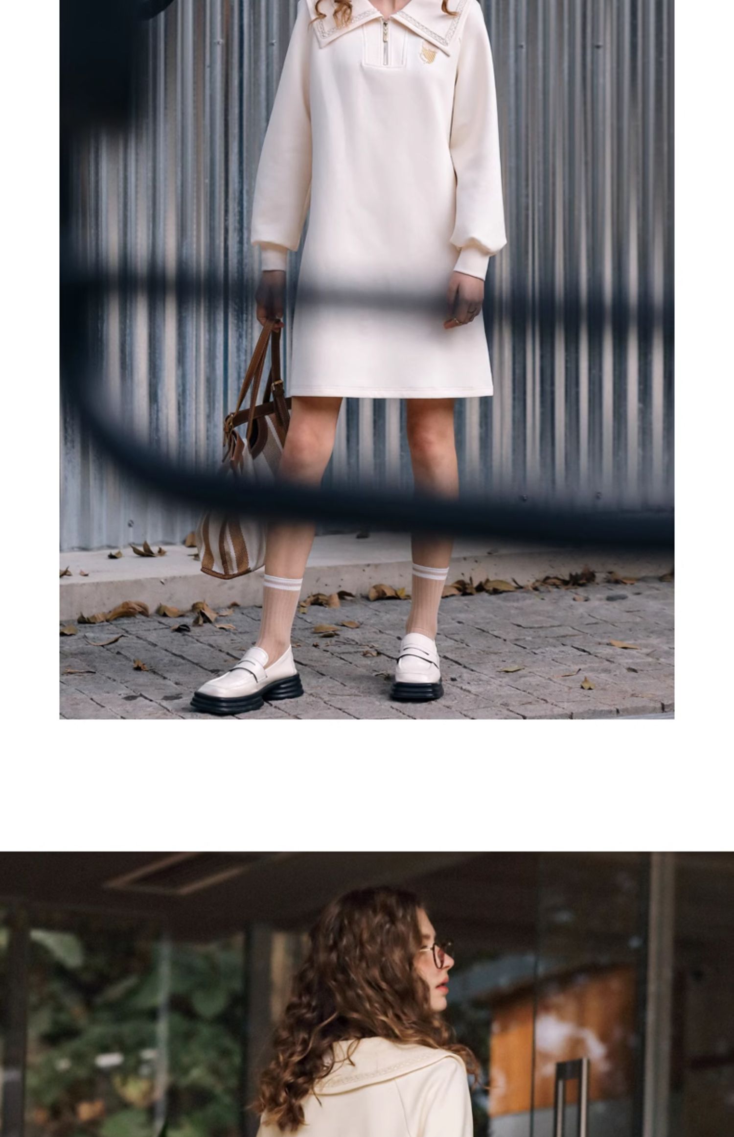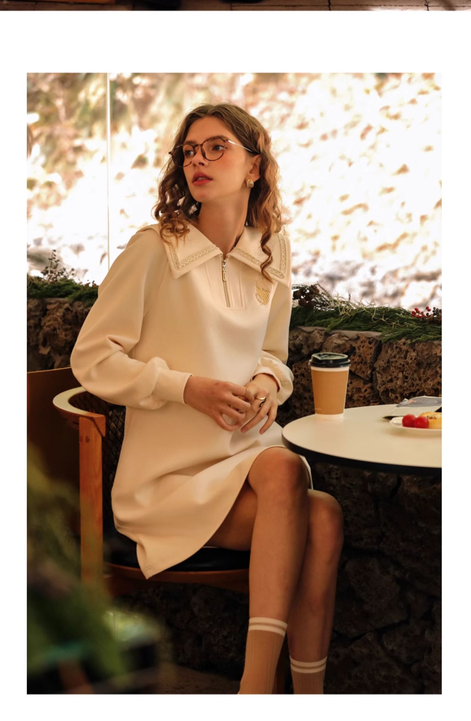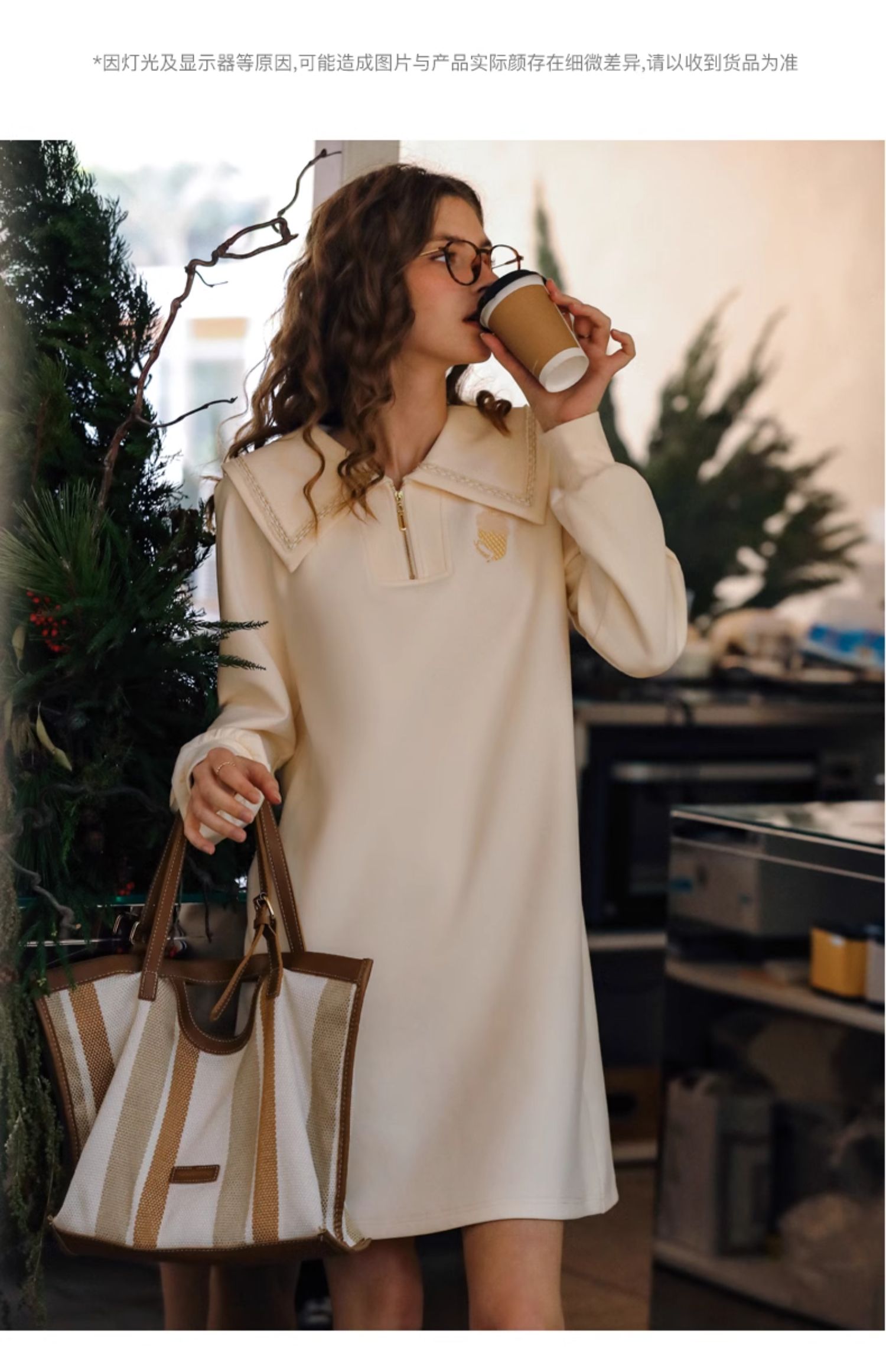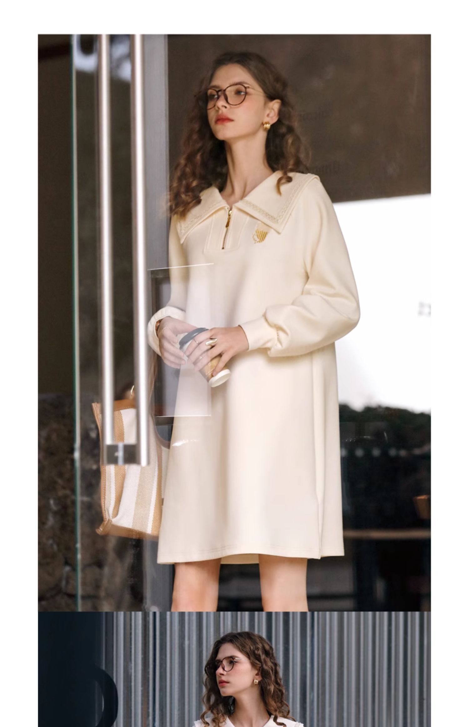 OLrain欧芮儿杏色休闲连衣裙女春季2024年新款设计感翻领卫衣裙