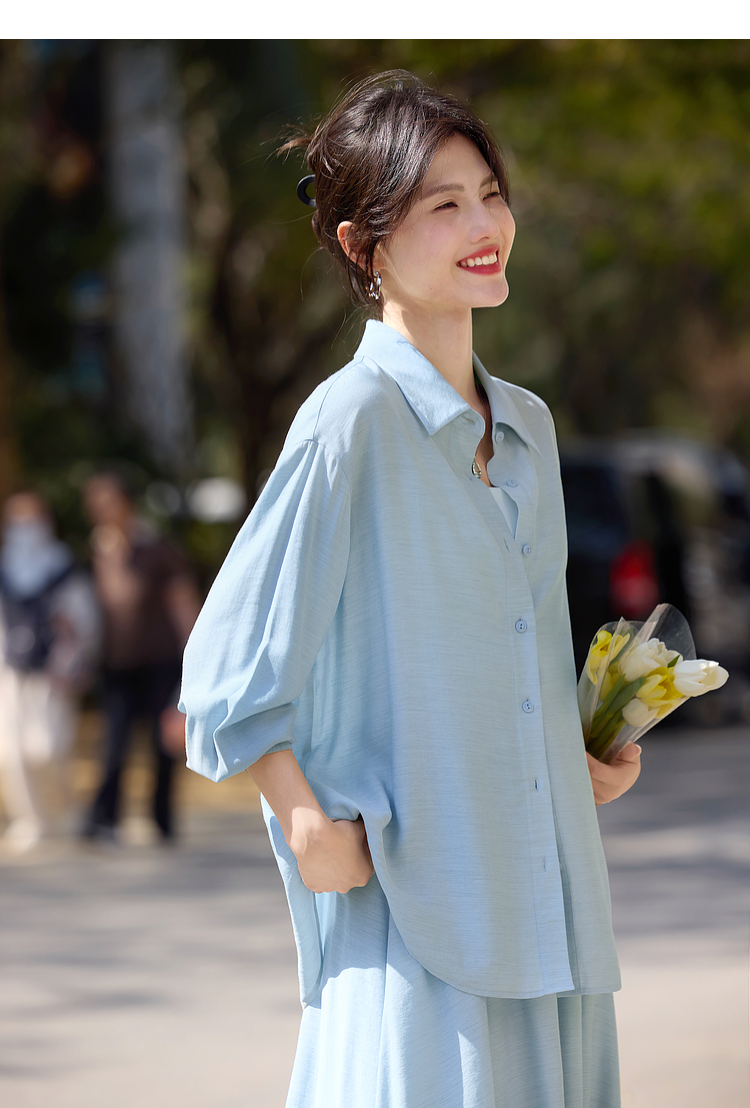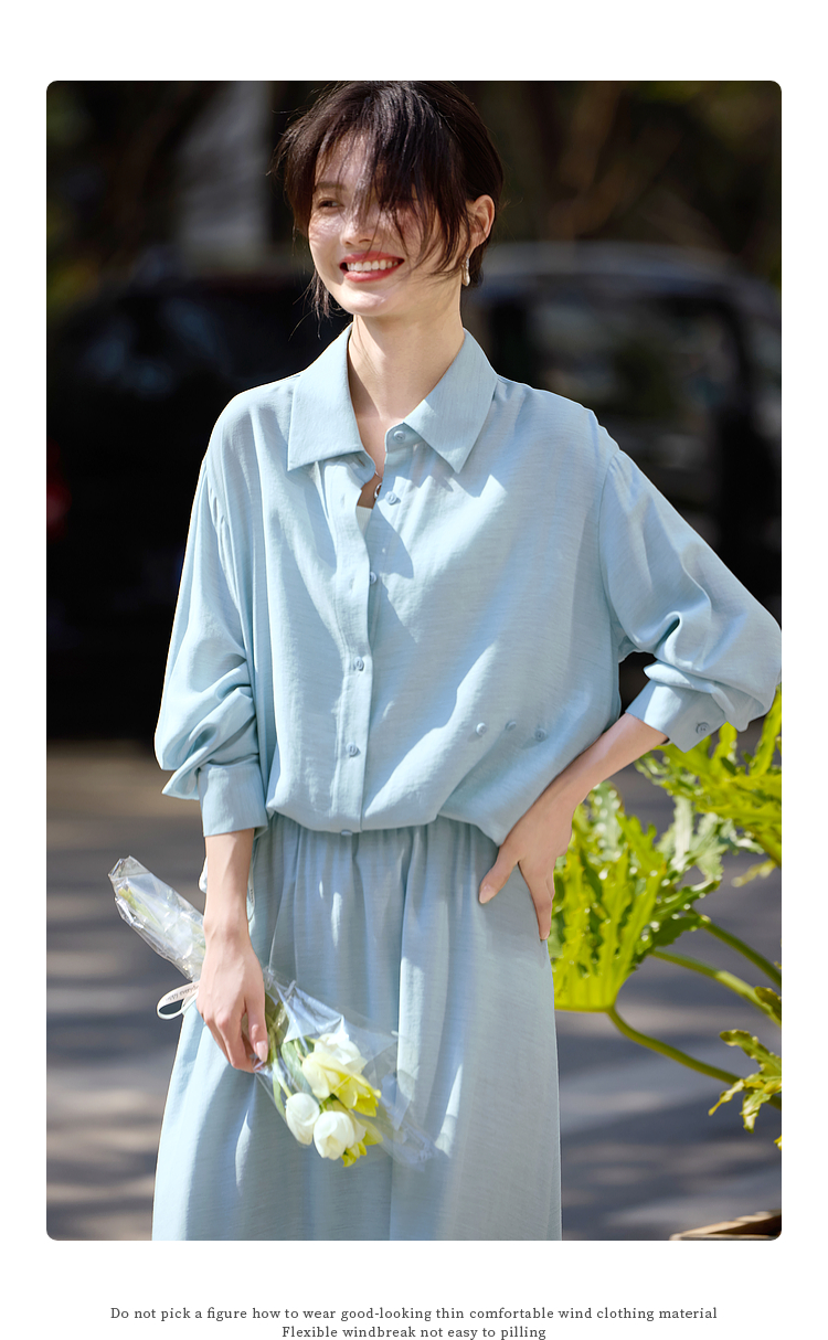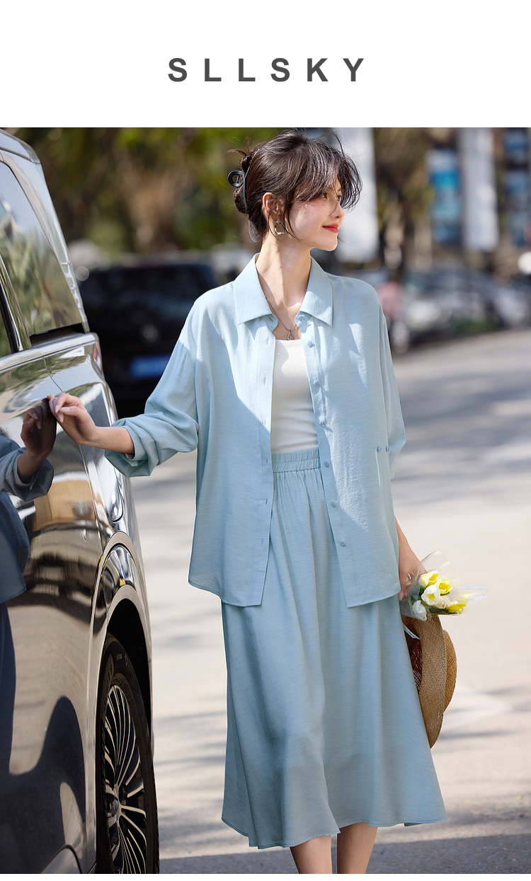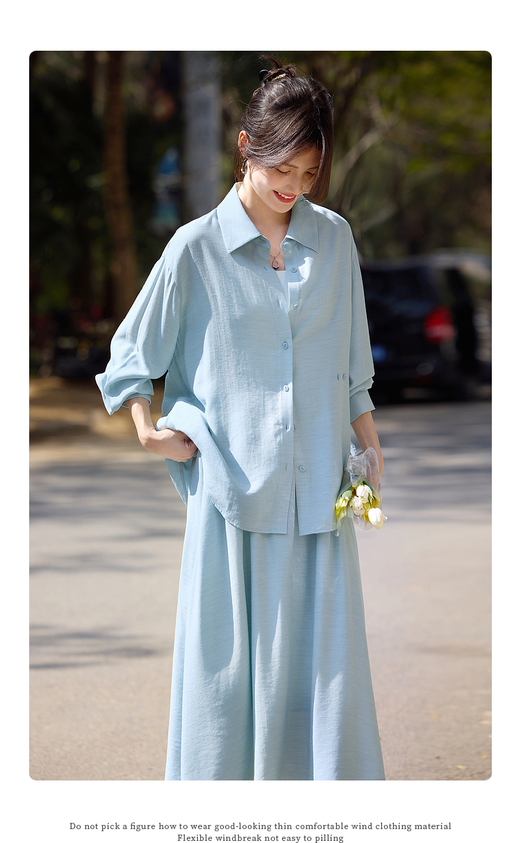 【专属特价】熙世界蓝色长袖防晒衬衫女薄款夏季户外穿搭宽松衬衣半身裙两件套