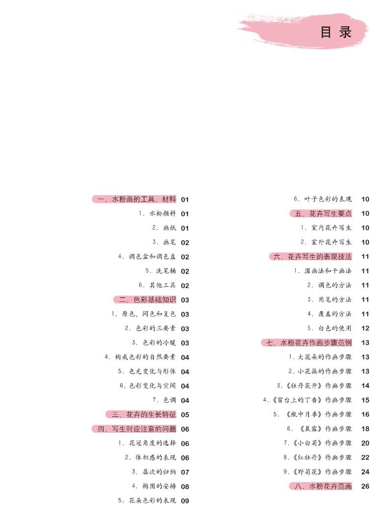 内容简介:《水粉花卉基础》共分三部分:第一部分为水粉花卉作画解析,内容包括花卉写生时需注意的花冠角度的选择、体积感的表现、层次的归纳、构图的安排、色彩的变化规律、室内花卉写生要点、室外花卉写生要点、花卉的干湿表现技法、调色技法、用笔技法、覆盖技法等;第二部分为4幅带步骤图的水粉花卉范画;第三部分为50幅左右的水粉花卉完全范画。本书图片精美,洋溢着浪漫的气息,是一本难得的水粉花卉写生技法图书。
