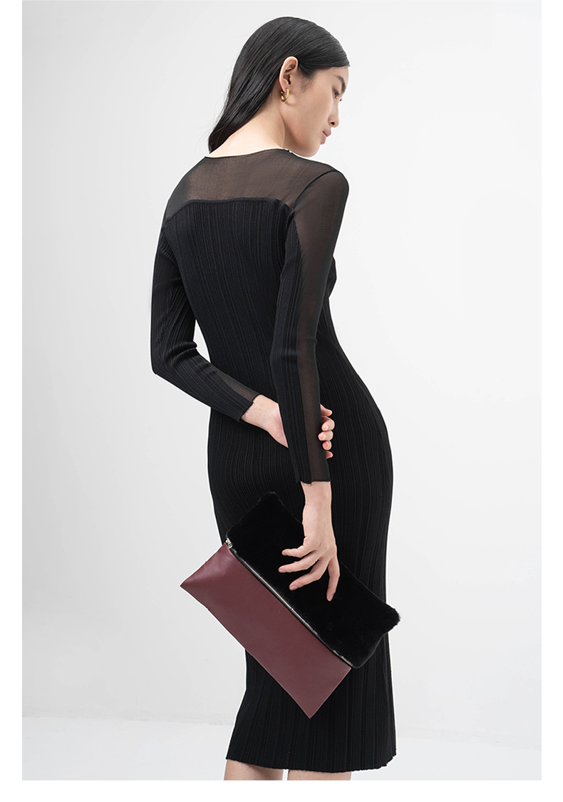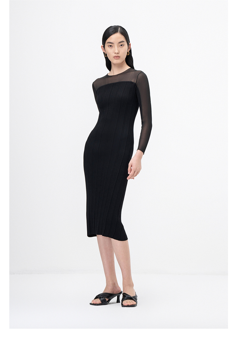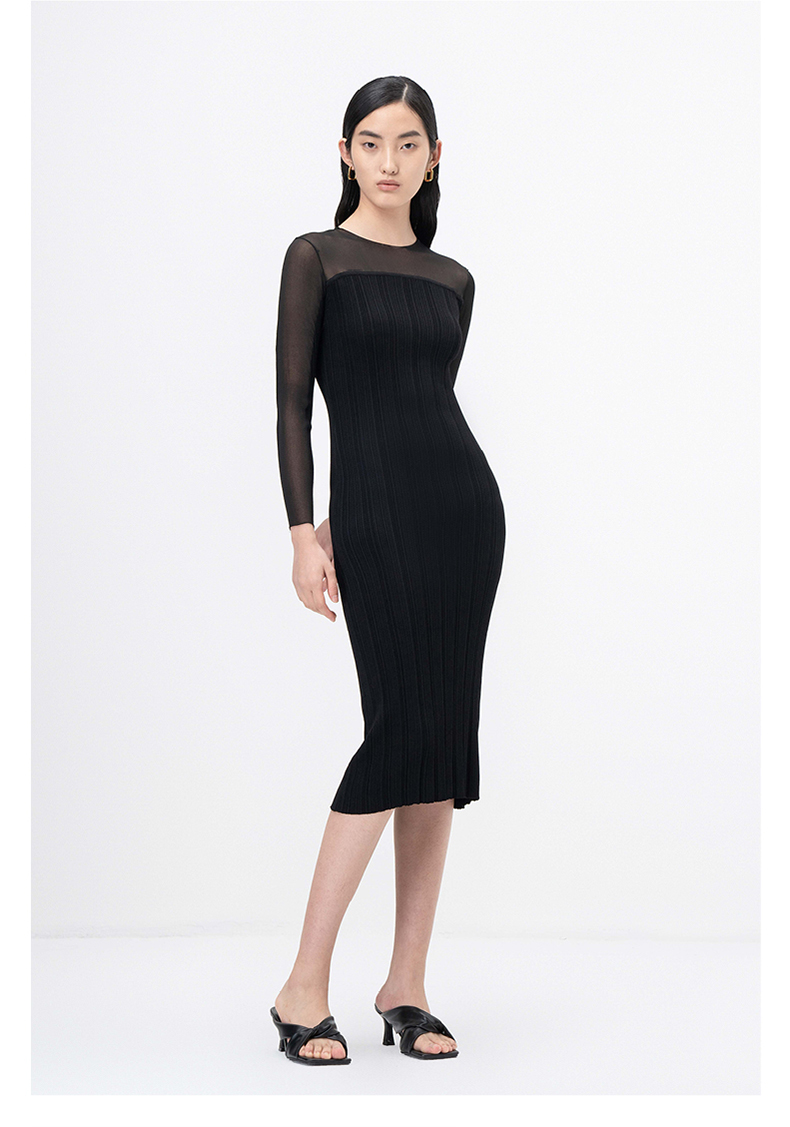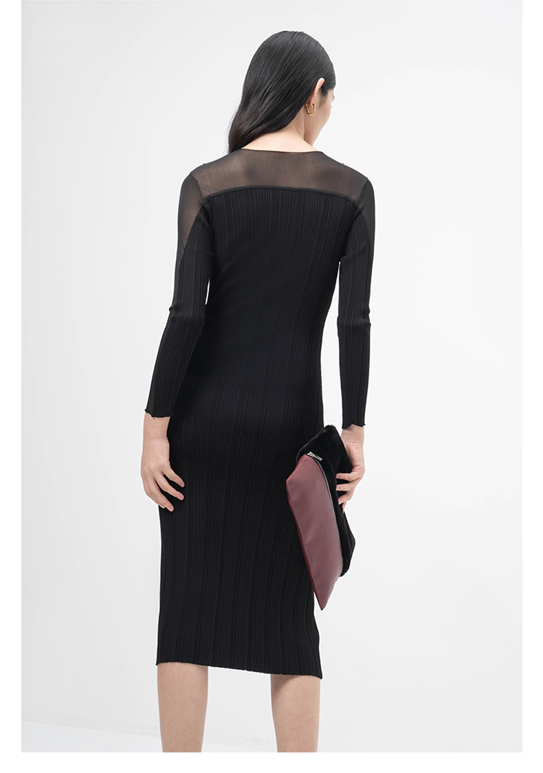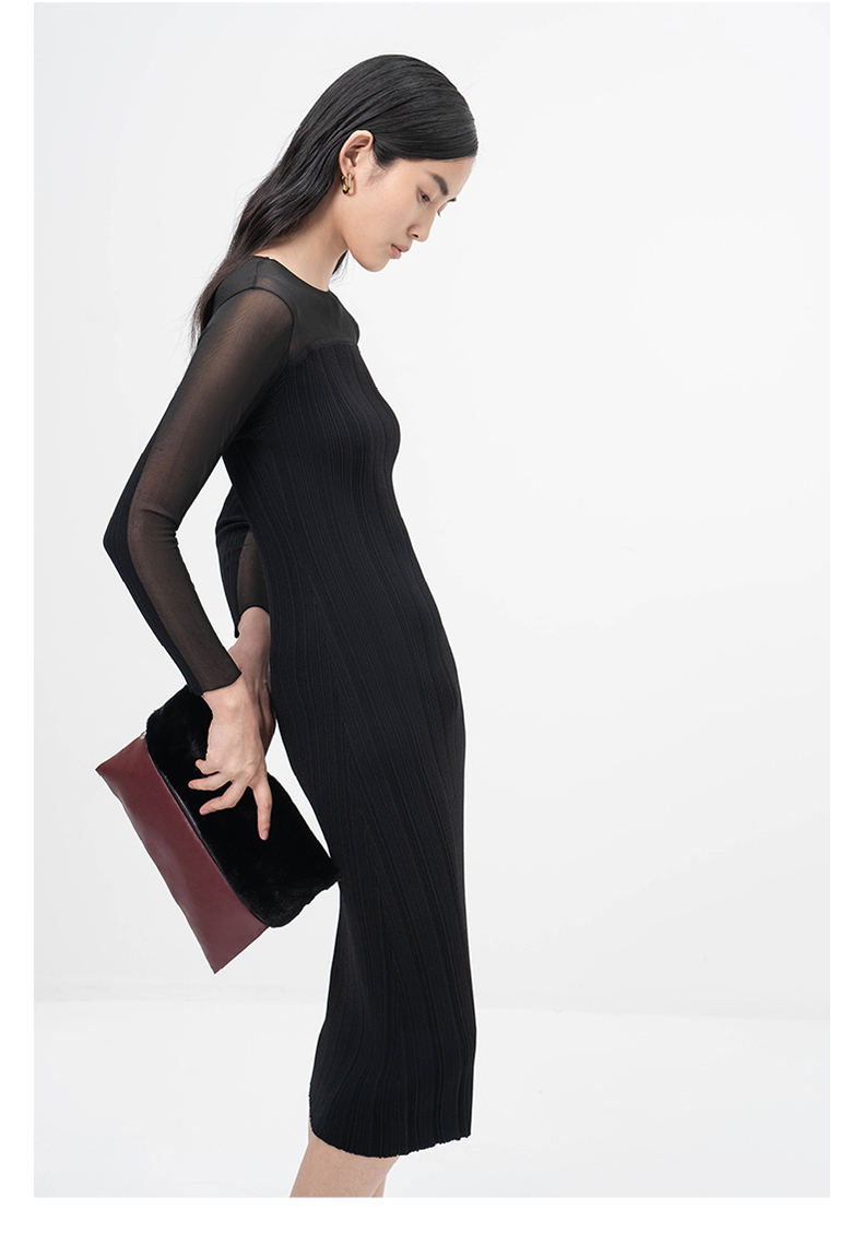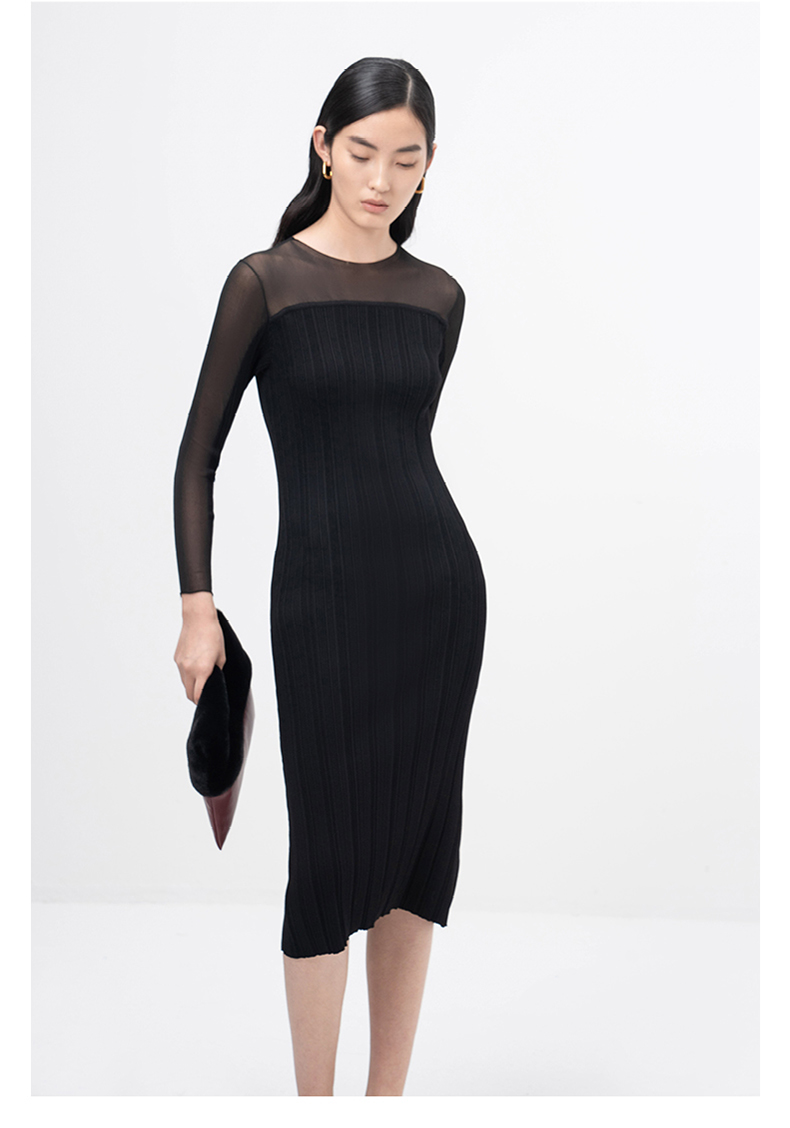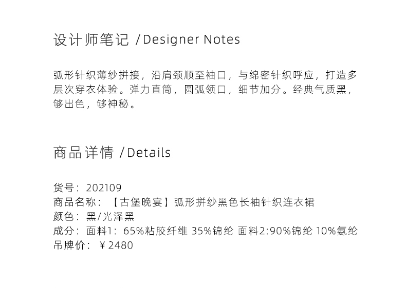 【古堡晚宴】弧形拼纱黑色长袖针织连衣裙/202109