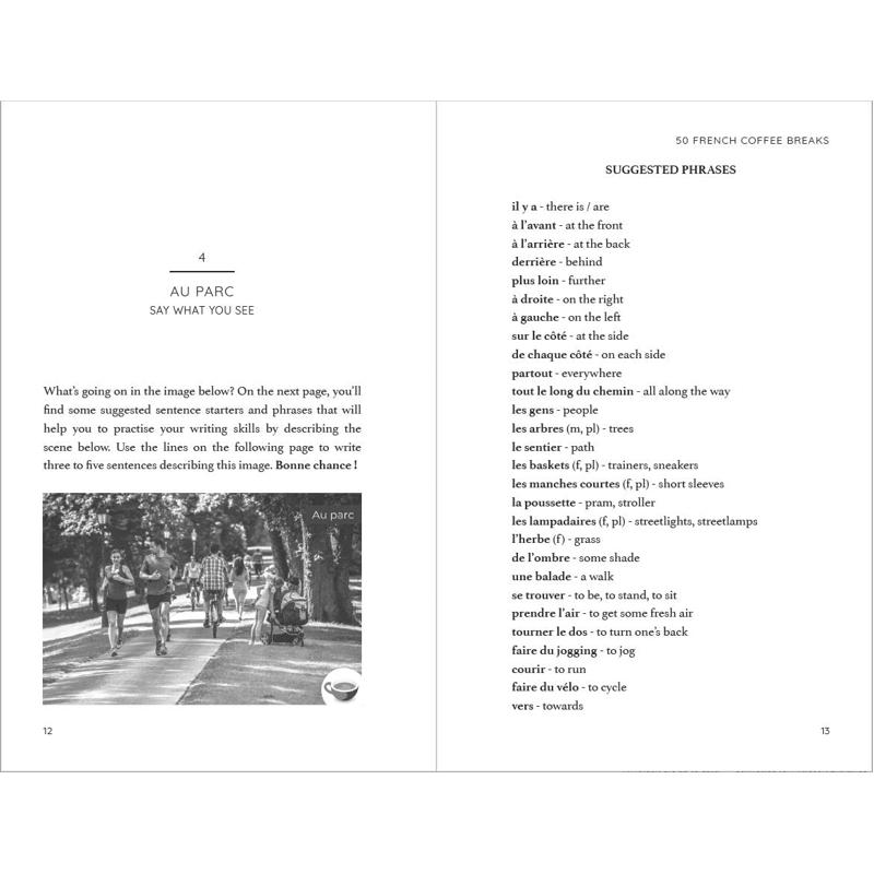 The most successful language learners create a habit of studying on a regular basis. 50 French Coffee Breaks makes it easy to master a simple routine of improving your French by effortlessly integrating it with your calming daily ritual - from a 5-minute espresso to a 15-minute latte.