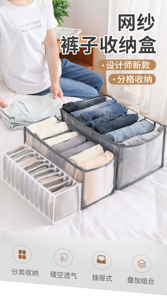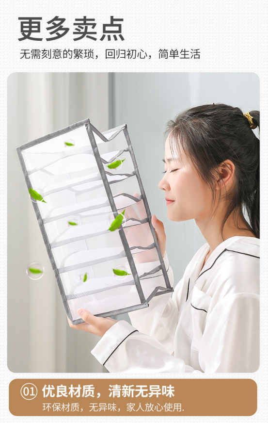 透明网纱 透明可视,寻找衣物十分便捷✔ 大容量设计 固定组合,立体挺括,不易变形✔ 分格收纳 一物一格,放置方便,井然有序✔
