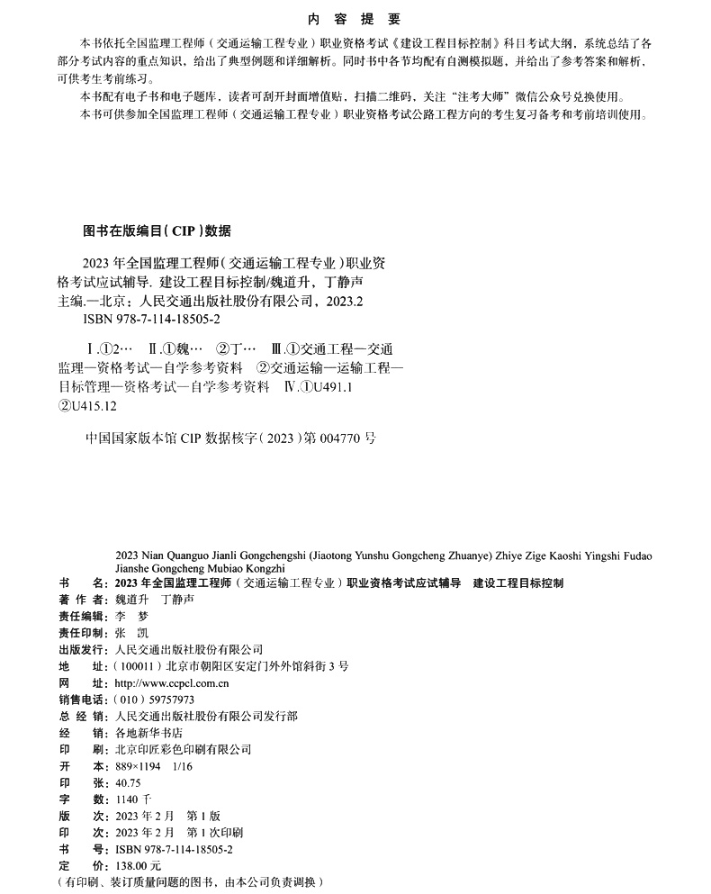 书名:2023年全国监理工程师(交通运输工程专业)职业资格考试应试辅导 建设工程目标控制