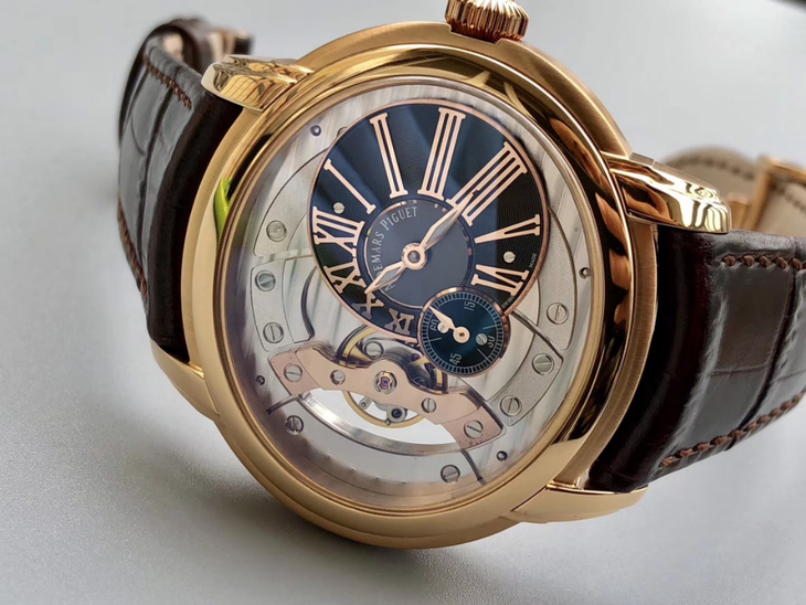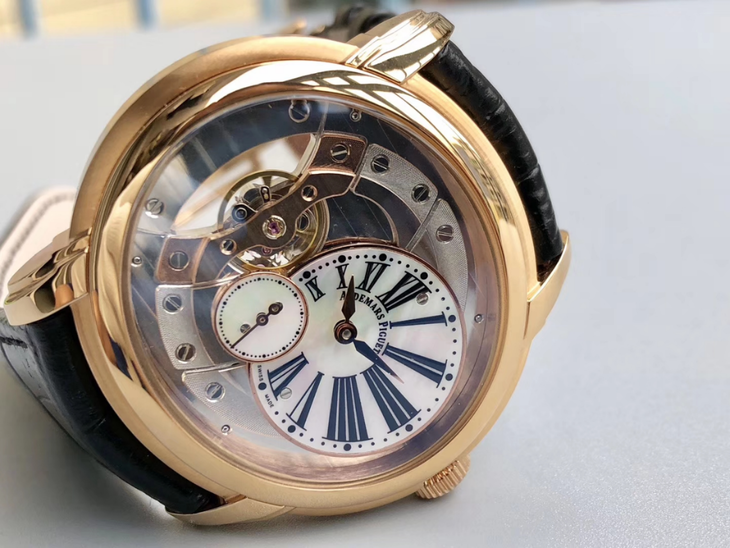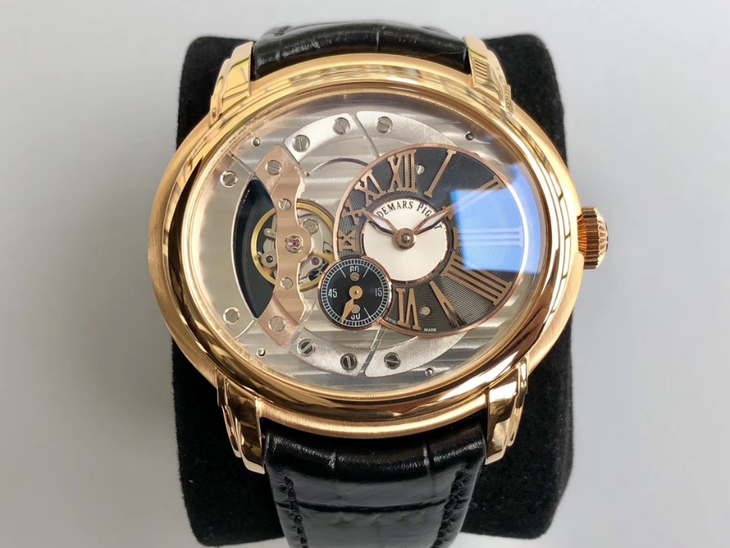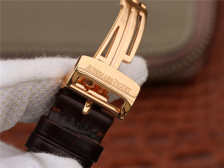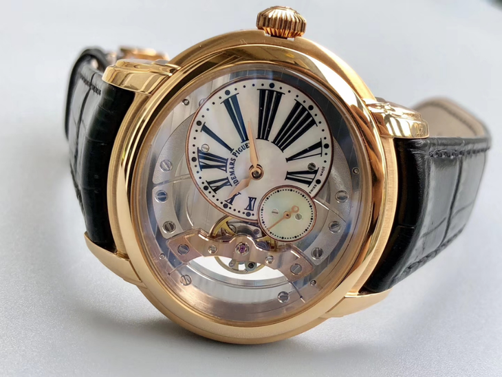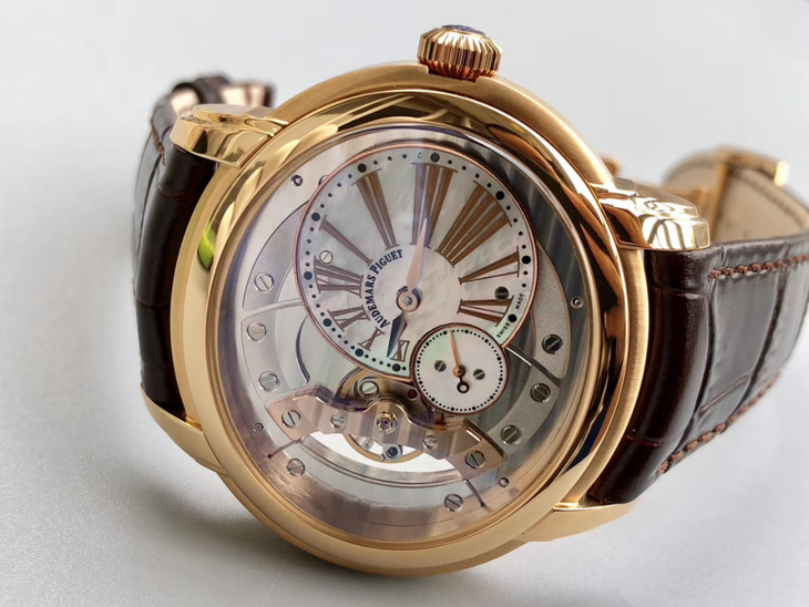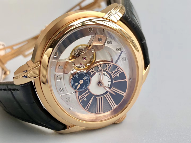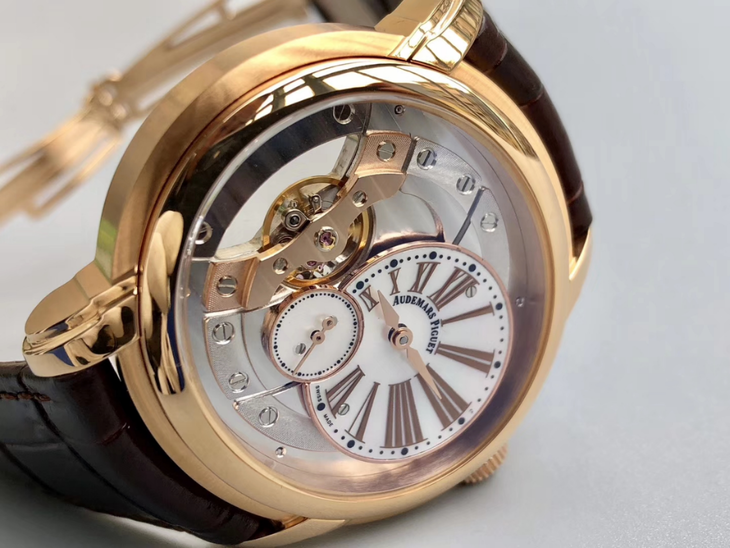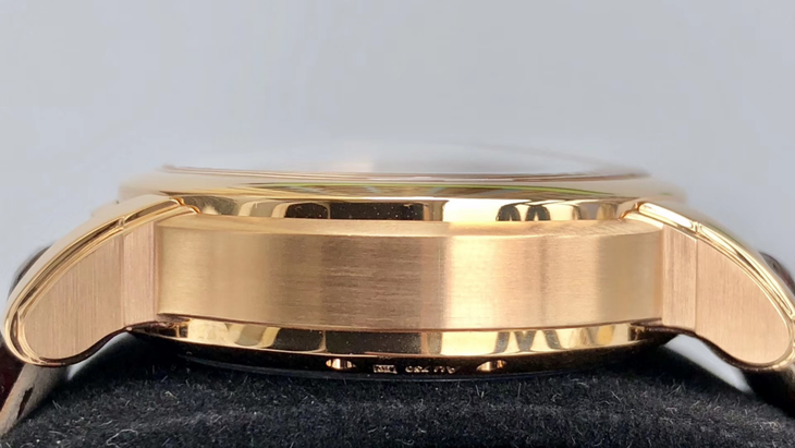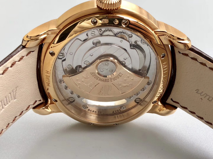 爱彼千禧系列15350款男装腕表,一款上手才知道靓的耐看型手表。不惜重金原装开模,逐个零件开模原装4101机芯,确保高度还原而且保证机芯稳定性。外层铸铜然后镀750金(镀金厚度达到5个丝),不仅接近原装的重量,而且还能持久不掉色。?和原装一样的尺寸:41毫米x47mm,厚度13毫米。表壳完全抄写原装数据,就连螺丝开孔位置和大小都一样。圈口、底盖、镜片等等零部件都时可以和原装通用的。这绝对是镂空复杂复刻表的一个新高度,向原装致敬。
