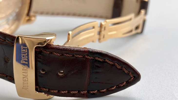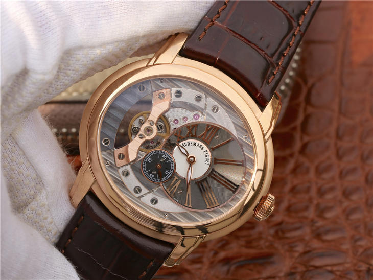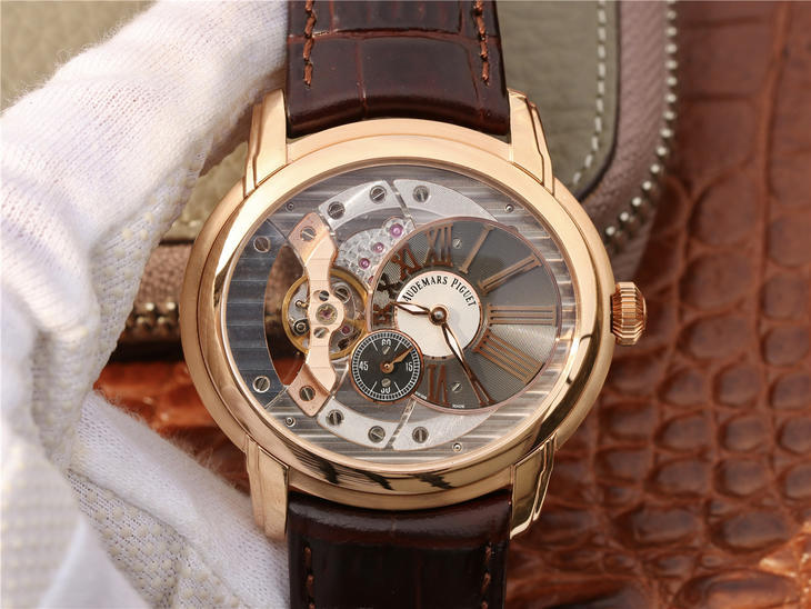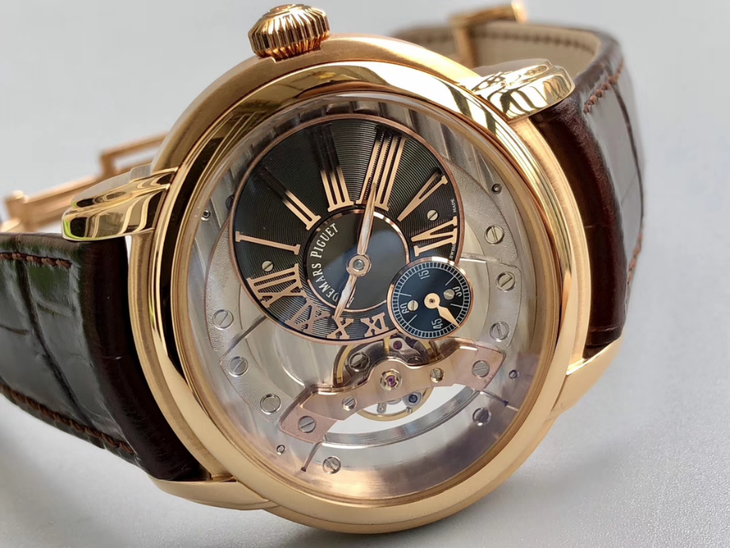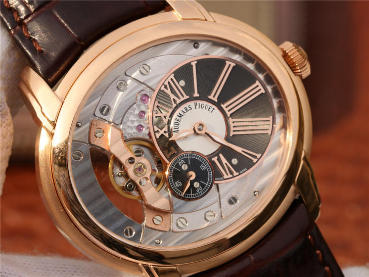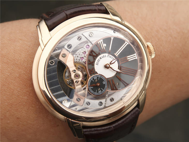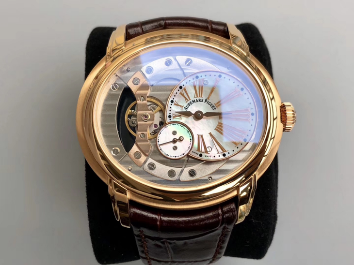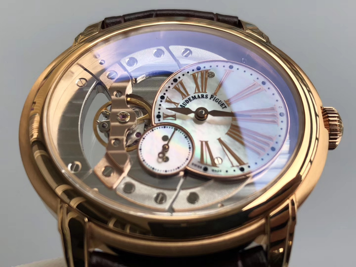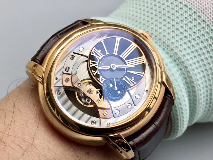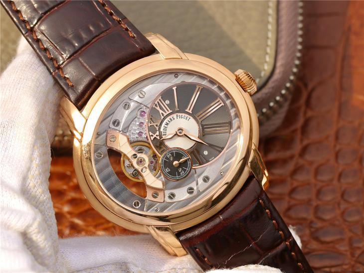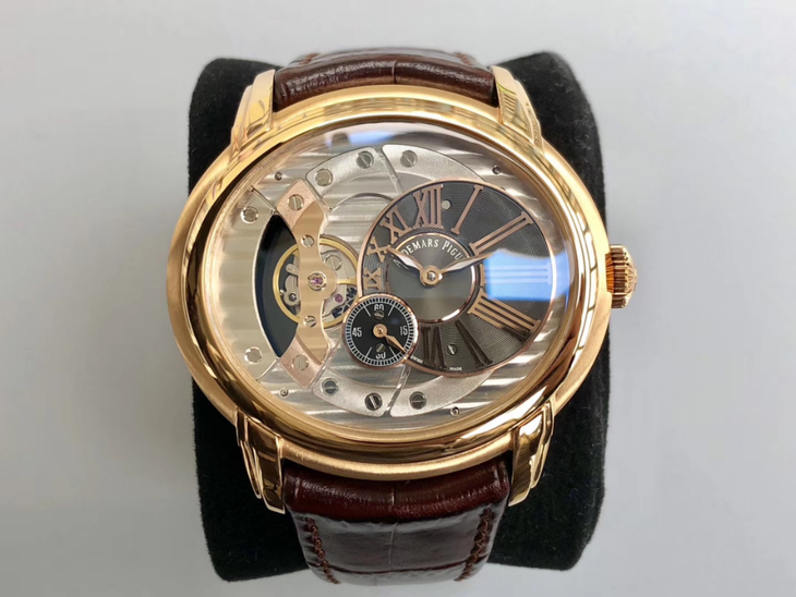 爱彼千禧系列15350款男装腕表,一款上手才知道靓的耐看型手表。不惜重金原装开模,逐个零件开模原装4101机芯,确保高度还原而且保证机芯稳定性。外层铸铜然后镀750金(镀金厚度达到5个丝),不仅接近原装的重量,而且还能持久不掉色。?和原装一样的尺寸:41毫米x47mm,厚度13毫米。表壳完全抄写原装数据,就连螺丝开孔位置和大小都一样。圈口、底盖、镜片等等零部件都时可以和原装通用的。这绝对是镂空复杂复刻表的一个新高度,向原装致敬。