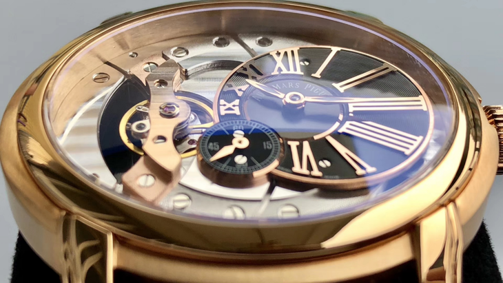 1、机芯架构:自制的原版Cal.4101机芯采用了同原装一样的“扭转乾坤”的结构,使向来隐藏于表壳深处的机械装置显露于表面。为了达成这个目的,摆轮、擒纵叉和擒纵系统等调节组件均经过重新设计。12道桥板在机芯表面,这些用来固定不同组件的桥板在表面上三道平行的弧线,桥板上的横向日内瓦波纹、珍珠圆点打磨、蜗形螺纹等细腻的装饰与多层次的机芯结构全部还原。分布于表面左侧的外露螺丝呼应着横椭圆形表壳的弧线,表盘10、11、12点钟时标的上方圆球形红宝石,这所有的细节都还原了,向国内顶级轻工业致敬。