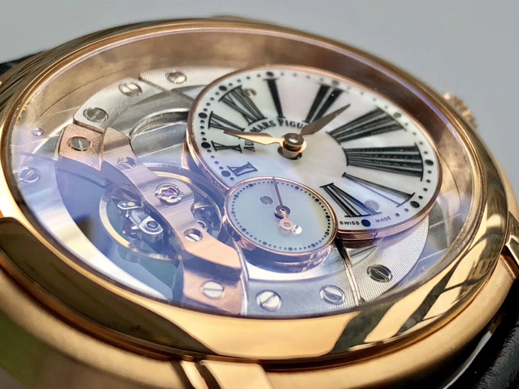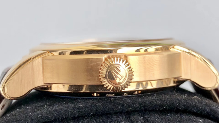 2、字面:这款表看似一张字面,实际工艺工时达到三张字面,每个罗马丁都单独抄写开模,字体位置、大小和原装完全吻合。采用和原装一样的高端填油镀釉工艺,以确保字面的光泽色度一致,坚持字面就是门面理念,质感比原装有过而无不及。镜面和原装一样为拱形蓝宝石玻璃,耐刮而且具有高通透性。