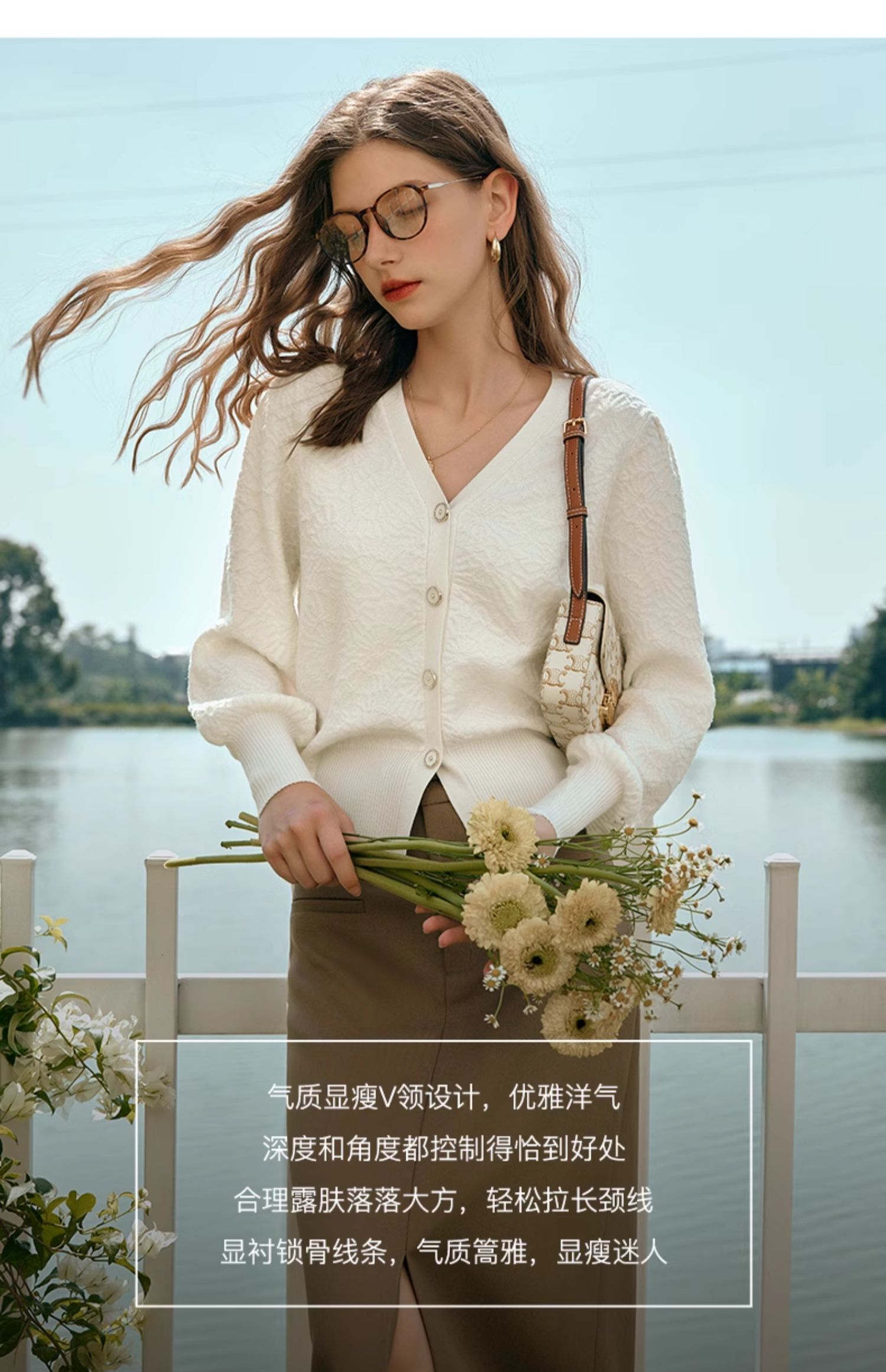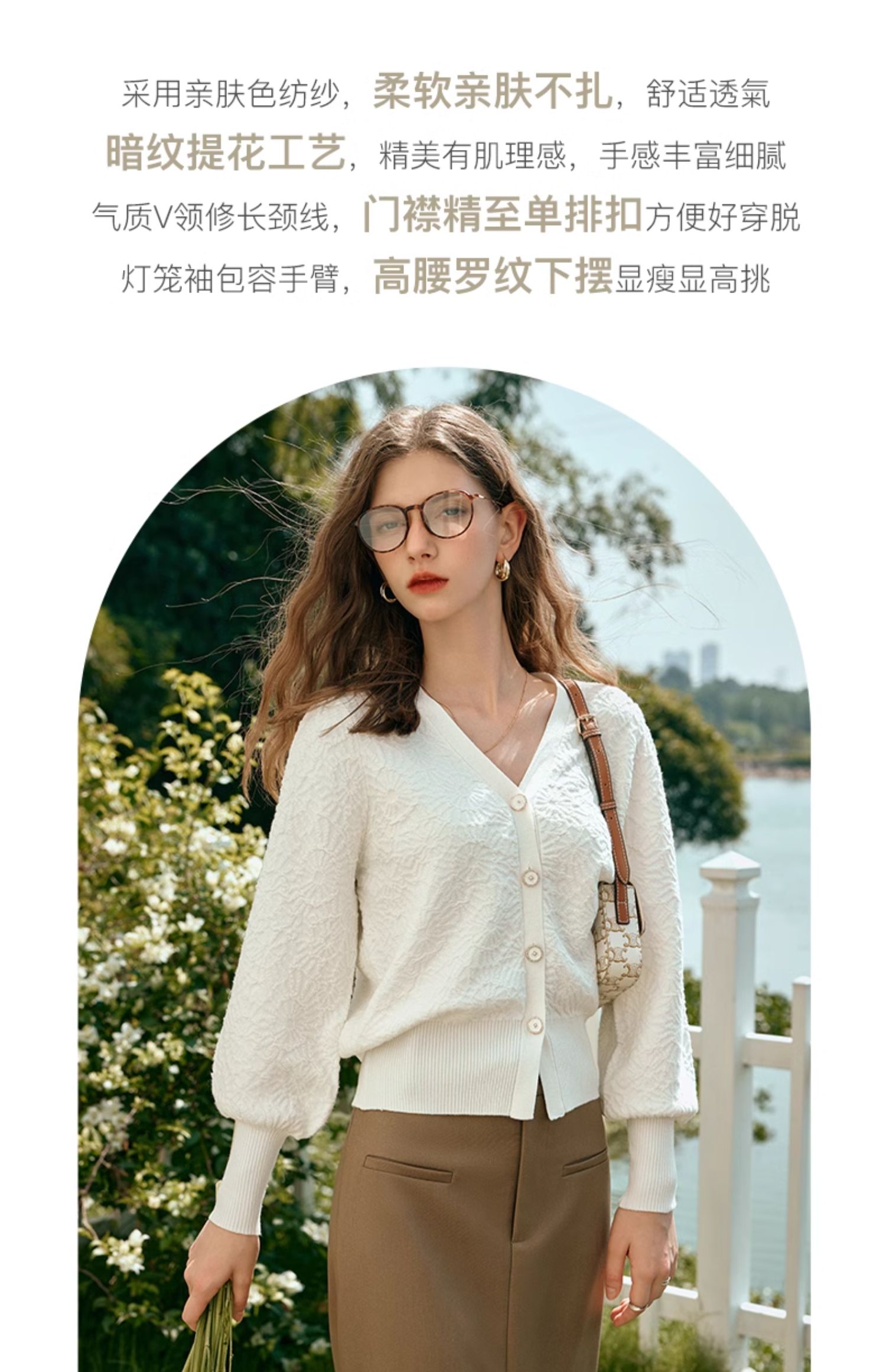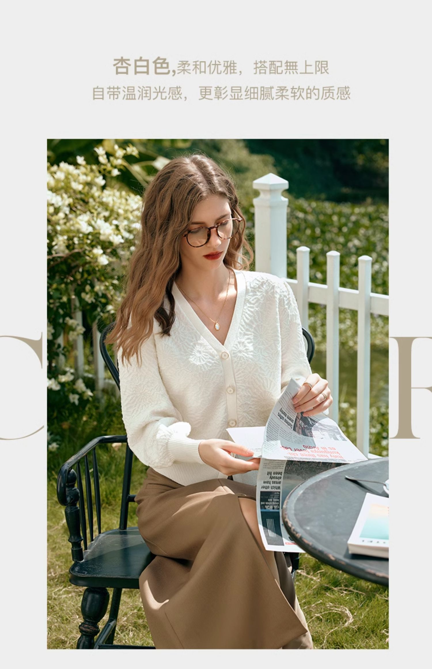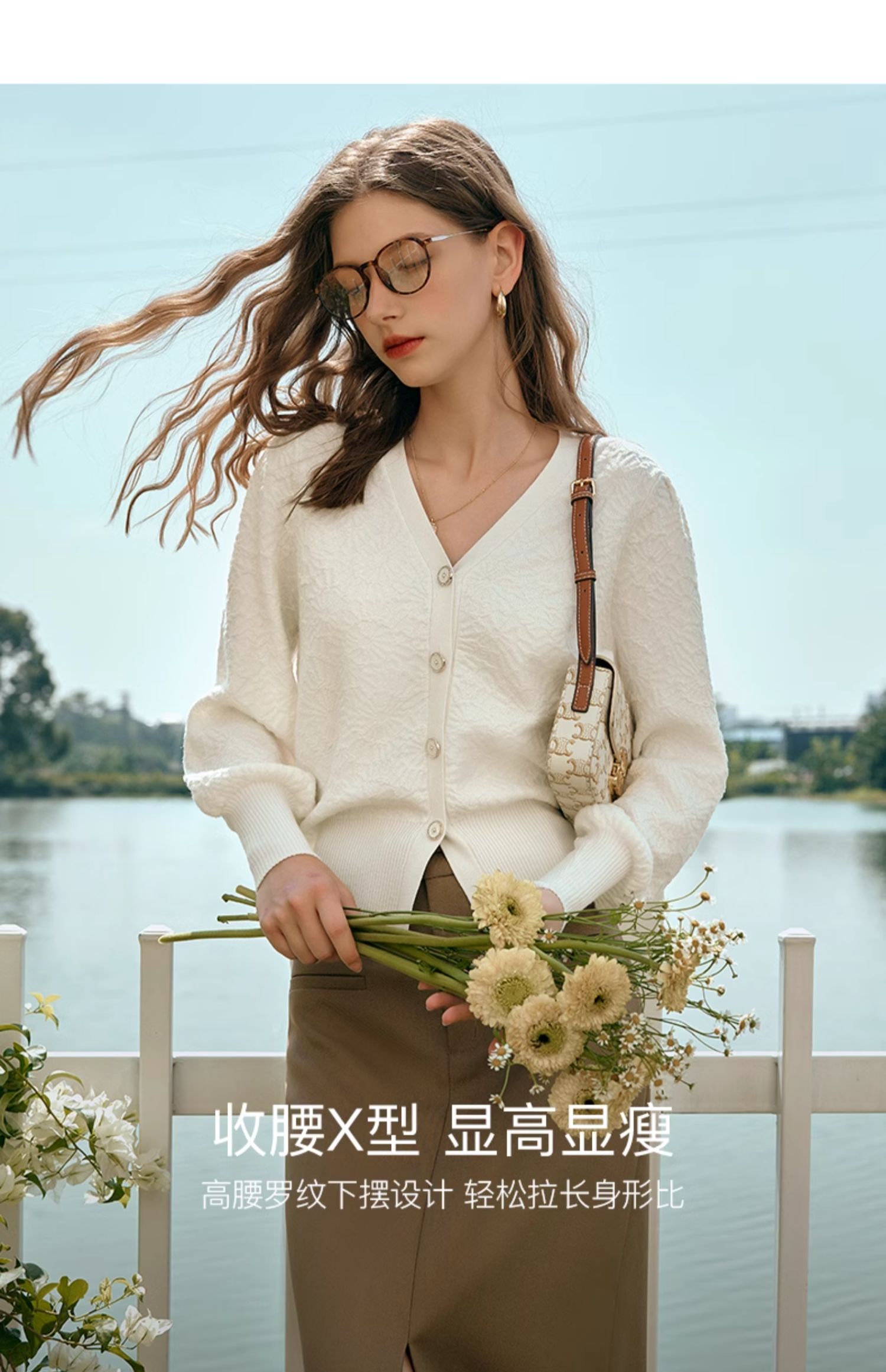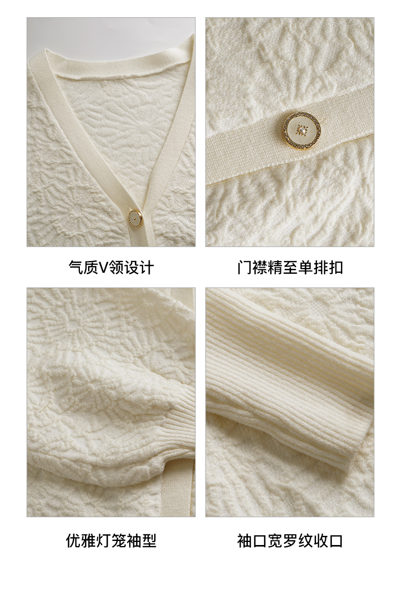 OLrain欧芮儿杏白色针织衫女早春2024年新款优雅暗纹提花开衫毛衣