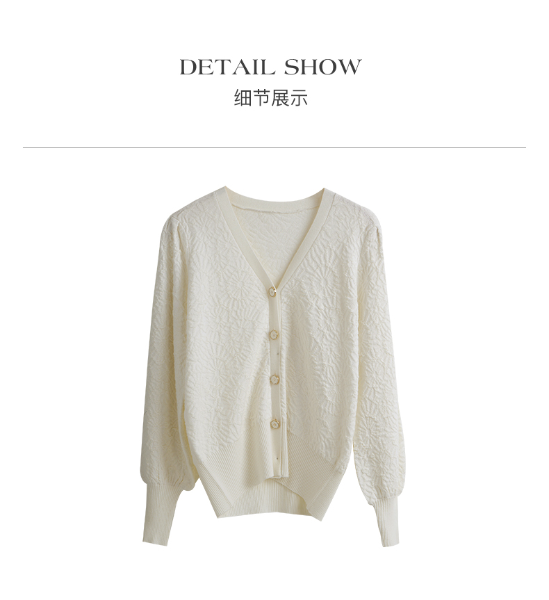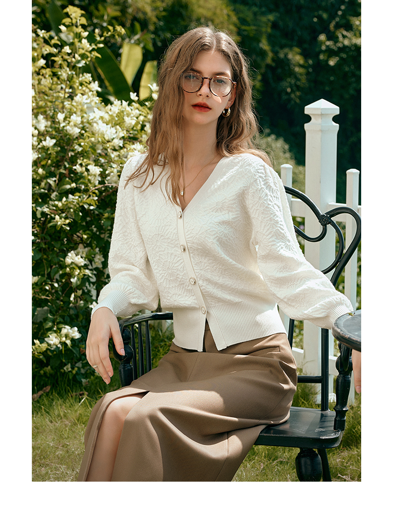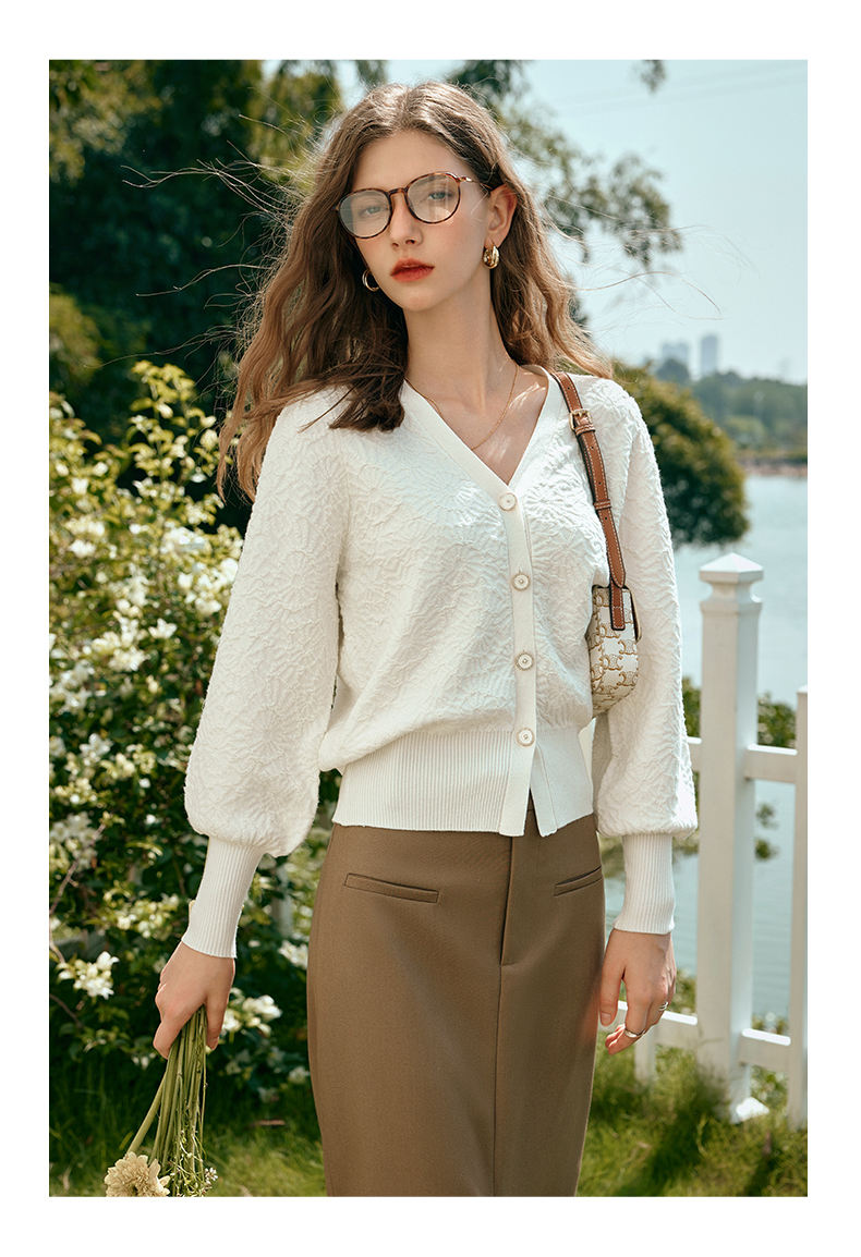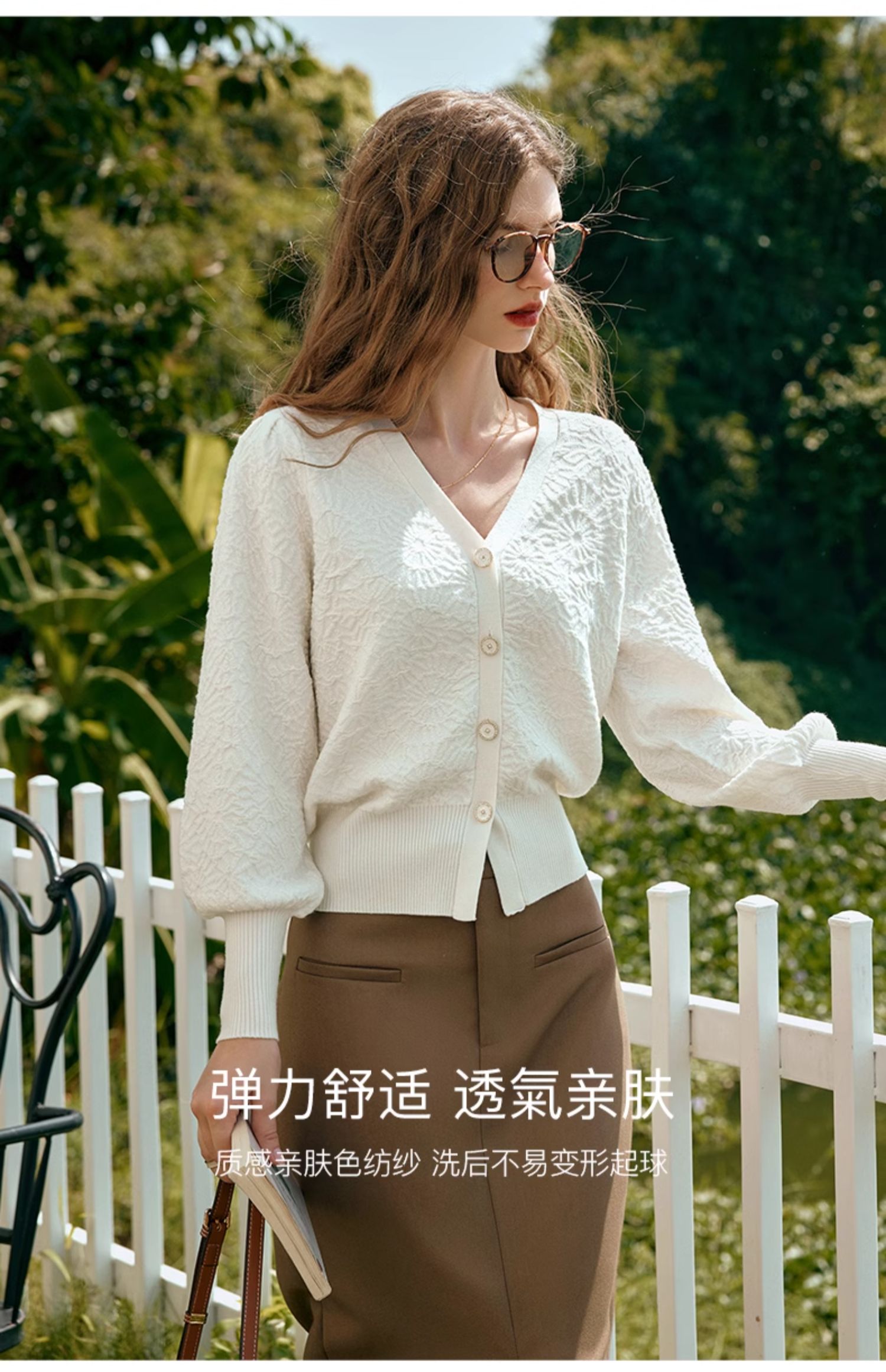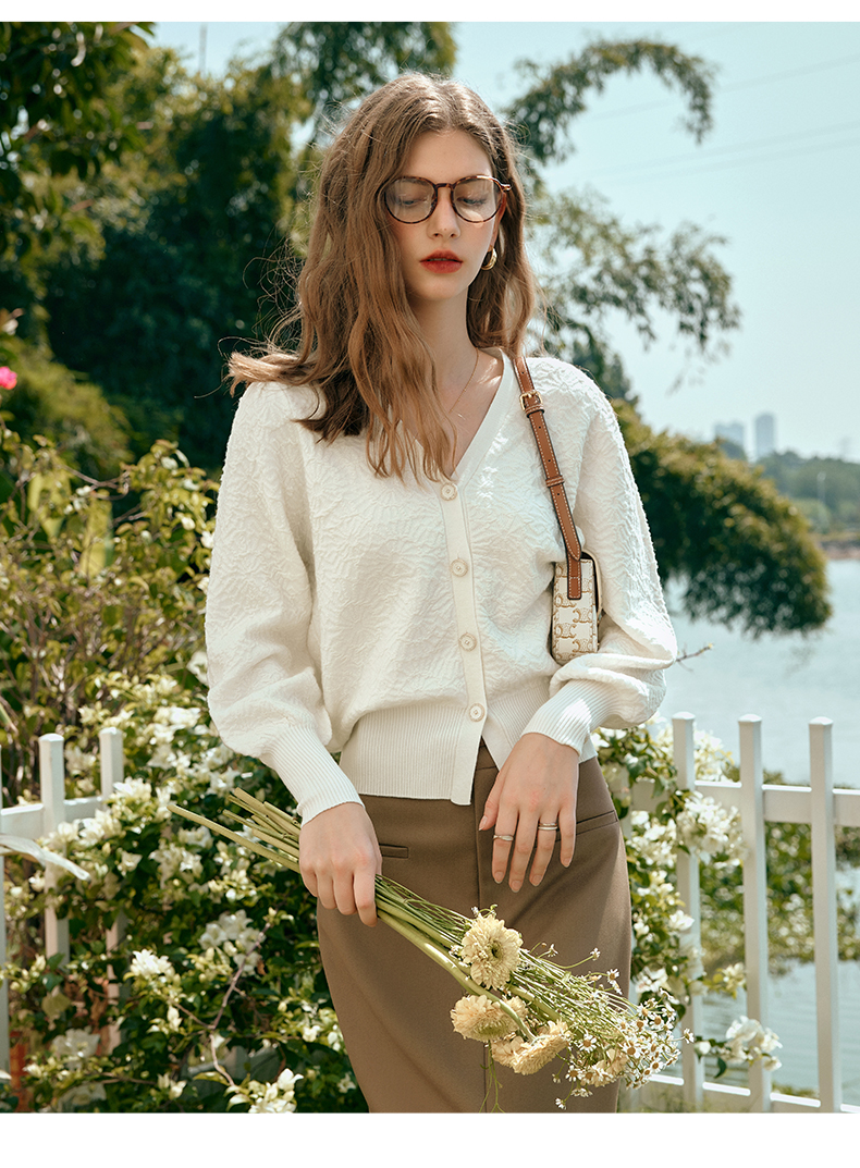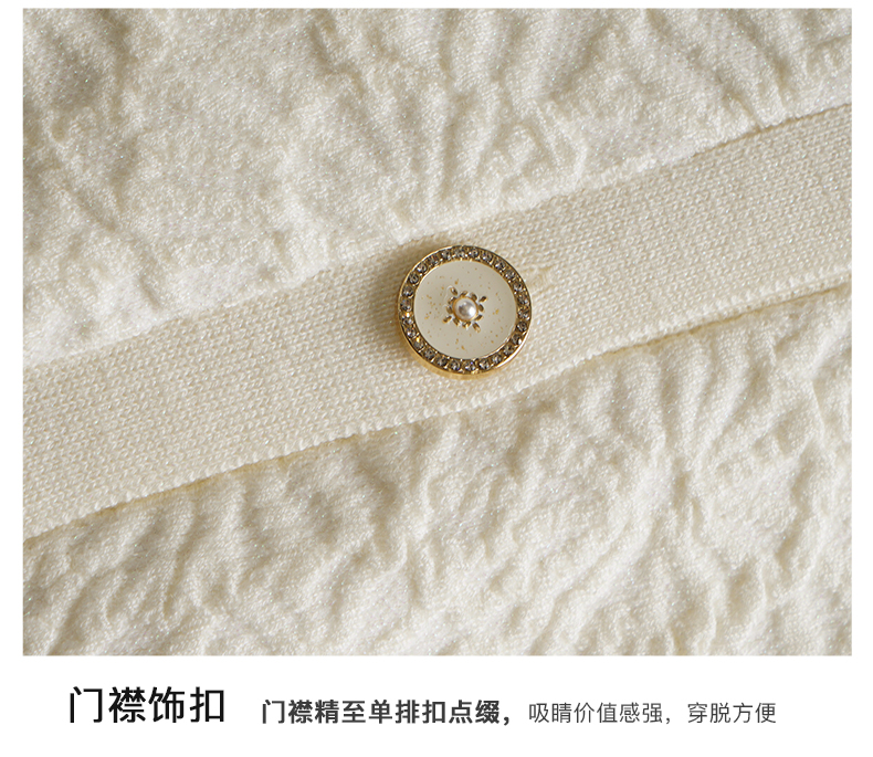 OLrain欧芮儿杏白色针织衫女早春2024年新款优雅暗纹提花开衫毛衣