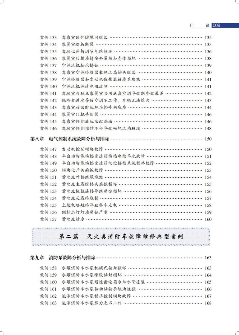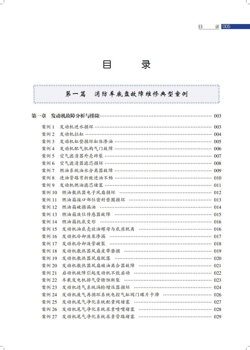 本书共五篇、528个案例,以消防车底盘维修作为全书的开篇,进而分别对灭火类、举高类、专勤类、战保类消防车的维修技术进行了讨论,并将车载消防器材维修作为拓展内容,形成了较为系统的体系。第一篇消防车底盘故障维修典型案例,涵盖了发动机、传动系统、行驶系统、转向系统、制动系统、取力器系统、驾乘室和电气控制系统等关键总成的维修案例157个;第二篇灭火类消防车故障维修典型案例,重点介绍了消防泵、管路与阀门、灭火剂容罐、消防炮及水枪系统、乘员室及器材厢、照明与警报系统、电气系统与控制系统等上装部分维修案例119个;第三篇举高类消防车故障维修典型案例,侧重介绍了支腿系统、转台系统、臂架(梯架)系统、工作斗(滑车)系统、消防系统、液压系统、电气系统与控制系统等重要系统总成的维修案例138个;第四篇专勤类和战保类消防车故障维修典型案例,涉及抢险救援消防车、供气消防车、供液消防车、排烟消防车、远程供水消防车、消防摩托车及消防机器人等车辆装备维修案例34个;第五篇车载消防器材故障维修典型案例,包括灭火器具、抢险救援器具、防护器具等消防器材维修案例80个。本书还对同批次同类型和不同批次同类型装备的相似维修案例进行了合并,使内容更加精练、准确,提高了使用人员检索、查询的效率。