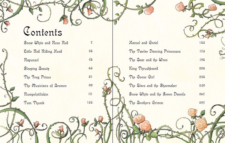 This is a wonderful collection of stories from the famous collectors of fairytales, "The Brothers Grimm". Stories include: "The Frog Prince", "Rapunzel", "Hansel and Gretel", "Little Red Riding Hood", "The Bremen Town Musicians", "Tom Thumb", "The Elves and the Shoemaker", "Sleeping Beauty", "Snow White and the Seven Dwarves", "Rumpelstiltskin", "The Goose Girl", "The Bear and the Wren", "The Twelve Dancing Princesses" and "Snow White and Rose Red". It also includes a short biography of the brothers themselves.