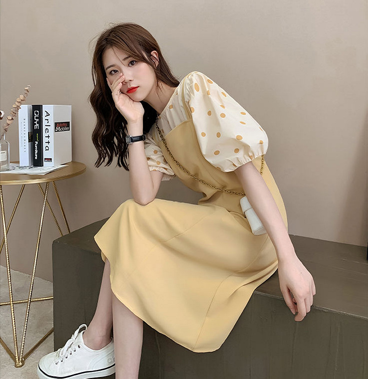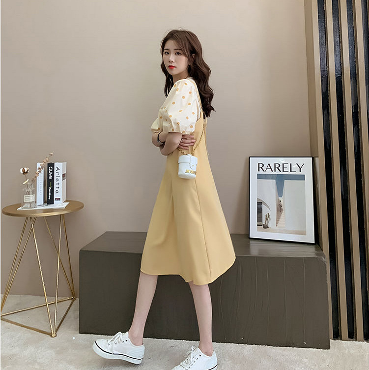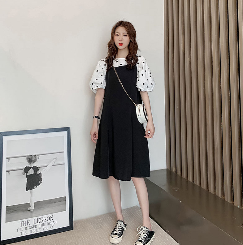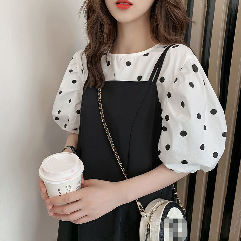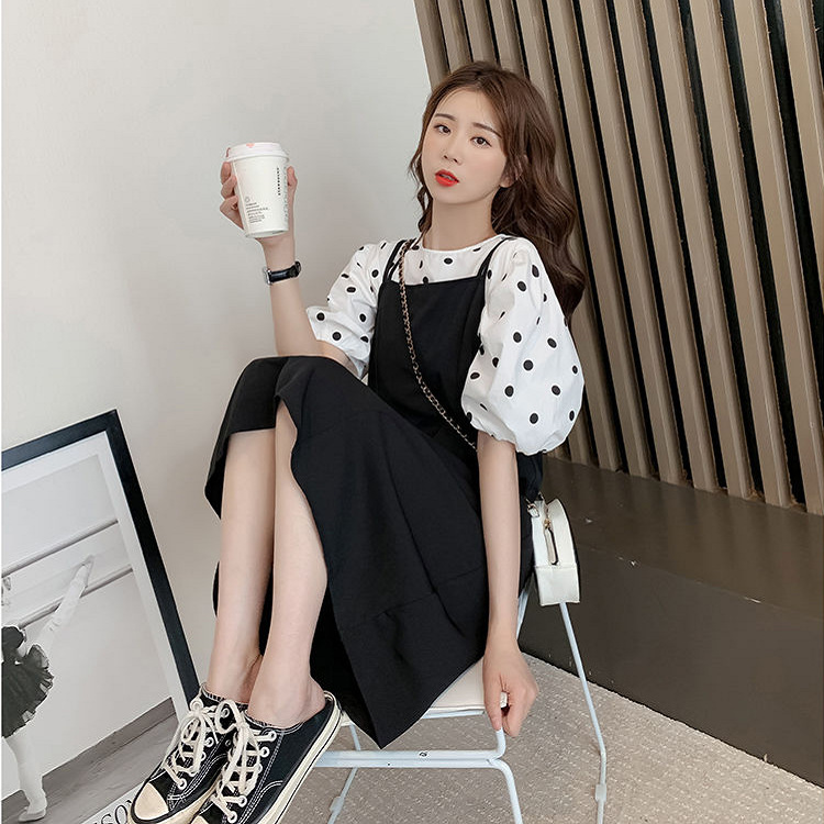 (清仓现货)【社群供X】韩版宽松百搭波点上衣+显瘦背带裙套装2